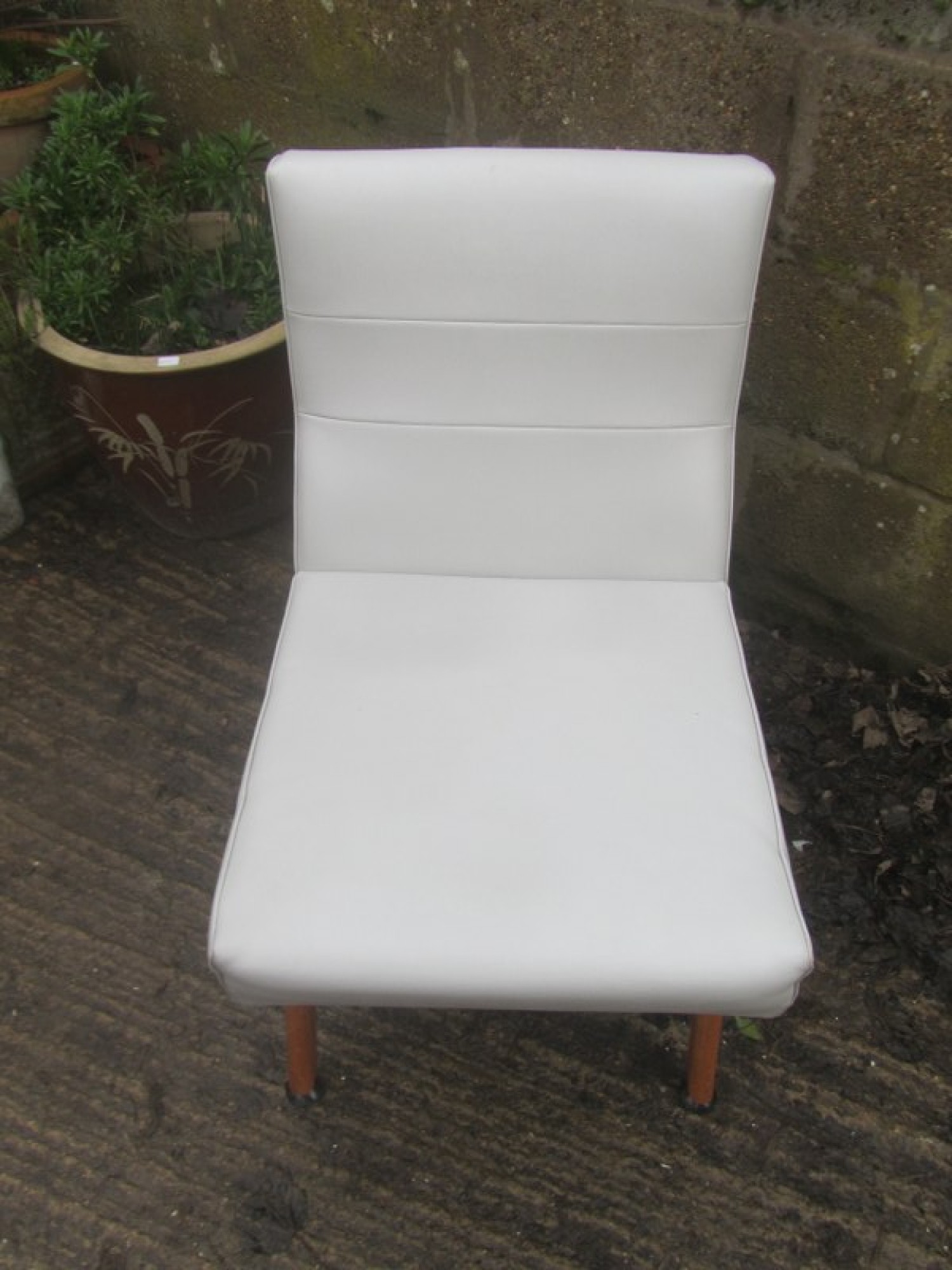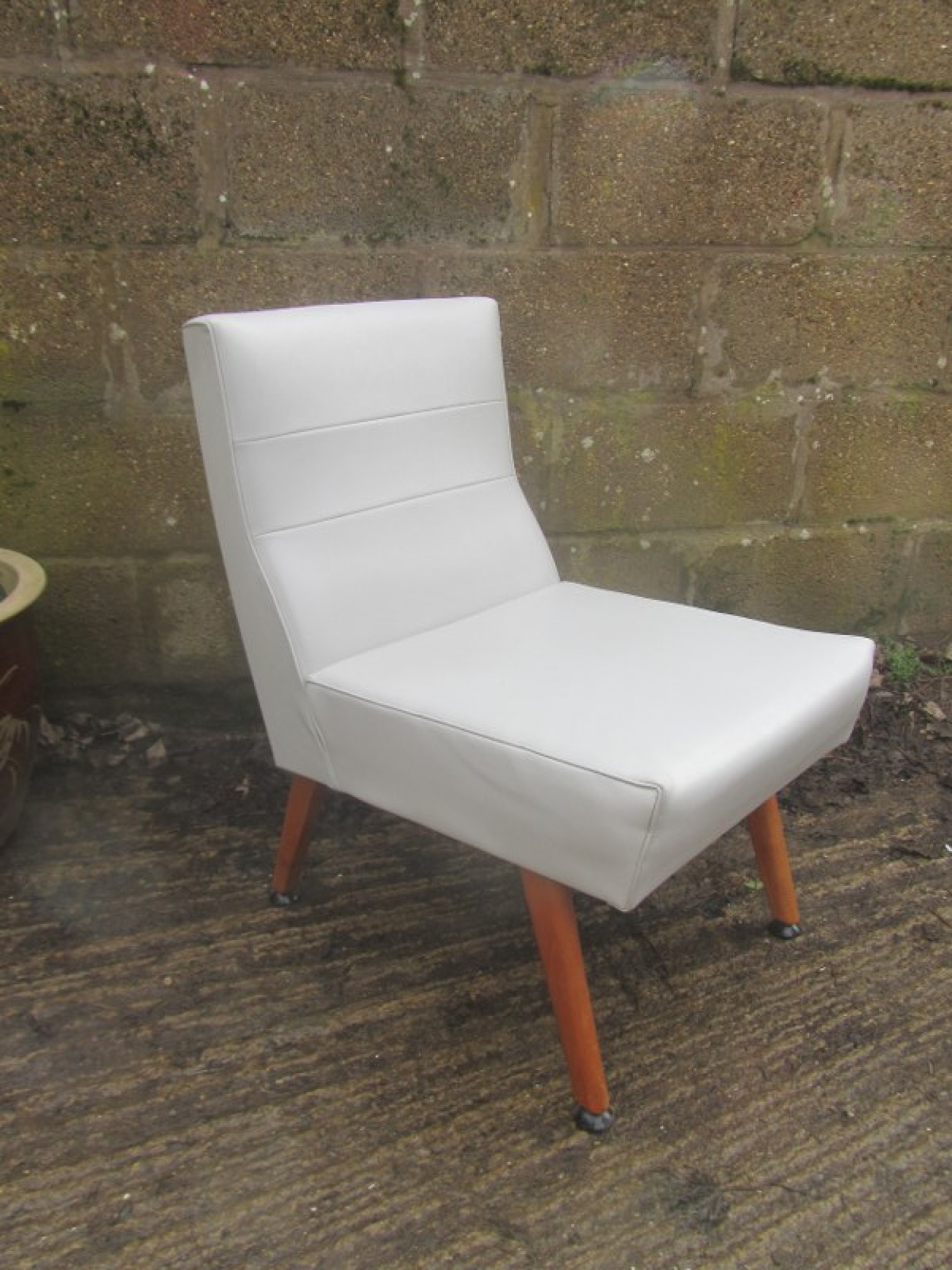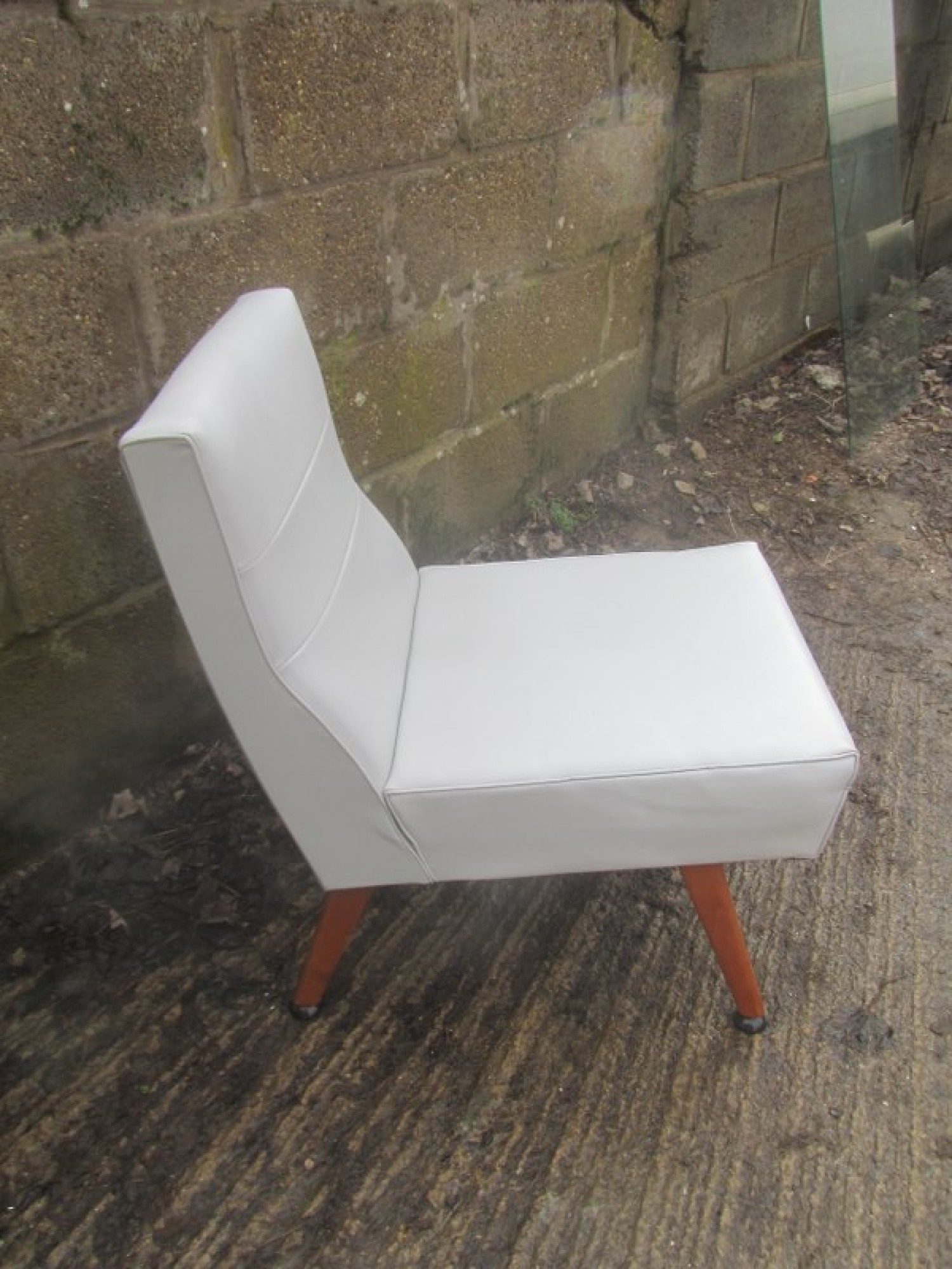THIS IS A LOW BEDROOM CHAIR. A STURDY SIMPLE CHAIR. GREY VINYL SEAT, NOT ORIGINAL. A GREAT PIECE FOR ANYWHERE IN THE HOME. IN GOOD CONDITION, SOME LIGHT MARKS. SEAT HEIGHT IS 43cm. ONE LEG HAS BEEN REPAIRED.