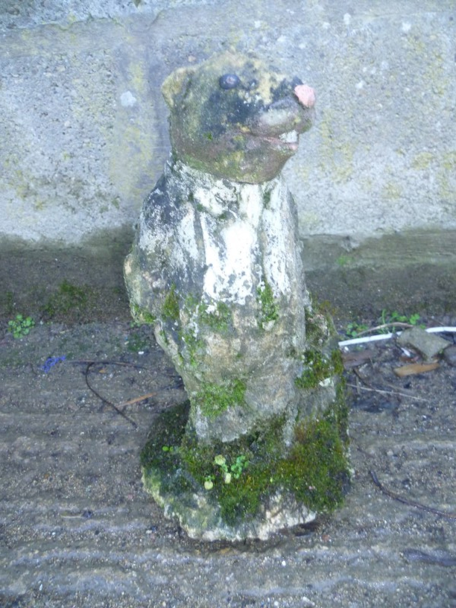 A CAST STONE ORNAMENT FOR THE GARDEN. IT HAS BEEN OUTSIDE FOR YEARS, IT HAS A WEATHERED LOOK. NATURALLY WORN.