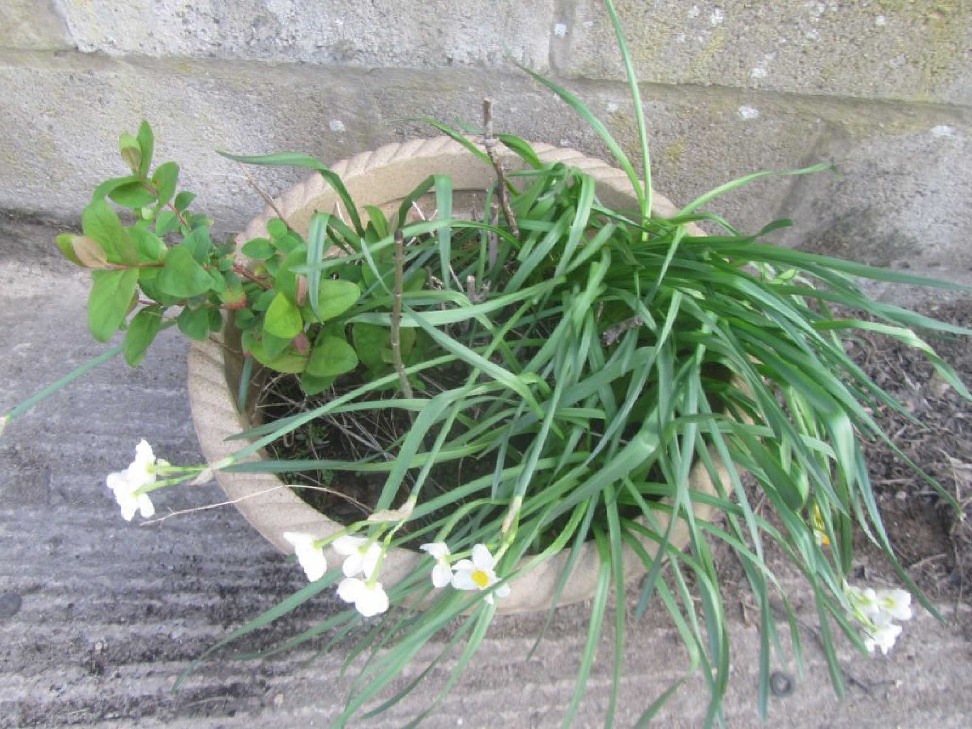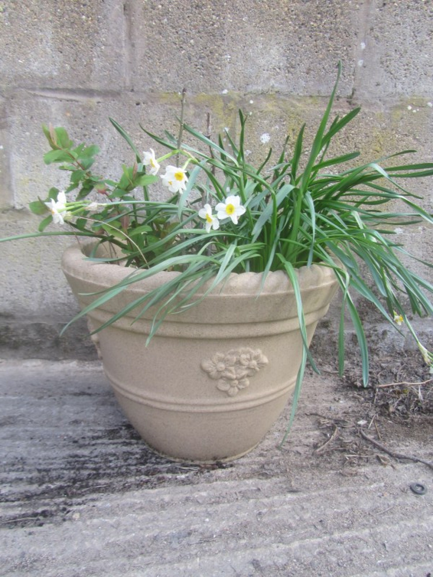 A CAST STONE EFFECT PLANTER FOR THE GARDEN, MADE FROM PLASTIC, WITH PLANTS.