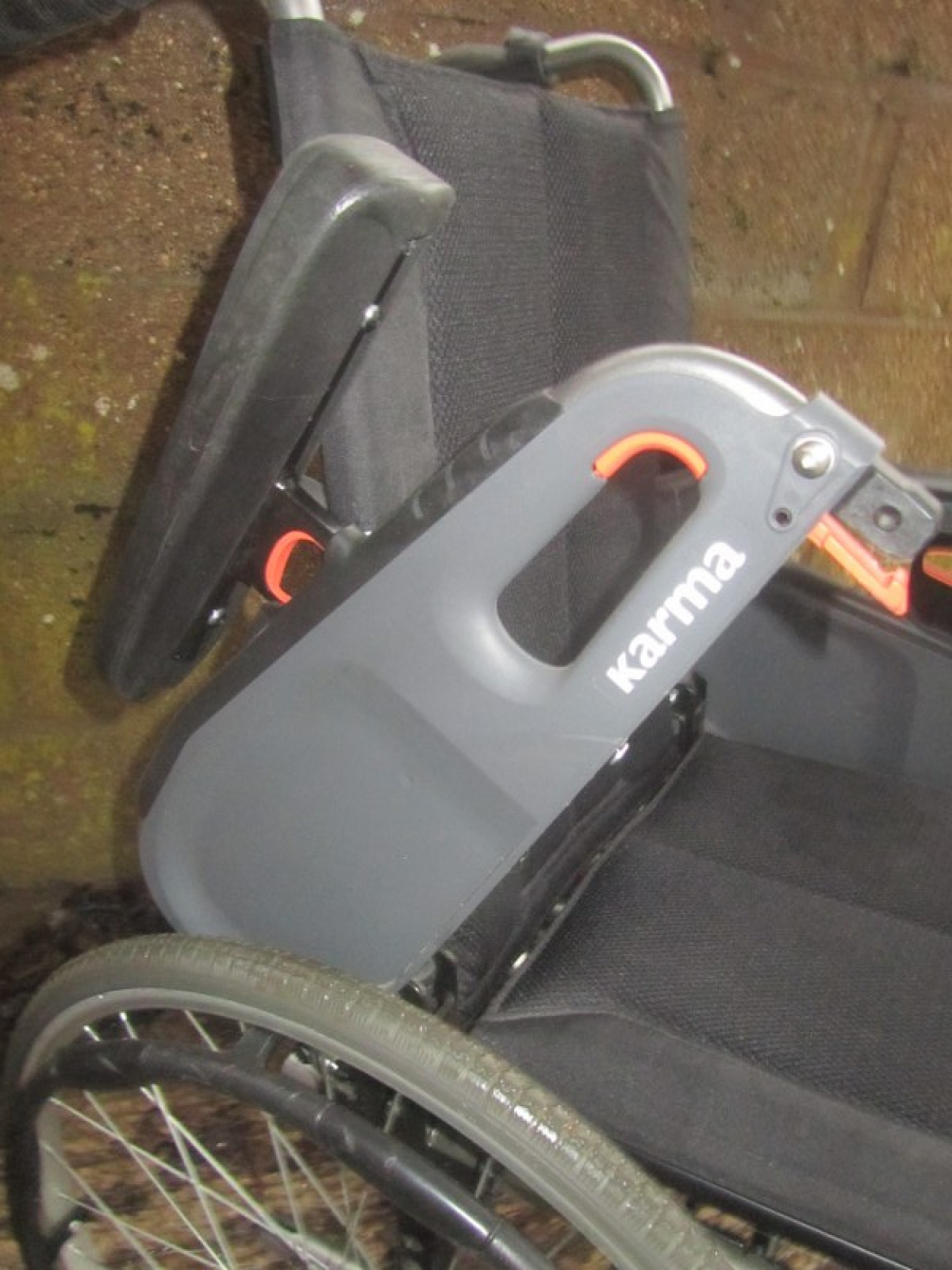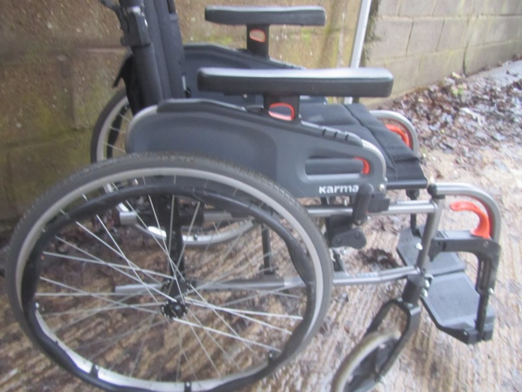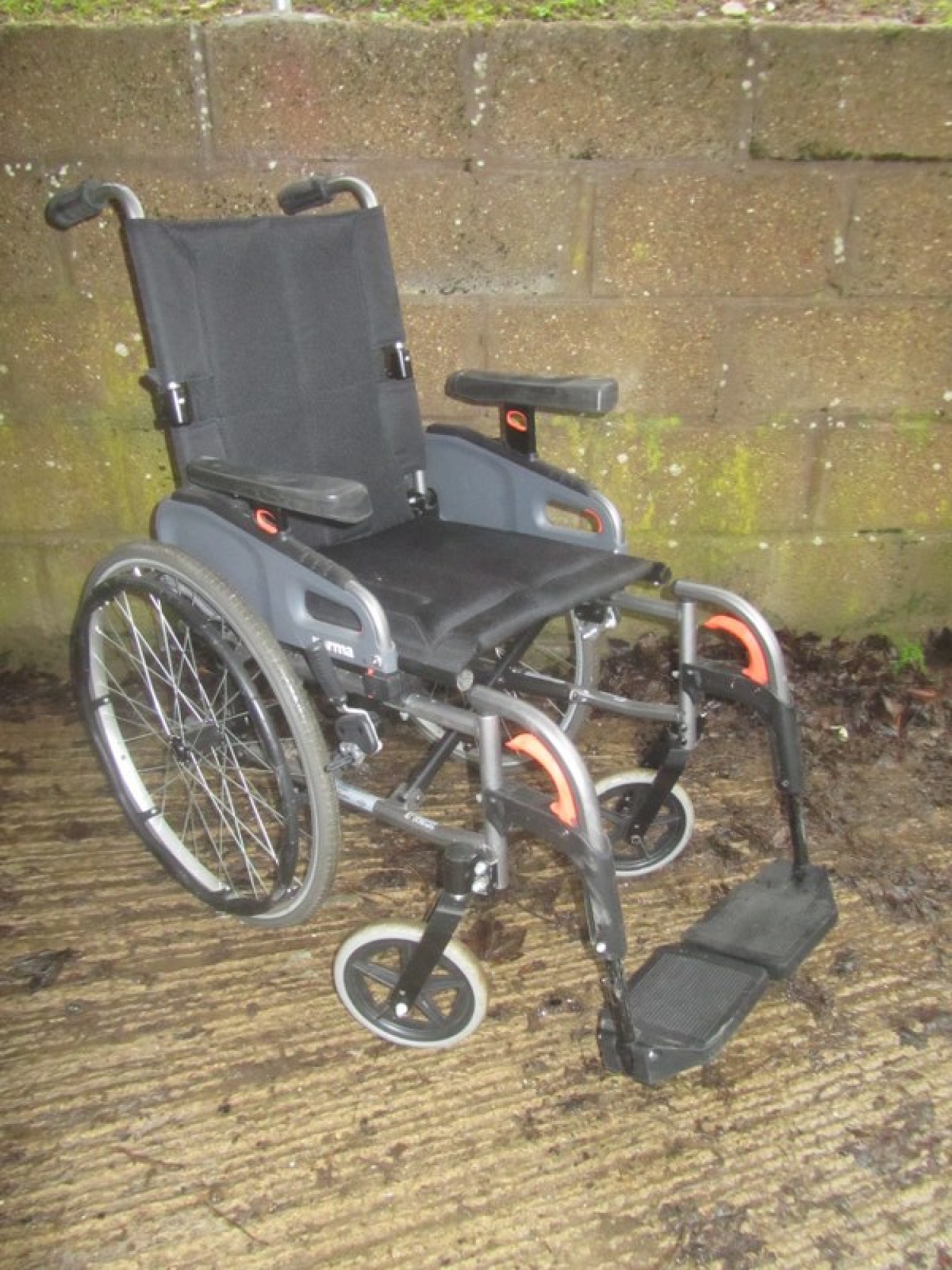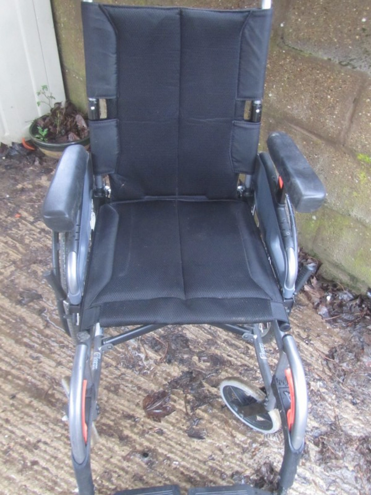 A COLLAPSABLE WHEEL CHAIR WITH FOOT RESTS. IN GOOD CONDITION. EASILY FOLDS FLAT TO FIT IN A CAR. THE FOOT SUPPORTS WILL LIFT OFF. SELF PROPELLED.