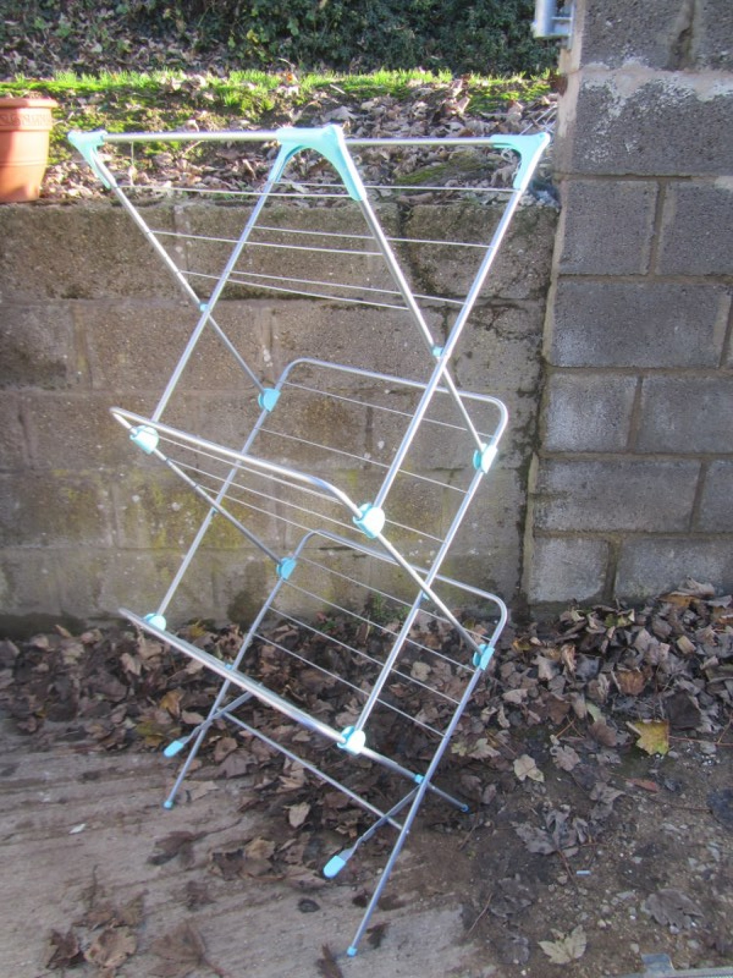 A MODERN METAL CLOTHES AIRER, GREAT FOR DRYING CLOTHES. FOLDS FLAT FOR EASY STORAGE.