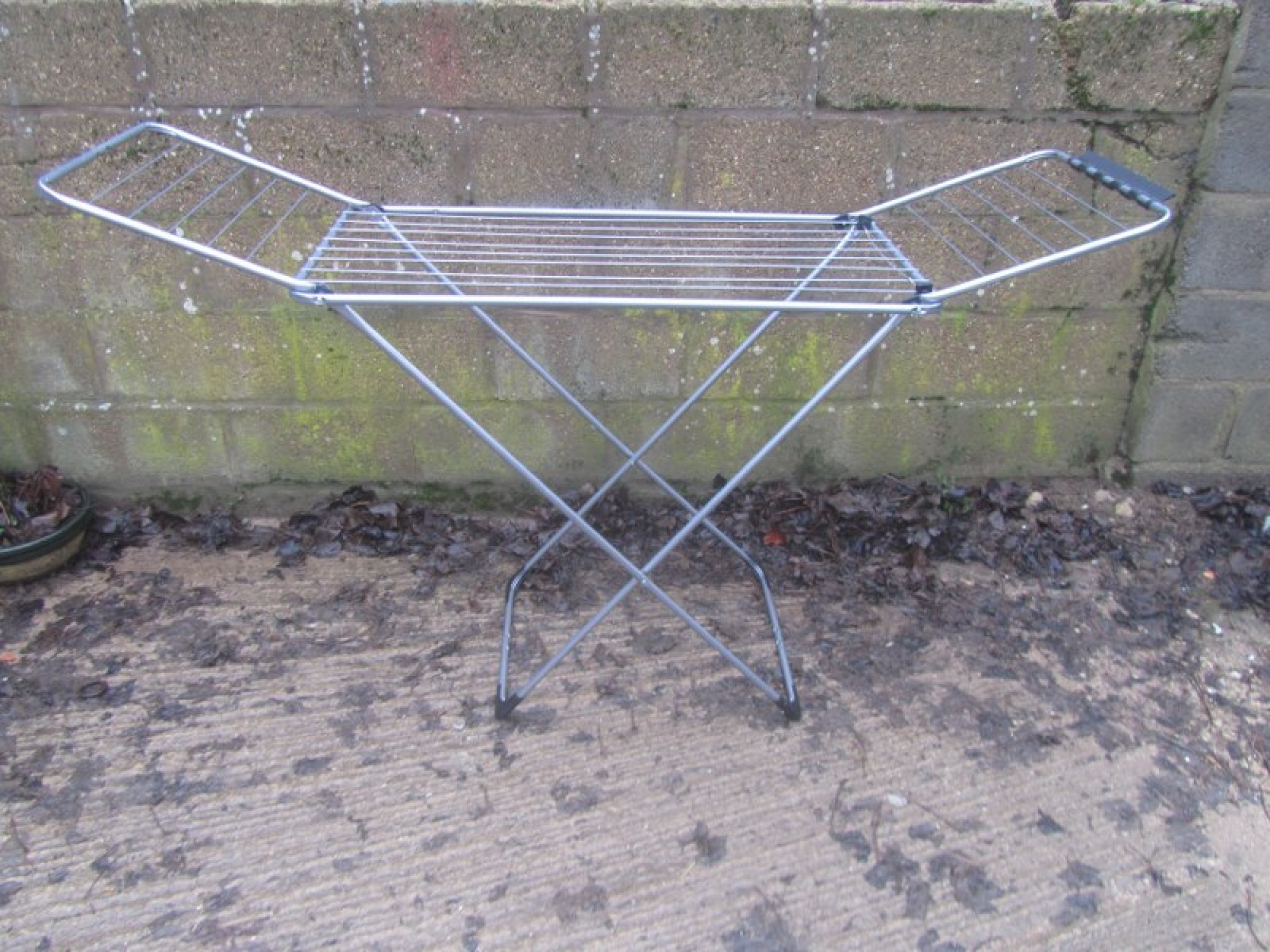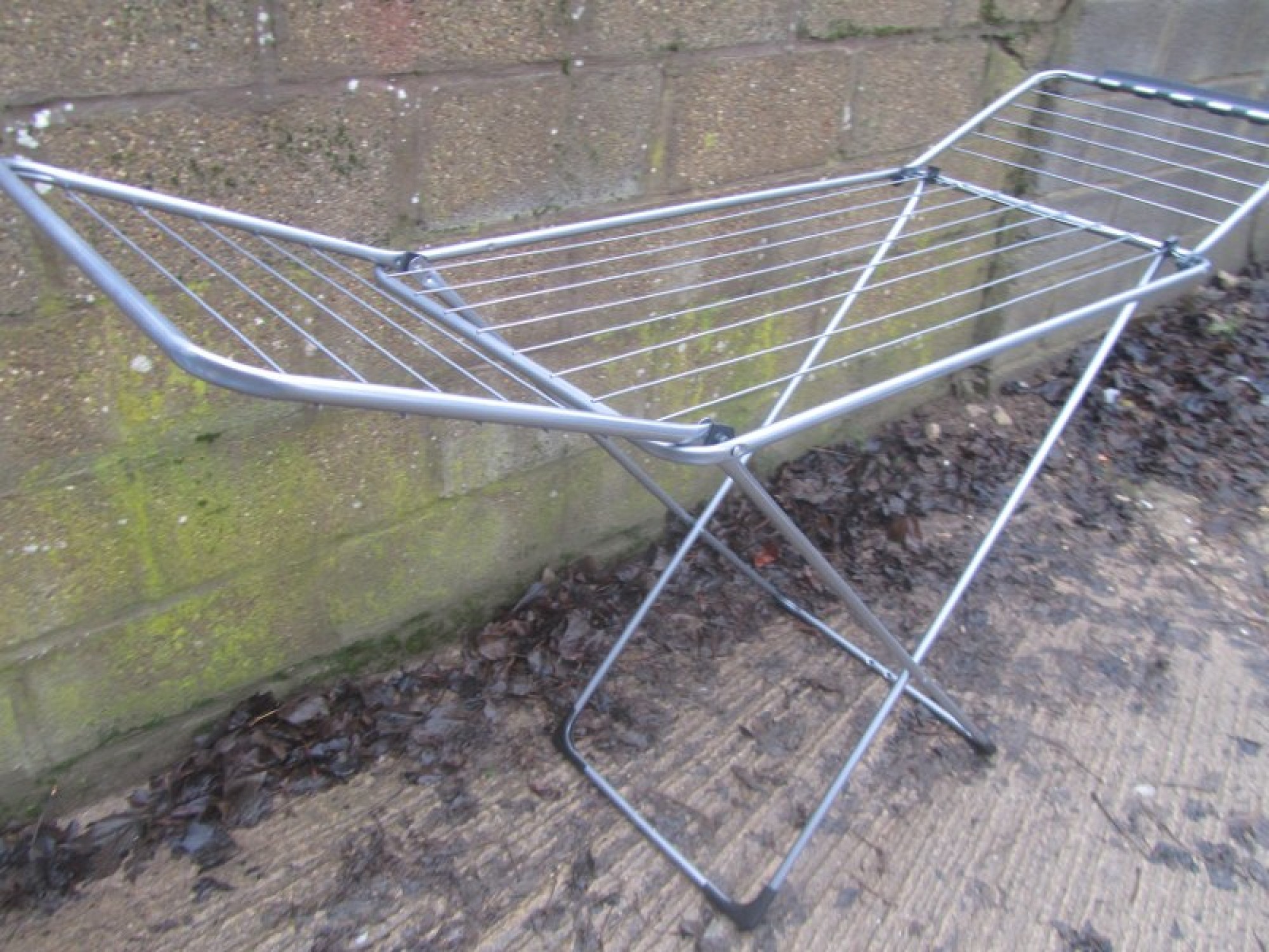 A MODERN METAL CLOTHES AIRER, GREAT FOR DRYING CLOTHES. EXTRA PANELS EACH SIDE. FOLDS FLAT FOR EASY STORAGE.