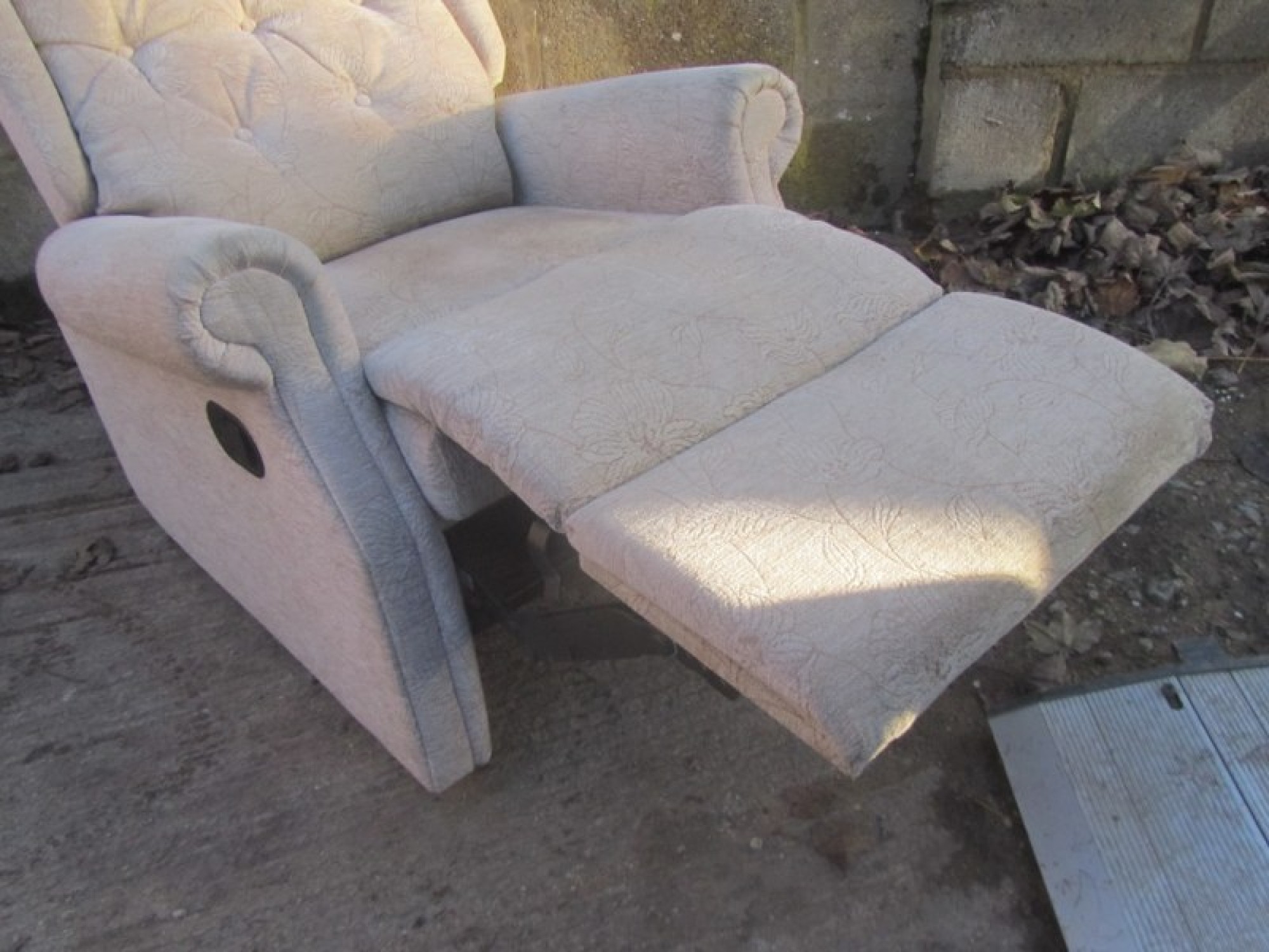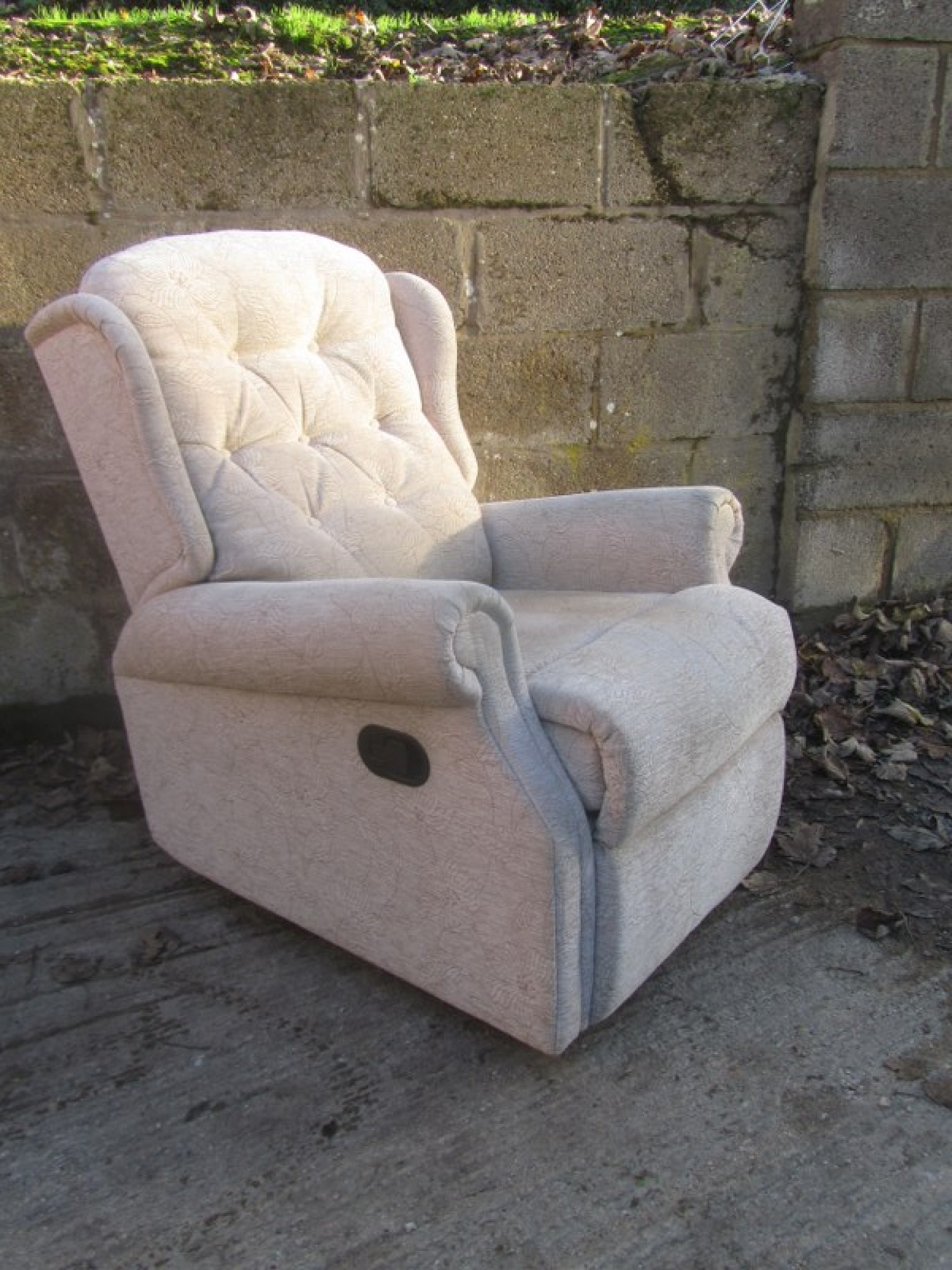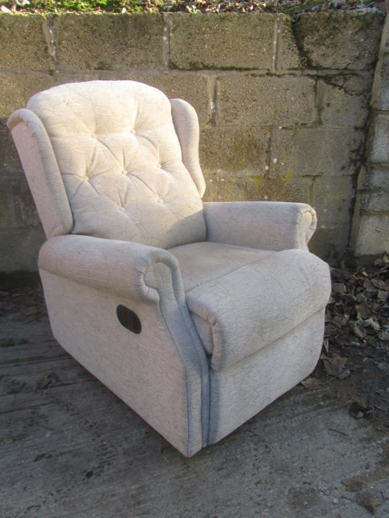 THIS IS A MANUAL RECLINING ARMCHAIR. AVERAGE CONDITION. SOME LIGHT WEAR AND FADING.