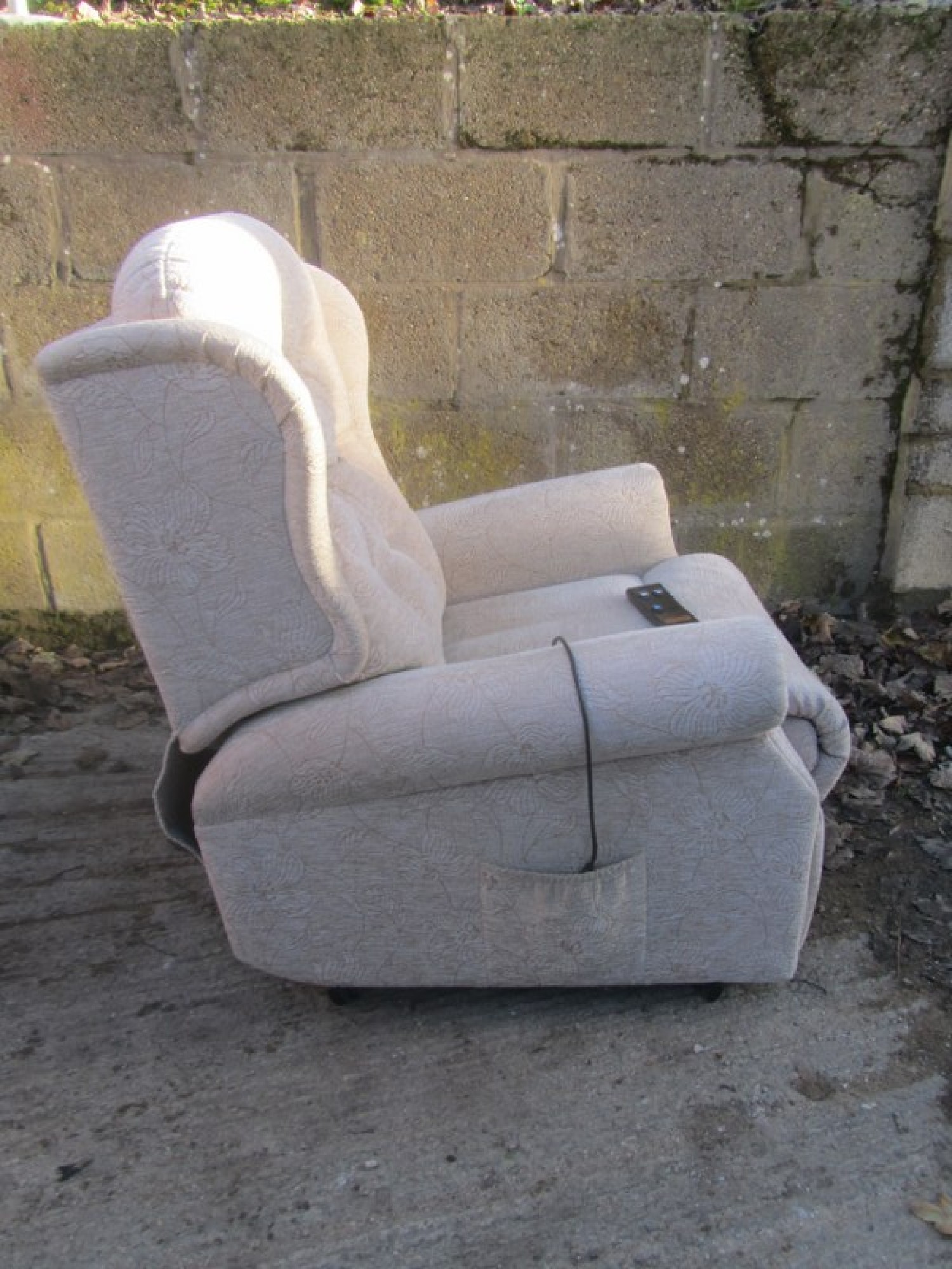 THE ARMCHAIR HAS A HAND HELD CONTROL. THE BACK REST WILL RECLINE, AND THE FOOT REST LIFTS UP INTO A RELAXING RECLINED POSITION. THE MECHANISM ALL WORKS WELL. IT COMES WITH POWER LEAD & CONTROLLER. FROM A SMOKE & PET FREE HOME. SEAT HEIGHT IS 47cm.