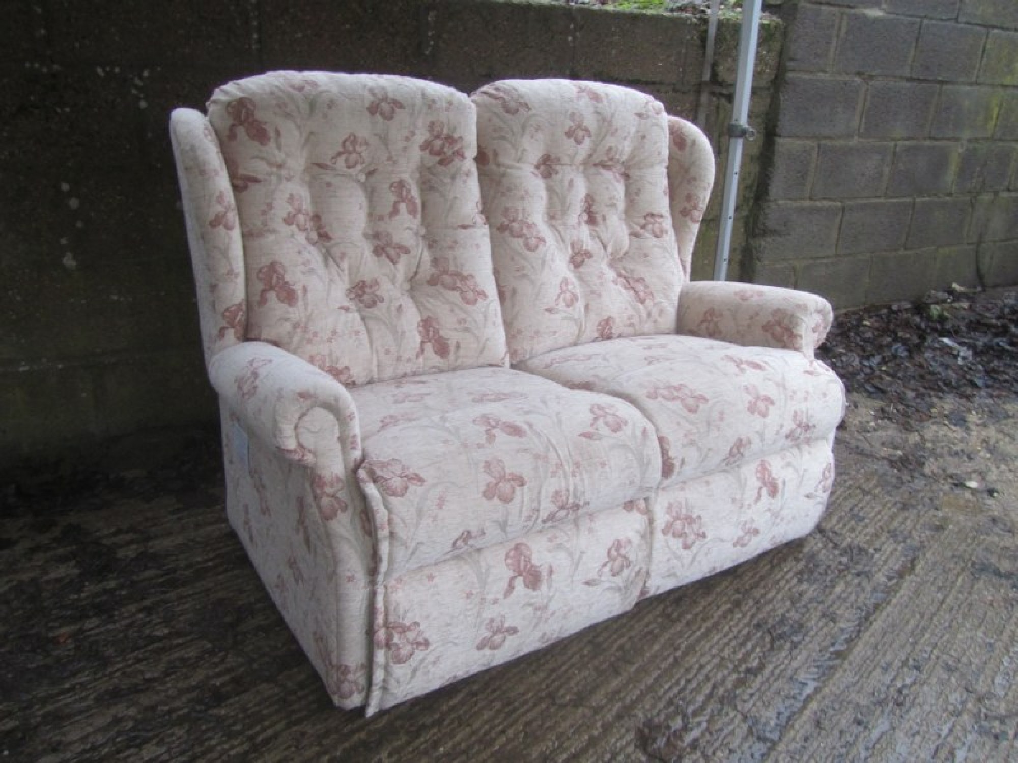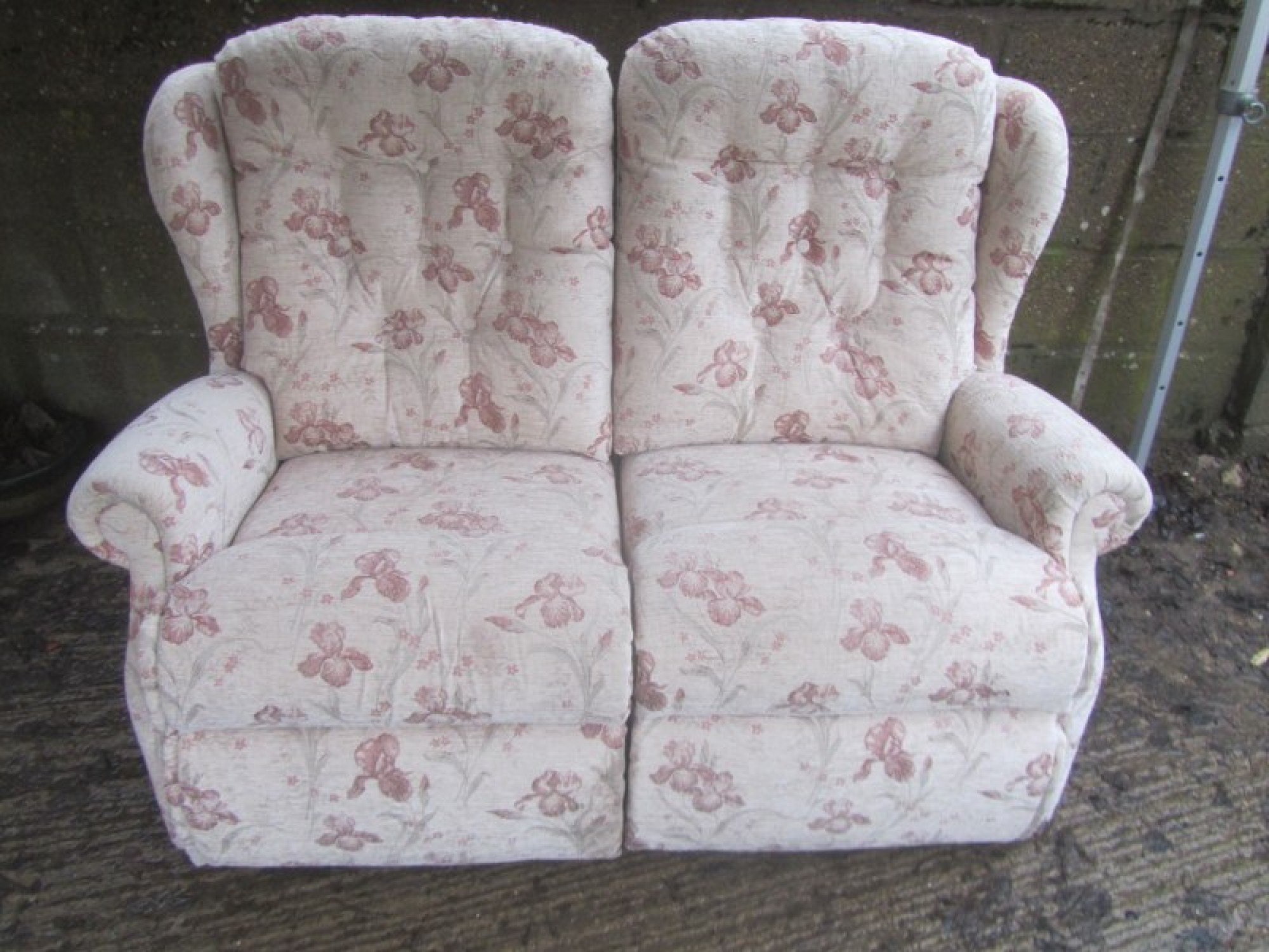 THIS IS A QUALITY 2 SEATER SOFA MADE BY 'SHERBOURNE'. GOOD CONDITION. HARDLY USED. GOOD CLEAN SOFA, FROM A SMOKE FREE & PET FREE HOME. COVERED IN CREAM COLOURED FLORAL MATERIAL. IT COMES IN 2 PARTS FOR EASY TRANSPORT.