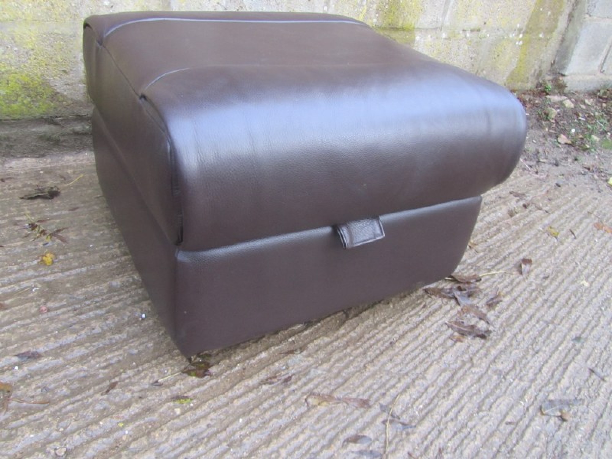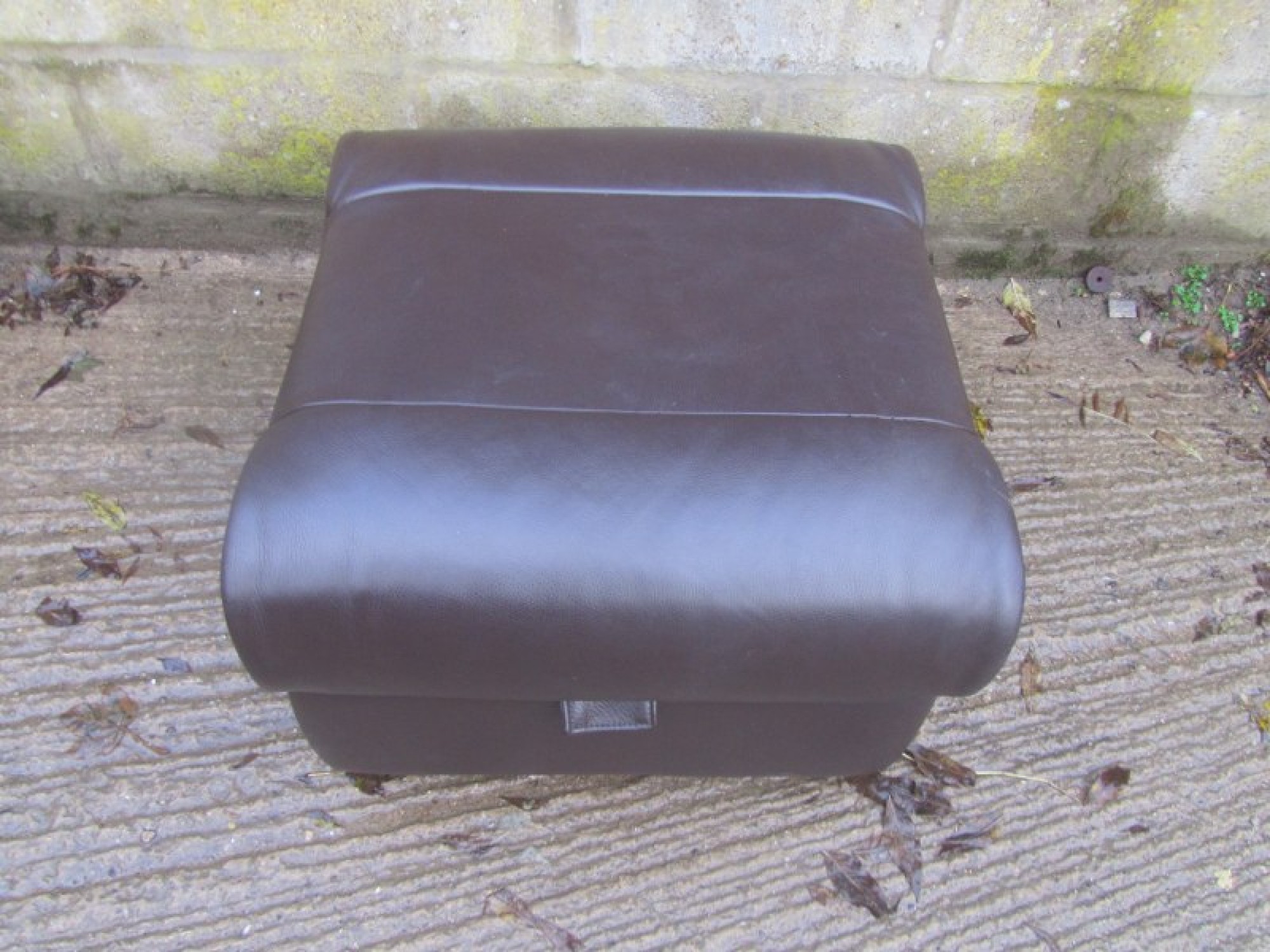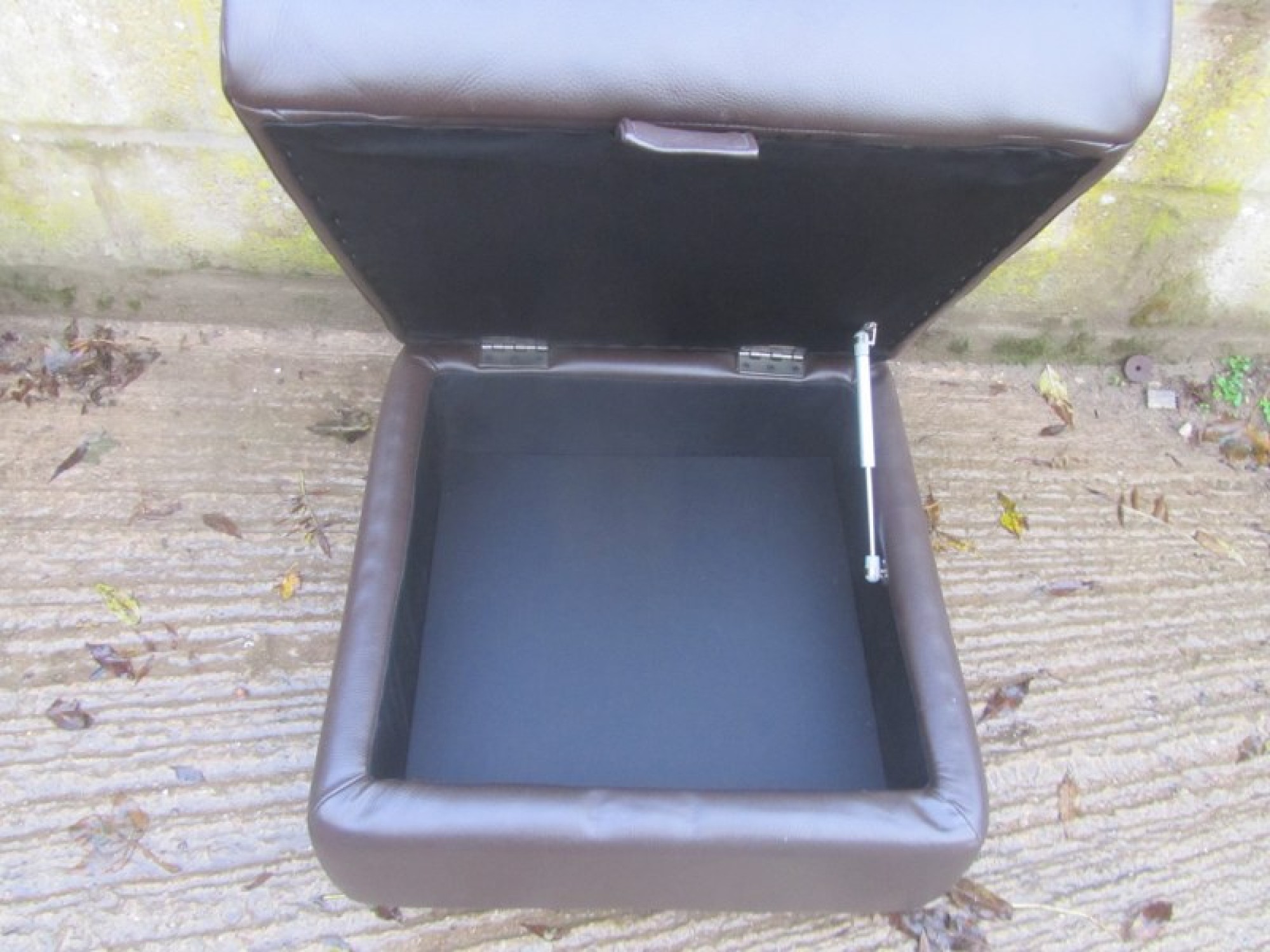 THIS IS A FOOT STOOL IN BROWN LEATHER. A STRONG AND STURDY FOOT STOOL / POUFFE, THE TOP IS SOFT AND COMFORTABLE FOR FEET OR AS A SEAT. IN GOOD CLEAN CONDITION. LIFT UP LID WITH STORAGE INSIDE.