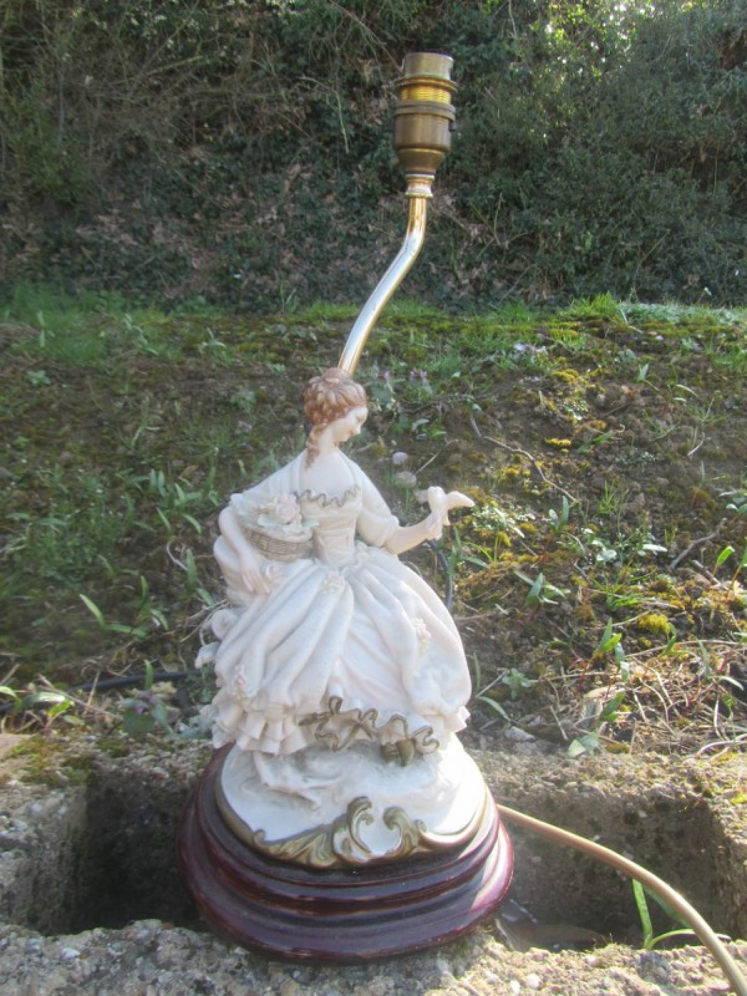 AN ATTRACTIVE TABLE LAMP, IT IS ON A WOODEN BASE WITH A POTTERY LADY. TAKES A STANDARD BAYONET BULB.