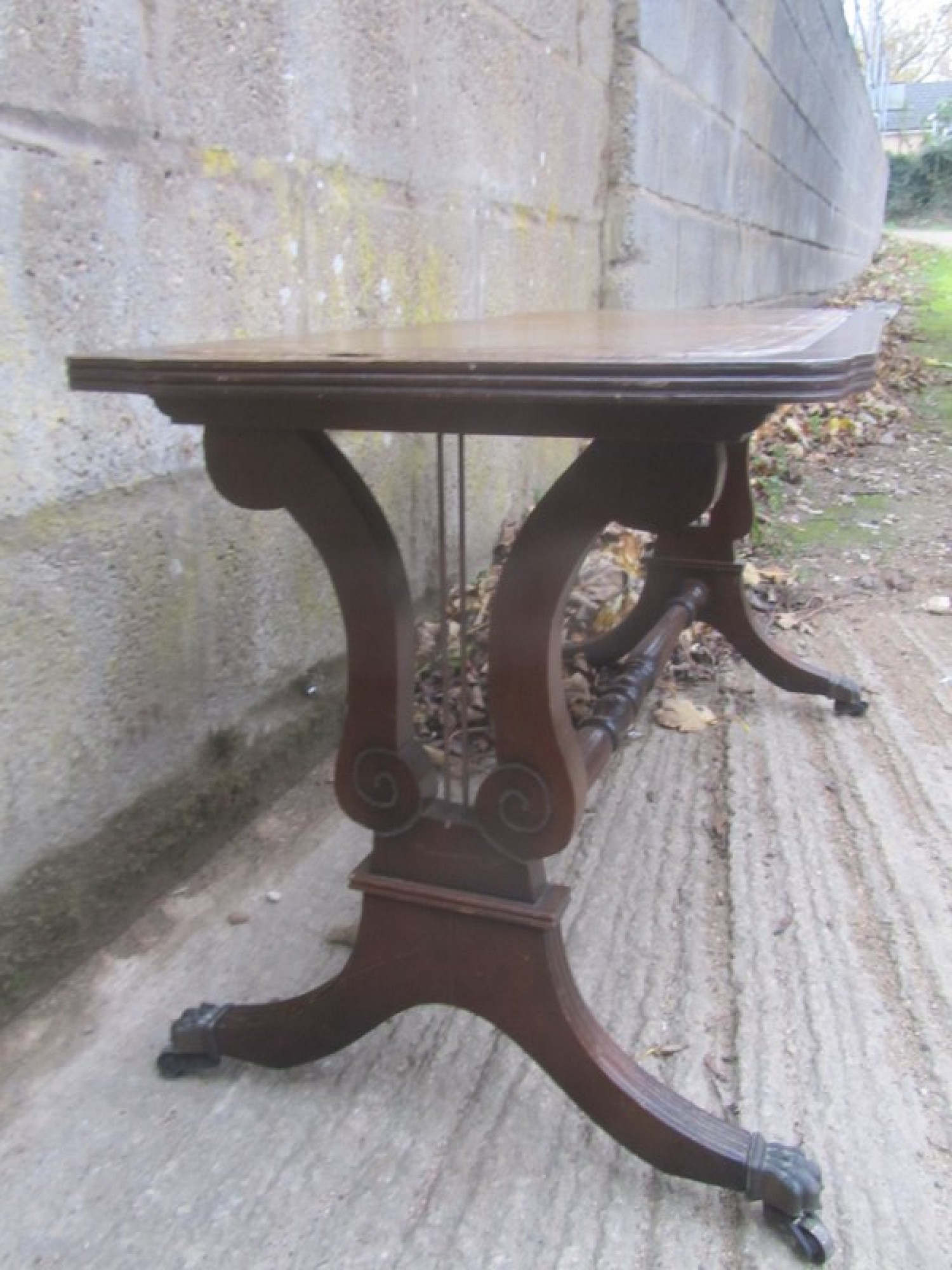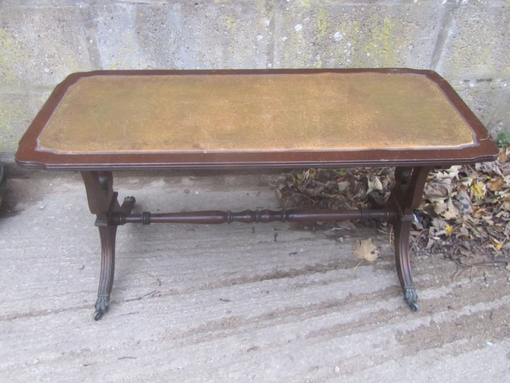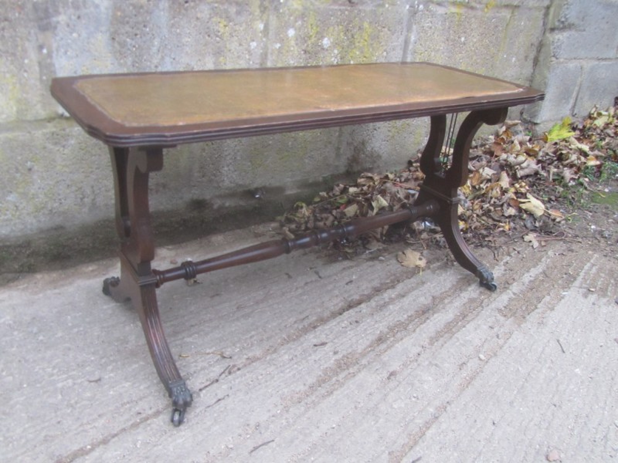 THIS IS A COFFEE TABLE IN A GEORGIAN REGENCY STYLE. IN A MAHOGANY VENEER, THE FRAME IS STRONG AND STURDY. GOOD QUALITY. LEATHER EFFECT TOP, THE TOP HAS LIFTED SLIGHTLY.