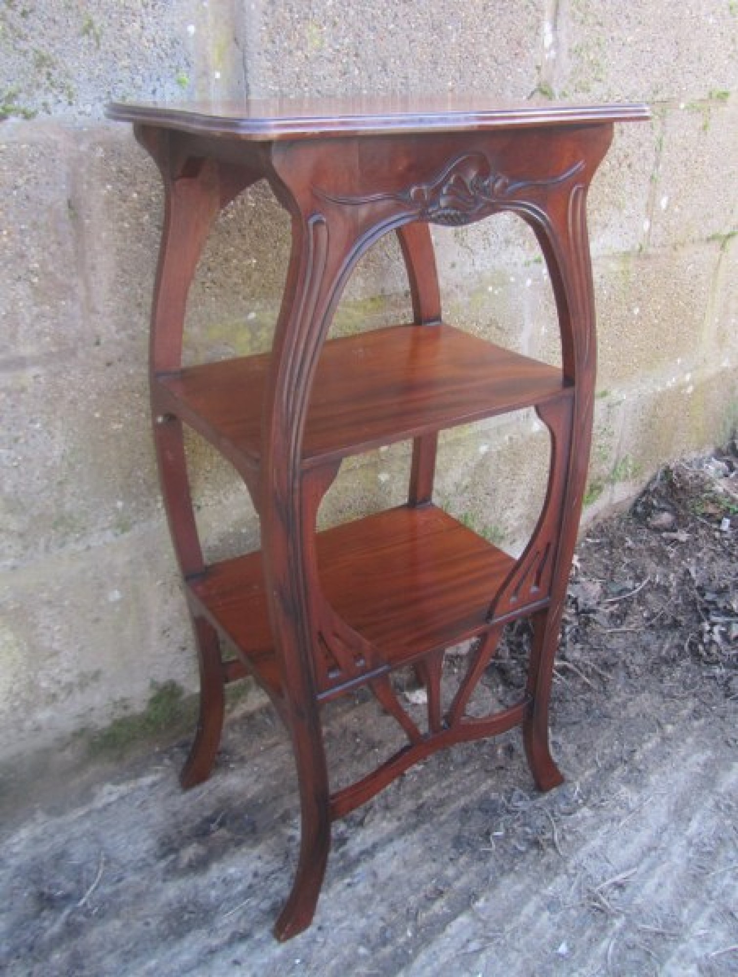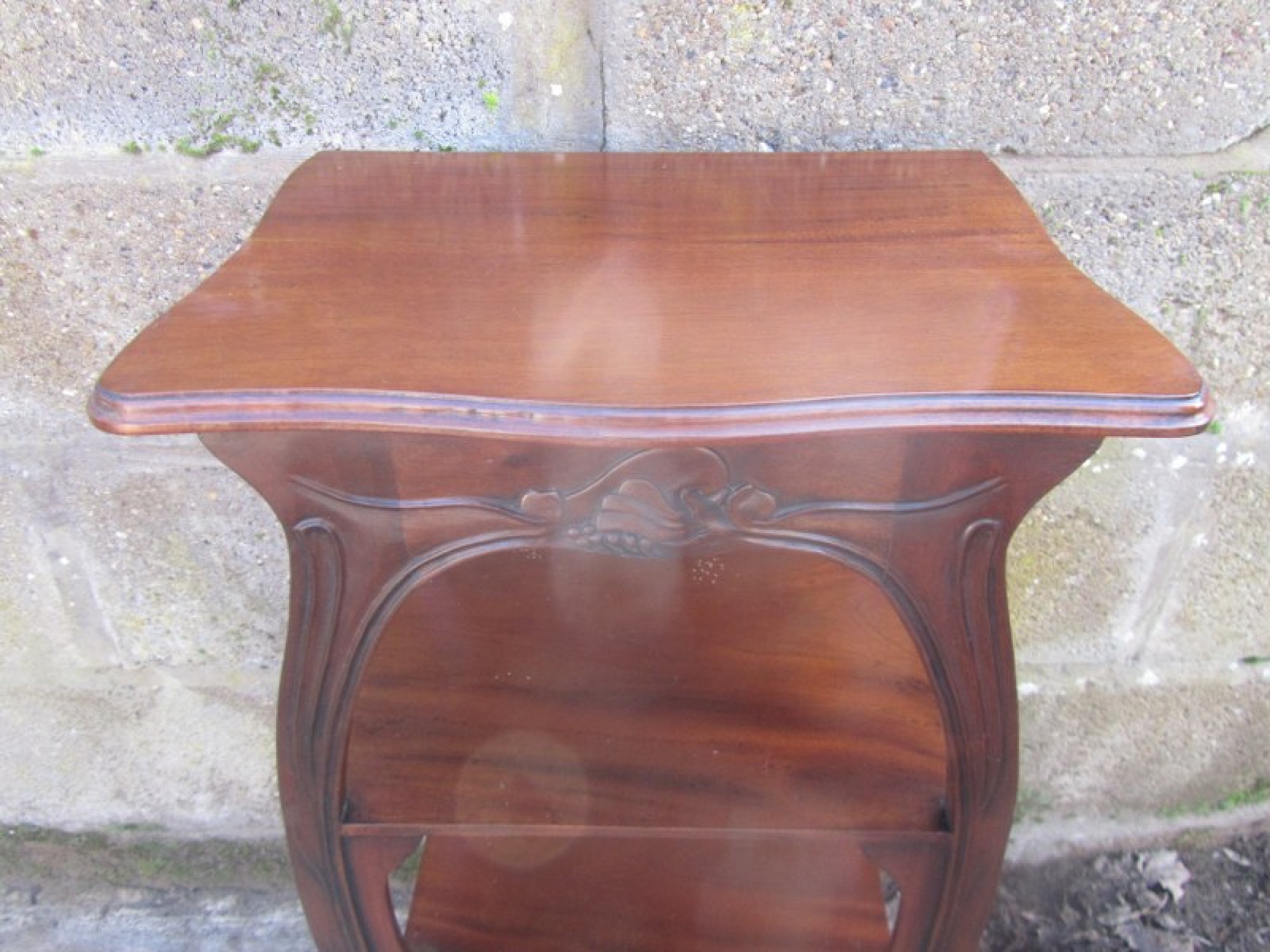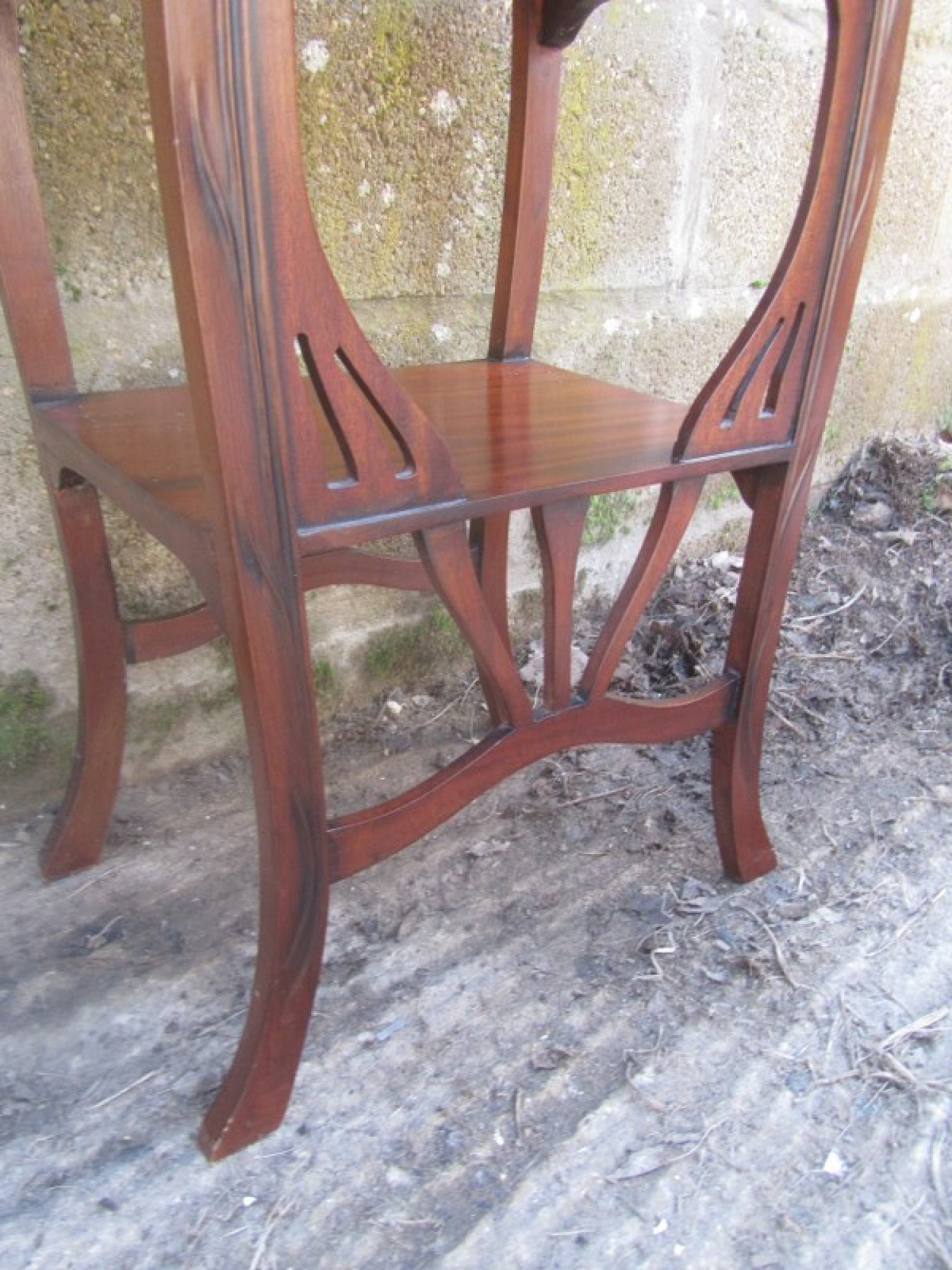 THIS IS A TALL TABLE IN AN ANTIQUE ART NOUVEAU STYLE. IN A MAHOGANY COLOURED WOOD, THE FRAME IS STRONG AND STURDY. GOOD QUALITY.