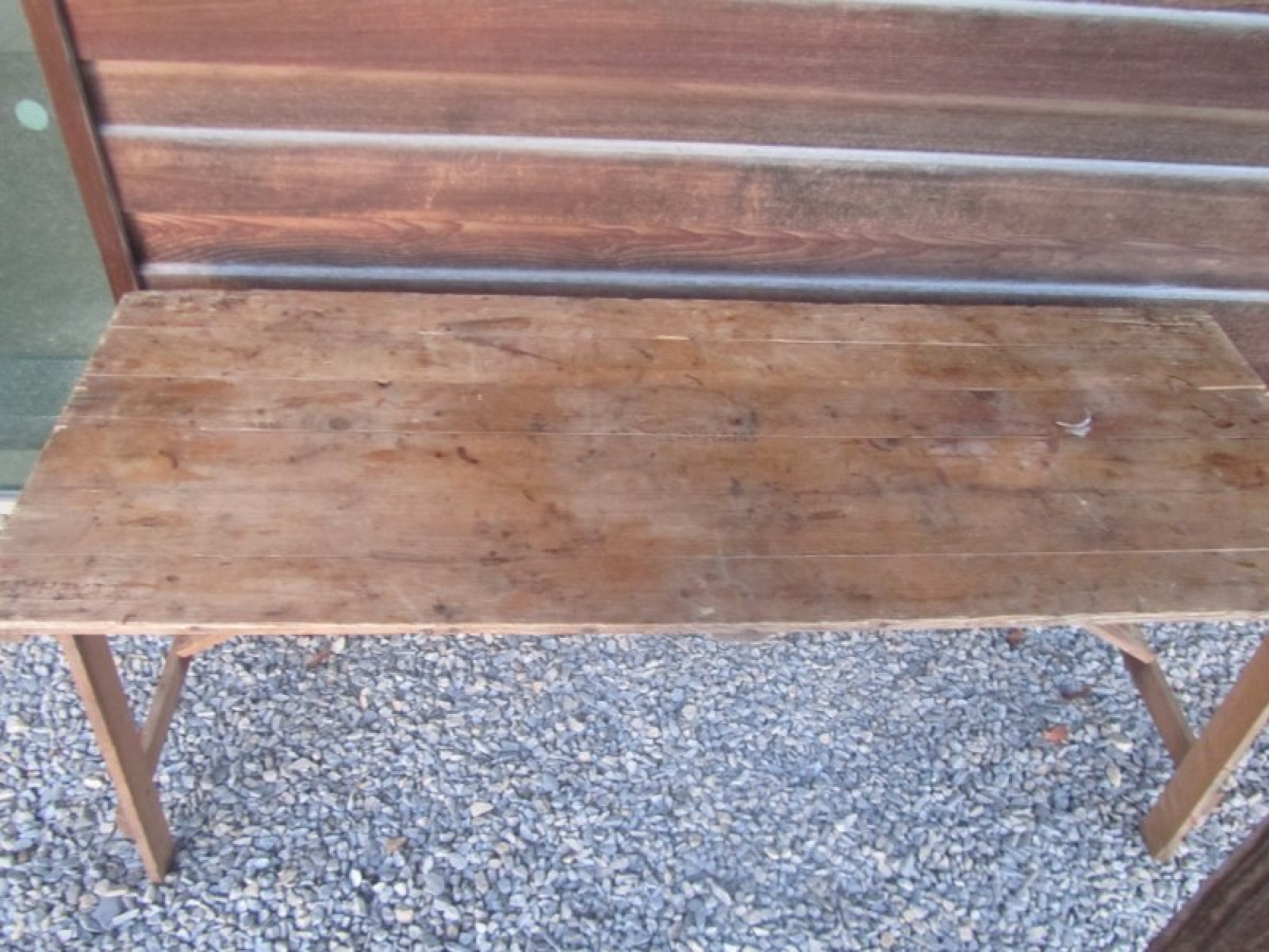 A SOLID PINE FOLD UP TABLE. IT HAS BEEN STORED IN AN OUTBUILDING, GENERAL WEAR AND TEAR. IT HAS THE ORIGINAL OWNERS NAME STAMPED/IMPRESSED IN TO THE WOOD.