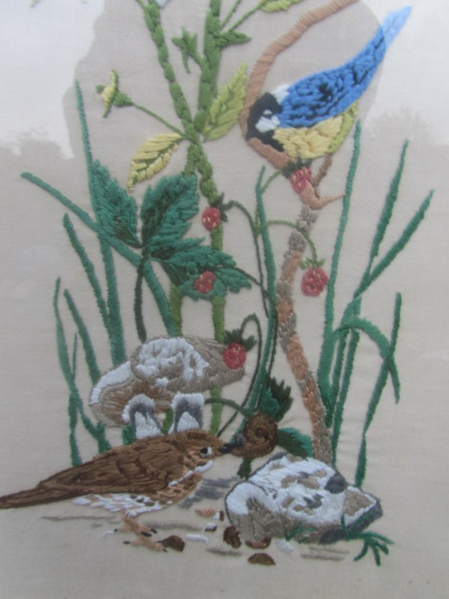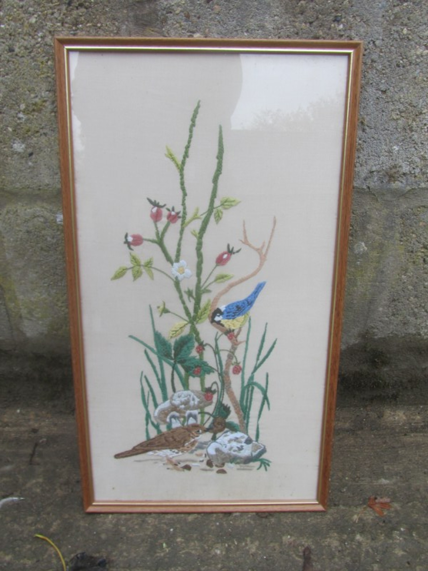 A COLOURFUL EMBRIODERY, HAND MADE. IT IS IN A VINTAGE FRAME. |