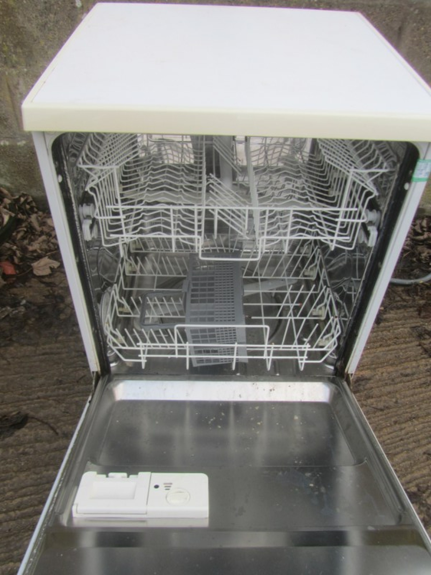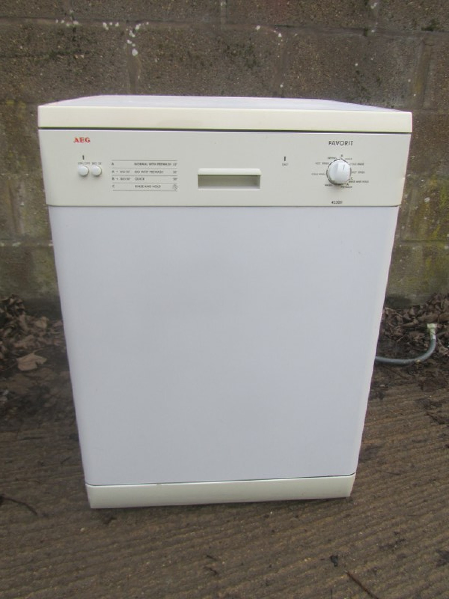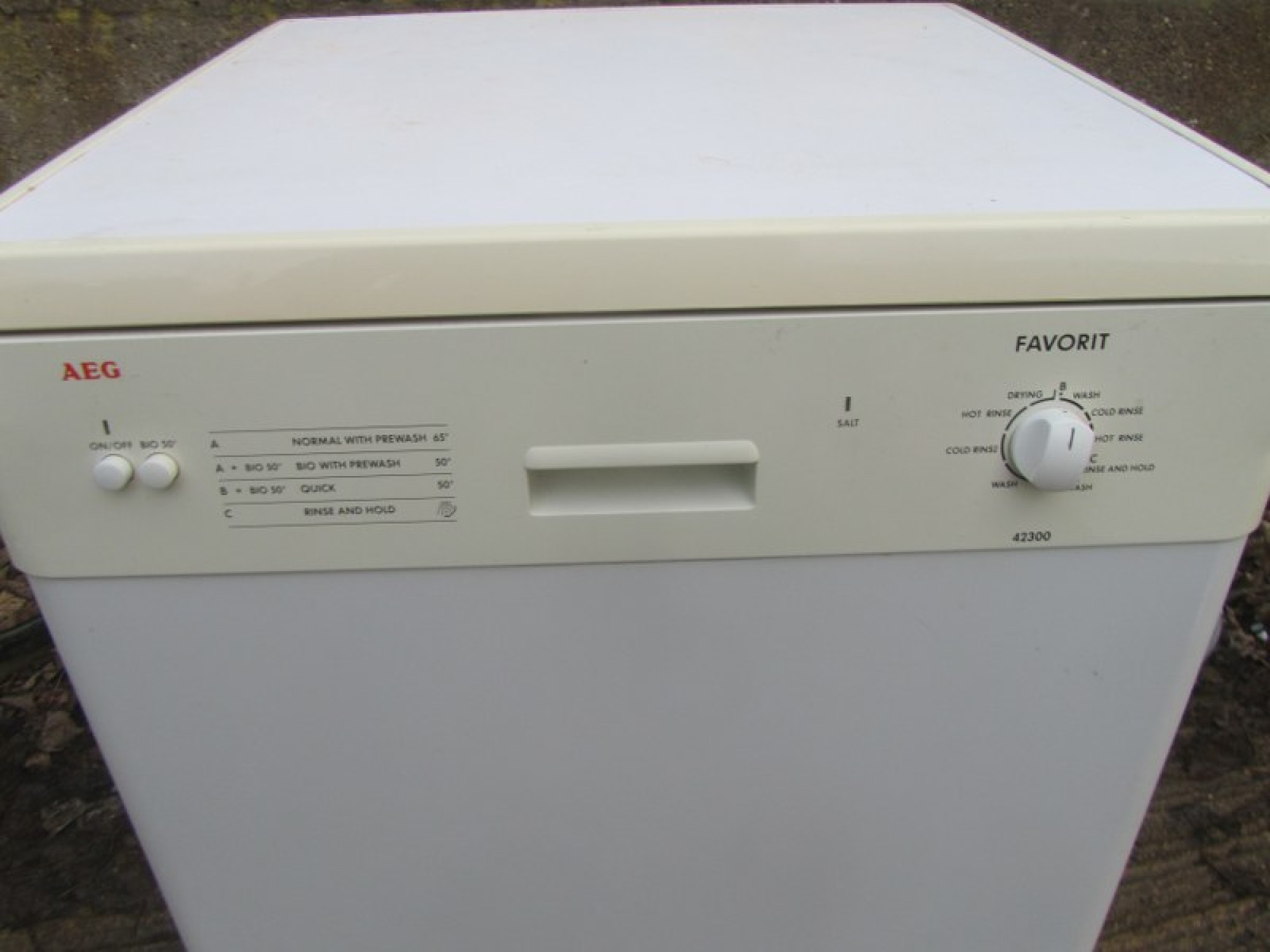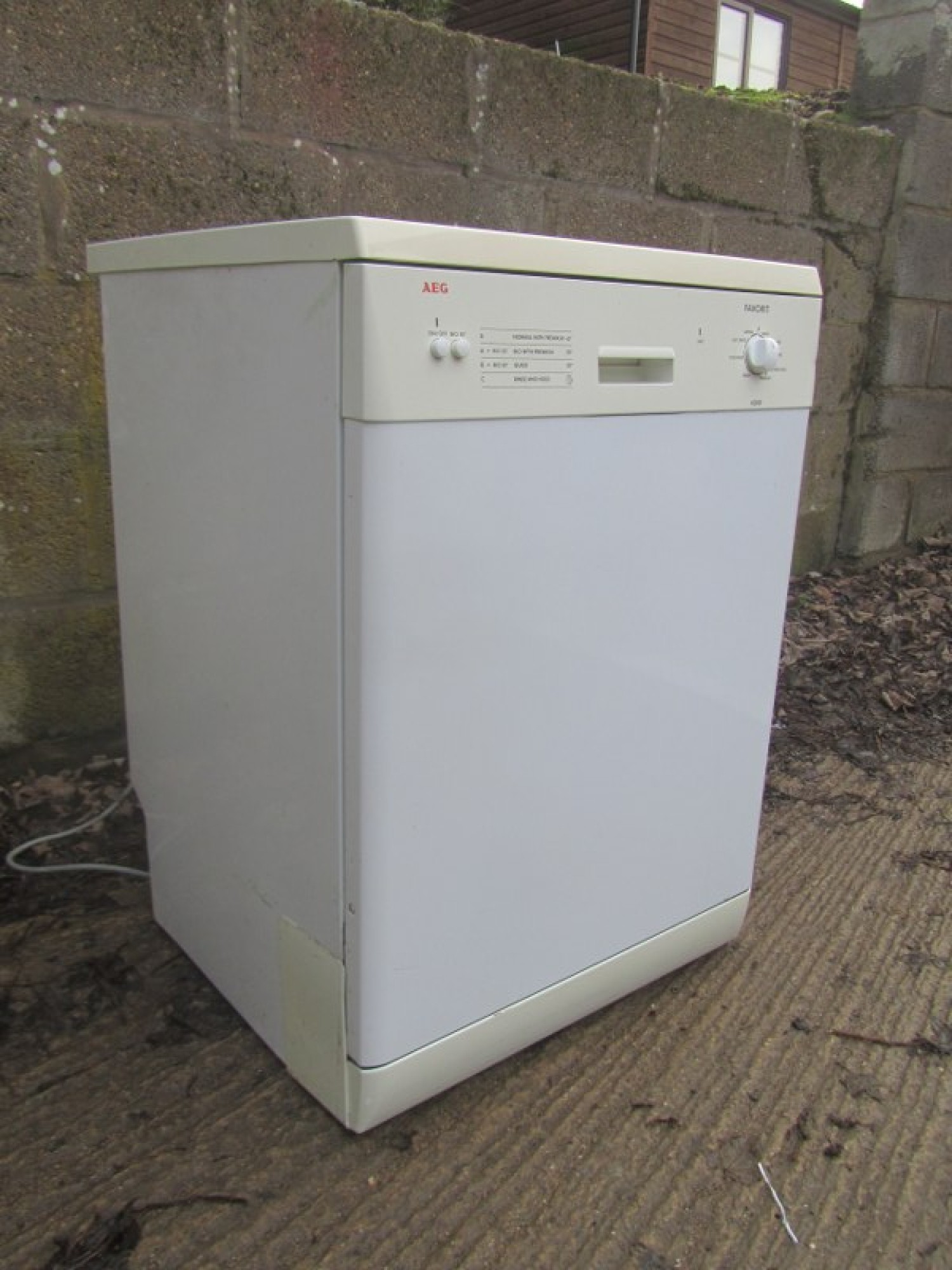 THIS IS A WHITE DISHWASHER MADE BY AEG. A FULL SIZE MODEL IN AVERAGE CONDITION. IN WORKING ORDER. THE PLASTIC HAS GONE OFF WHITE. GENERAL WEAR AND RUST IN THE DRAWERS. DENT TO THE CONTROL PANEL. SOME WEAR, BUT A STURDY MACHINE.