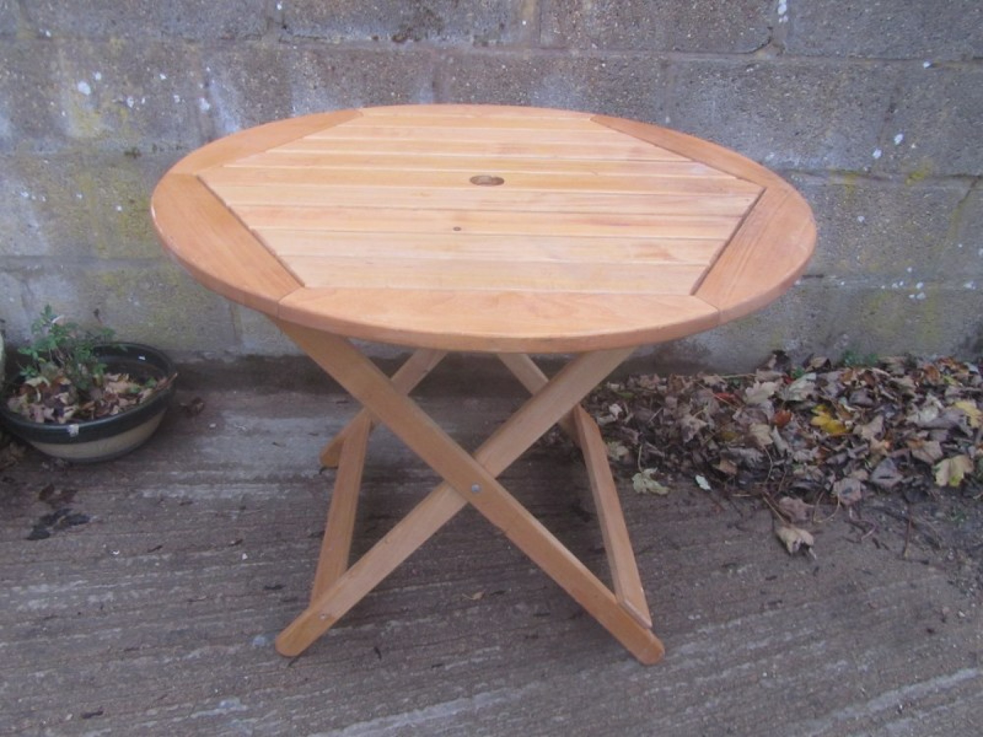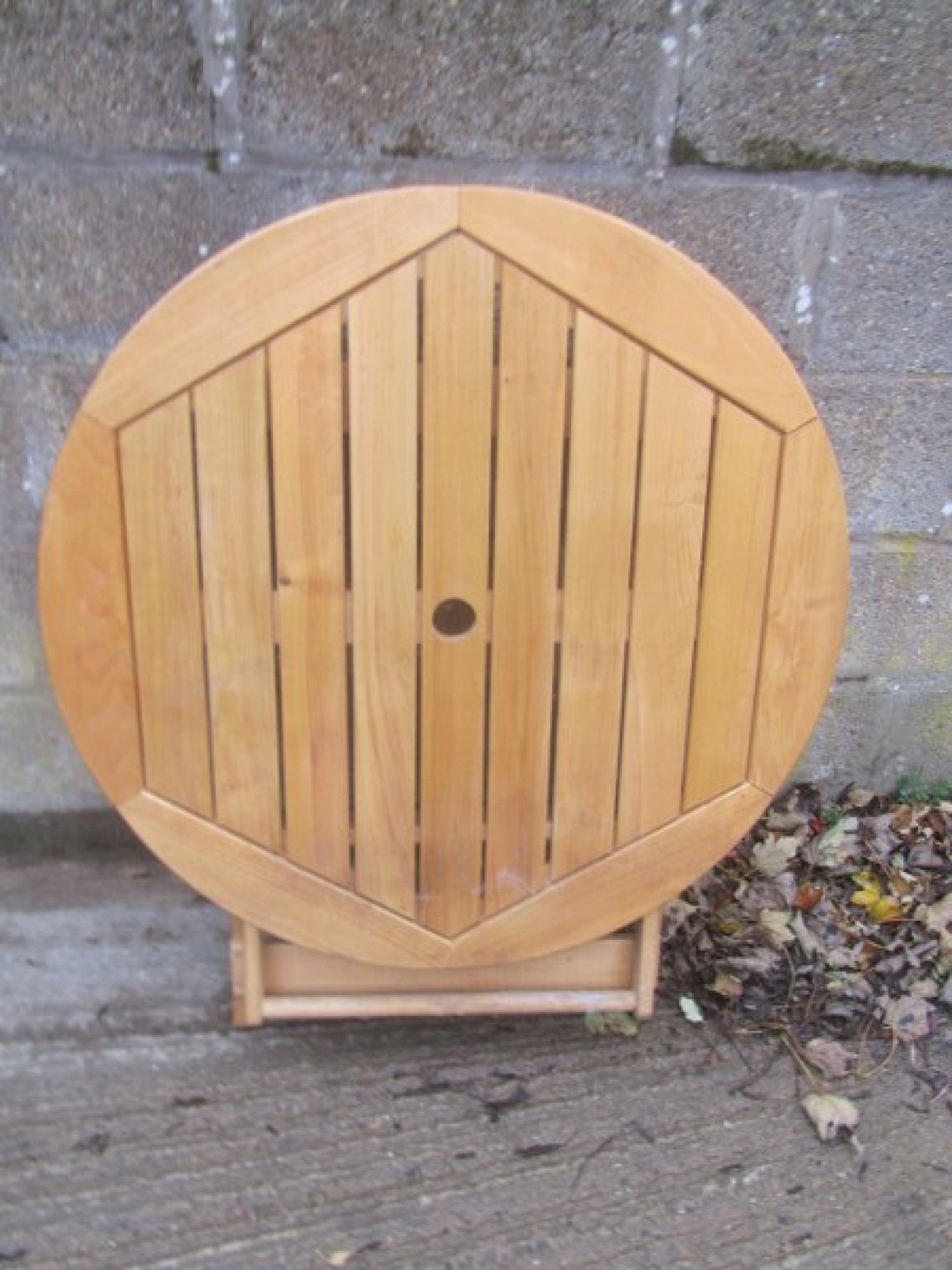 A FOLDING TABLE IN SOLID WOOD, IT WILL FOLD FLAT FOR STORAGE. IT HAS BEEN USED OUTSIDE. STURDY.
