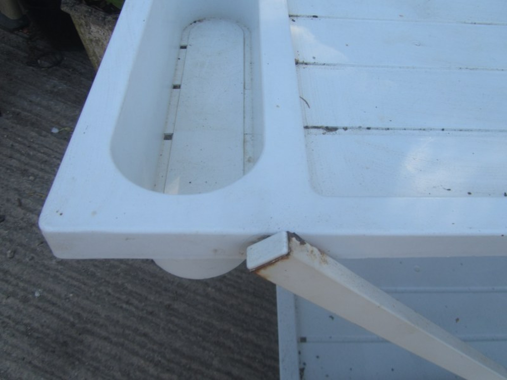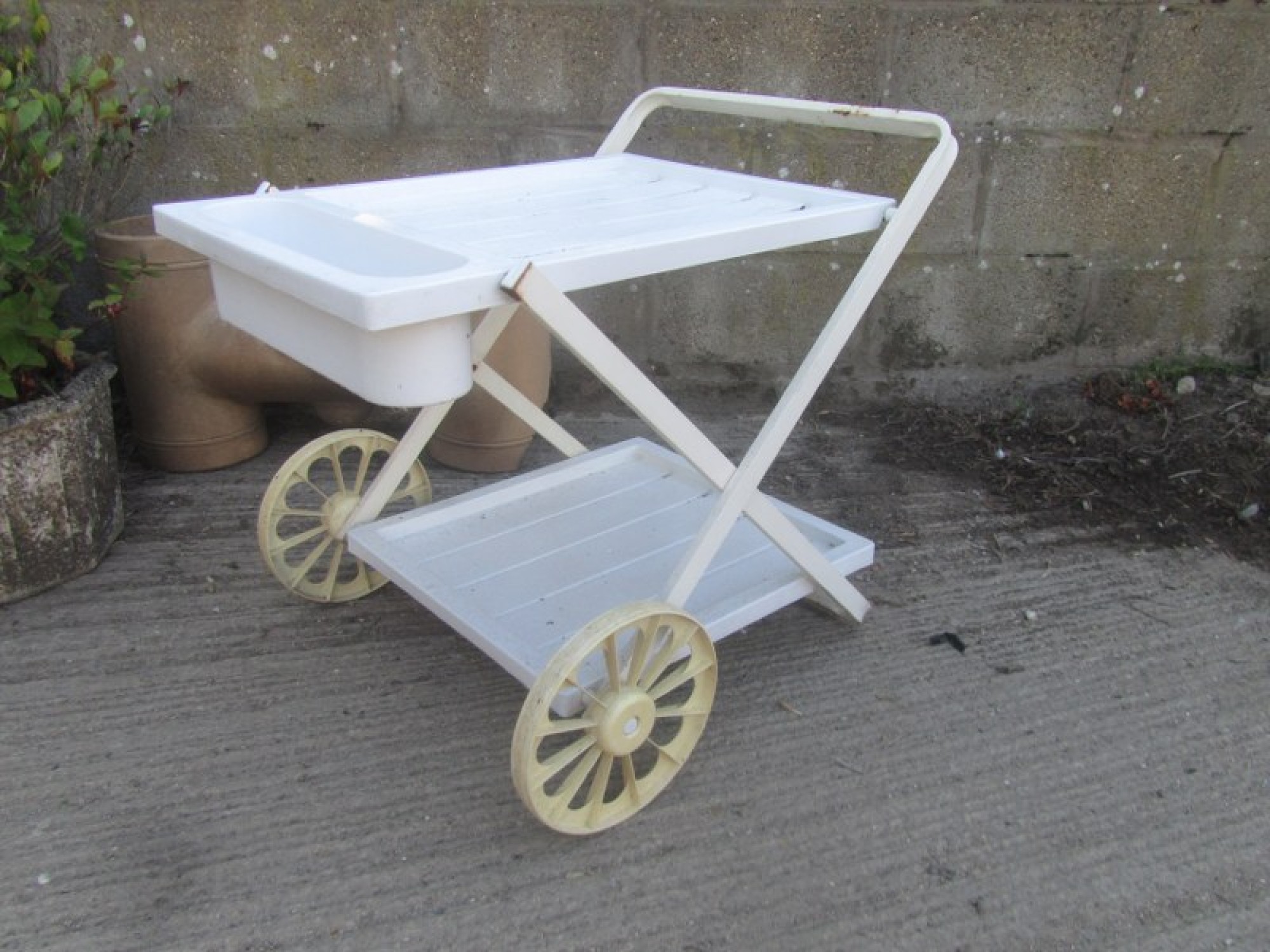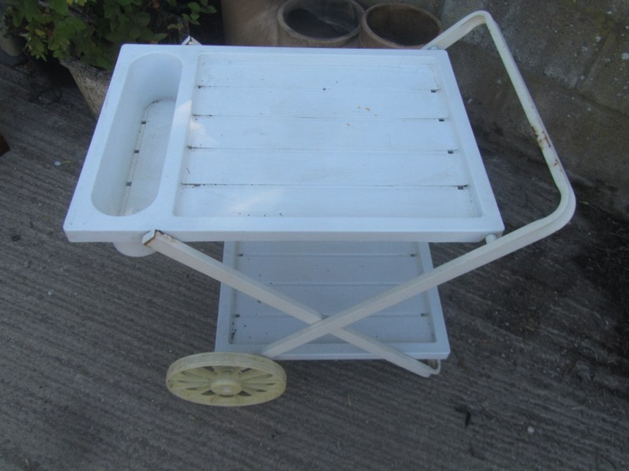 A GARDEN TROLLEY, RUSTY METAL FRAME, PLASTIC TABLE TOPS AND WHEELS. DISCOLOURED.