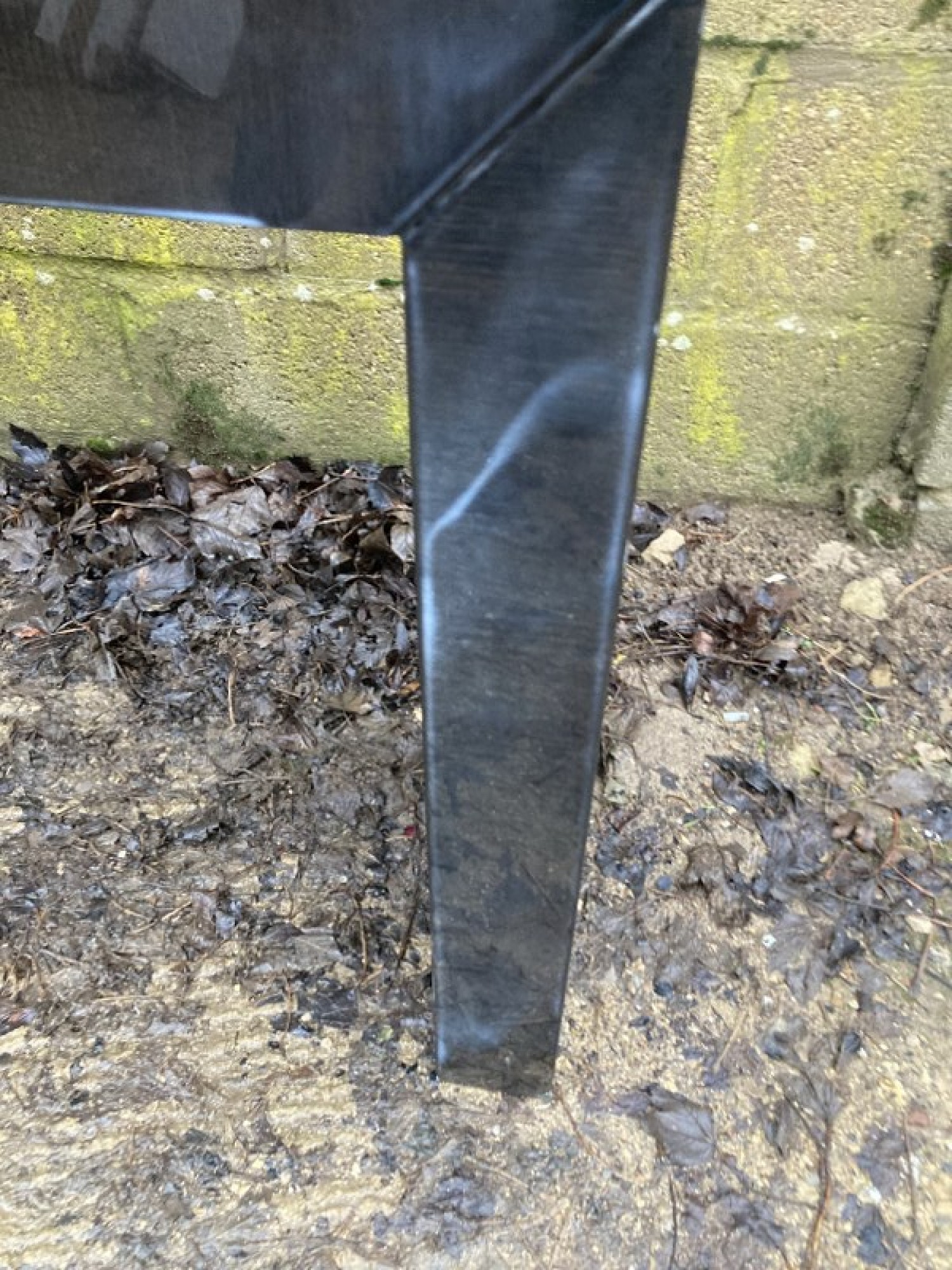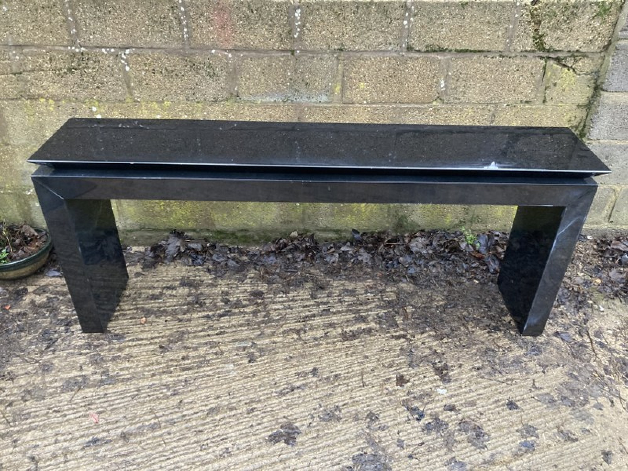 A LONG STYLISH HALL TABLE. IT IS IN A GLOSSY BLACK COLOUR. SOME SCUFFS, DISCOLOURED ON ONE SIDE.