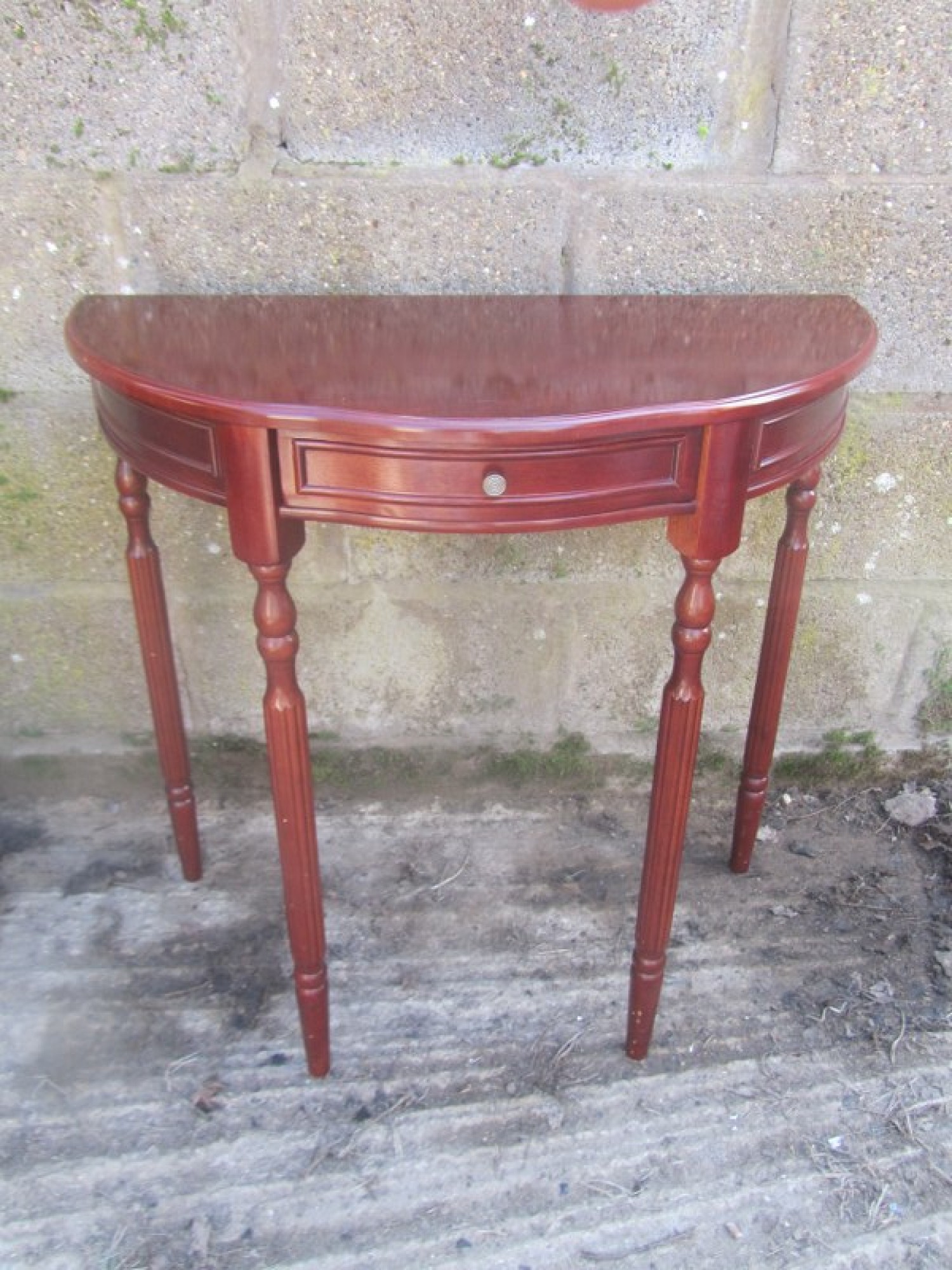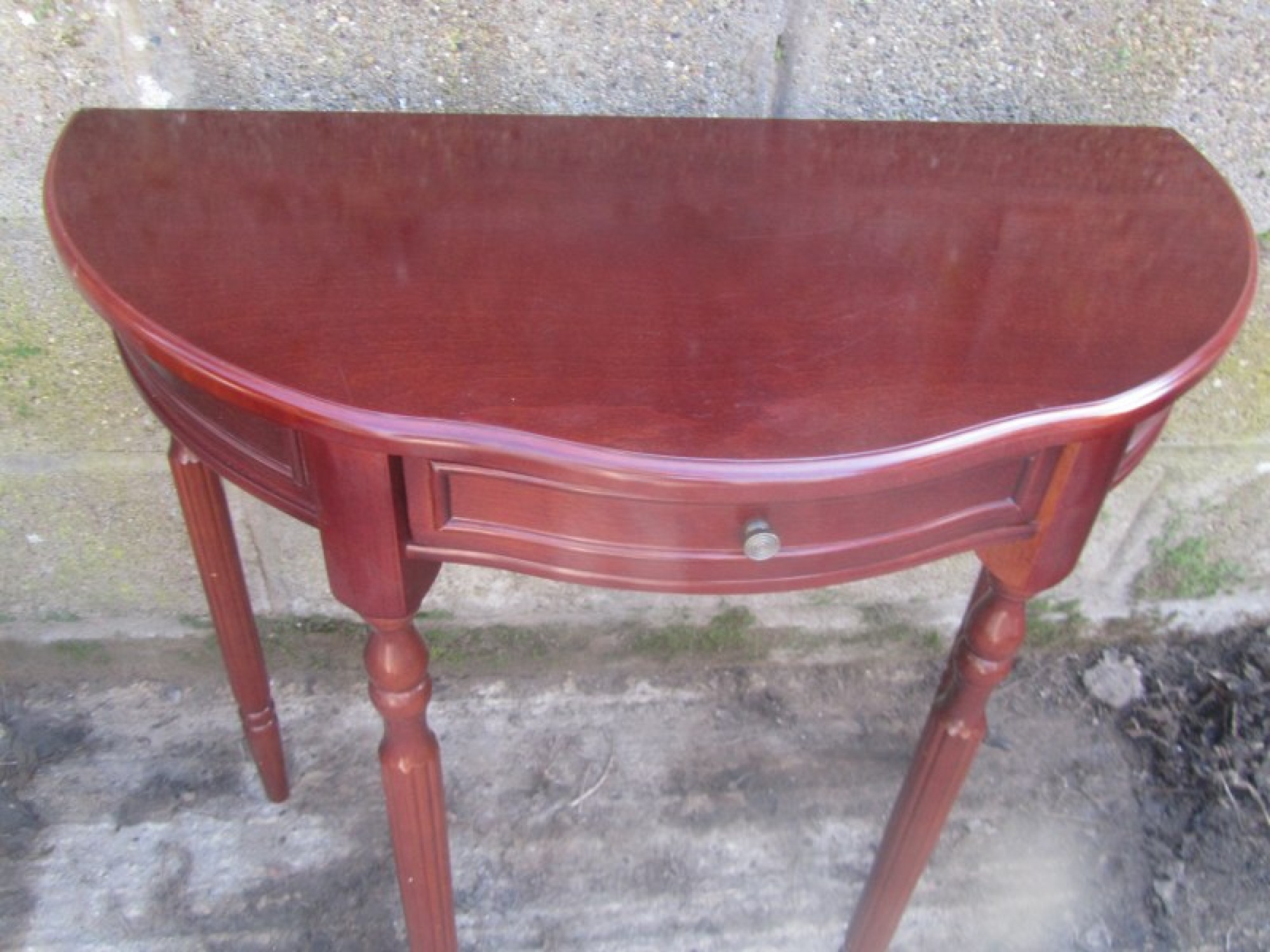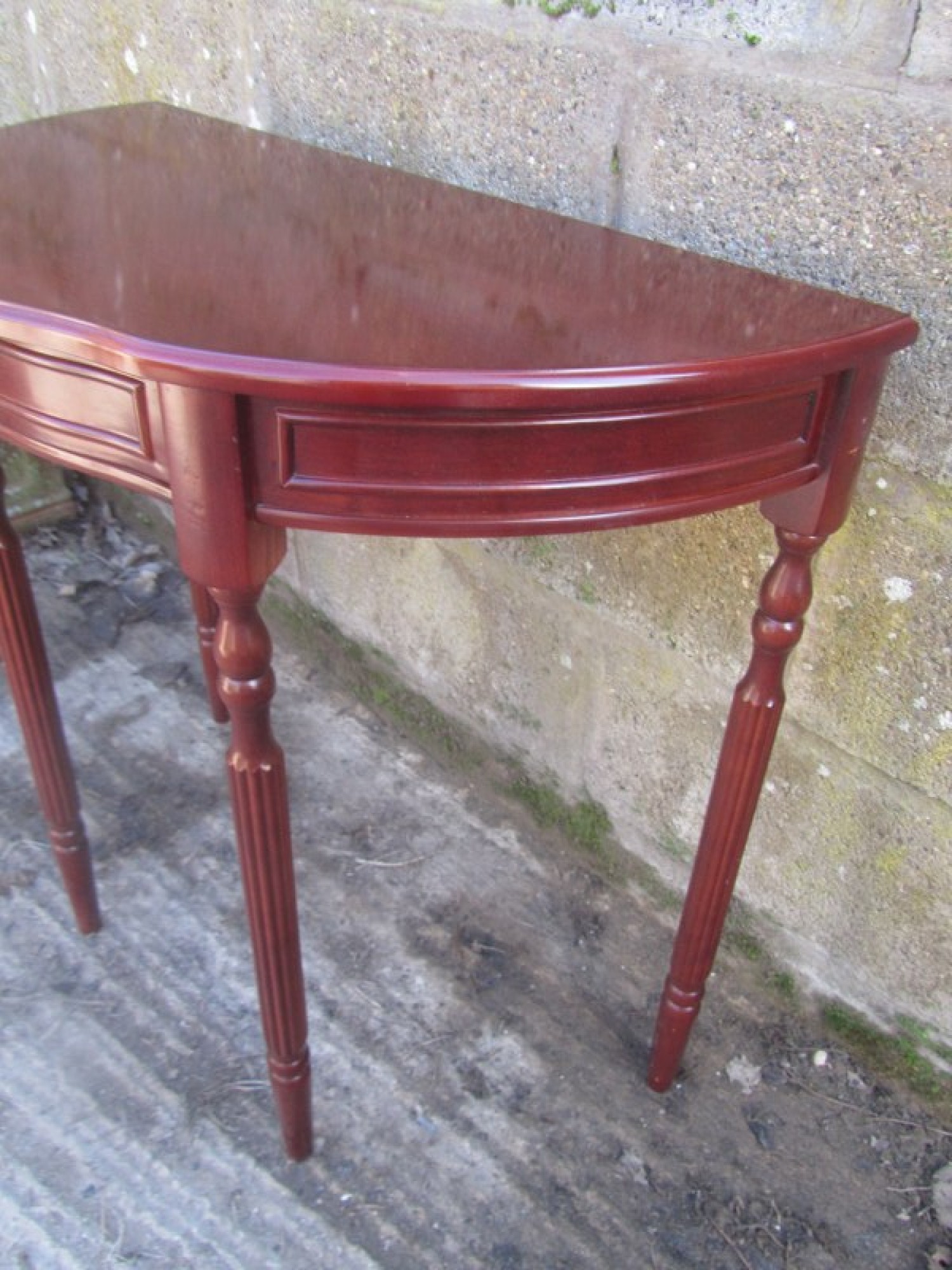 A HALF MOON HALL TABLE. IT IS IN A MAHOGANY COLOURED FINISH.