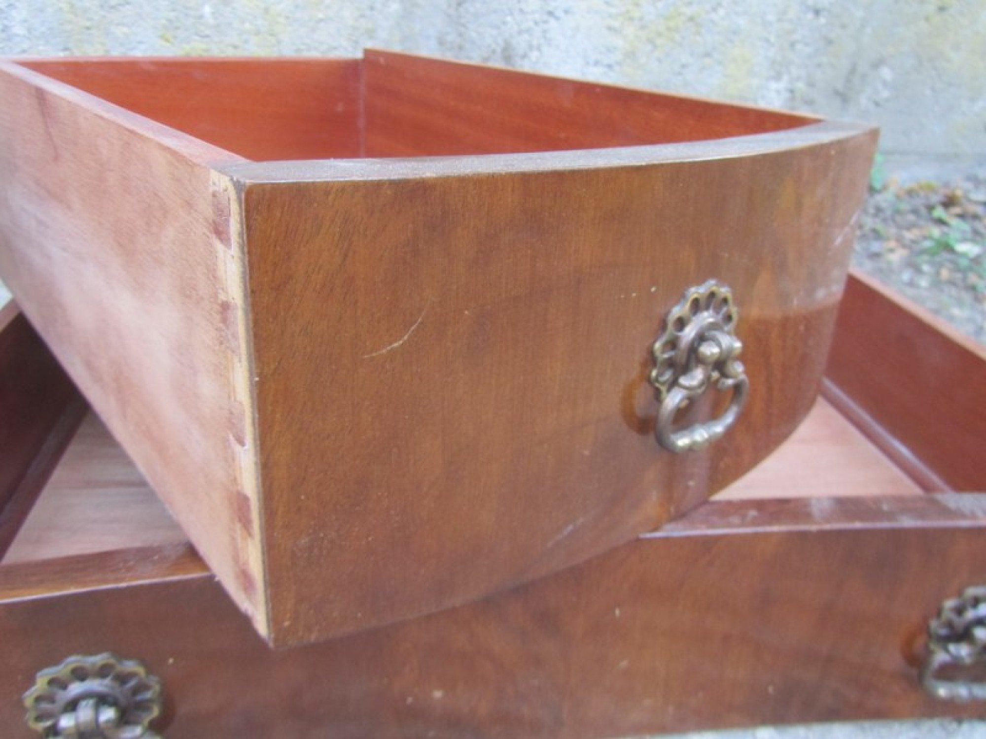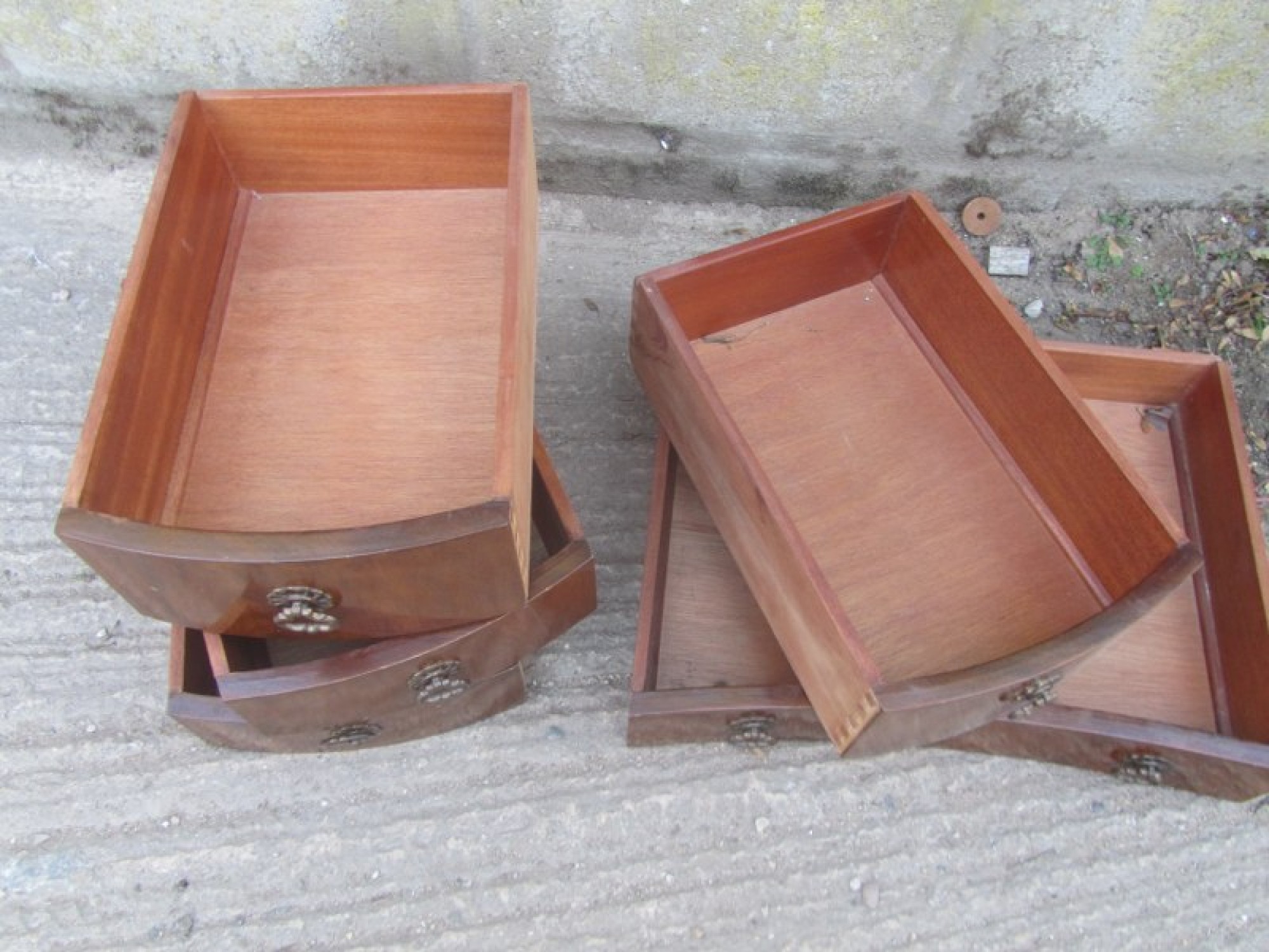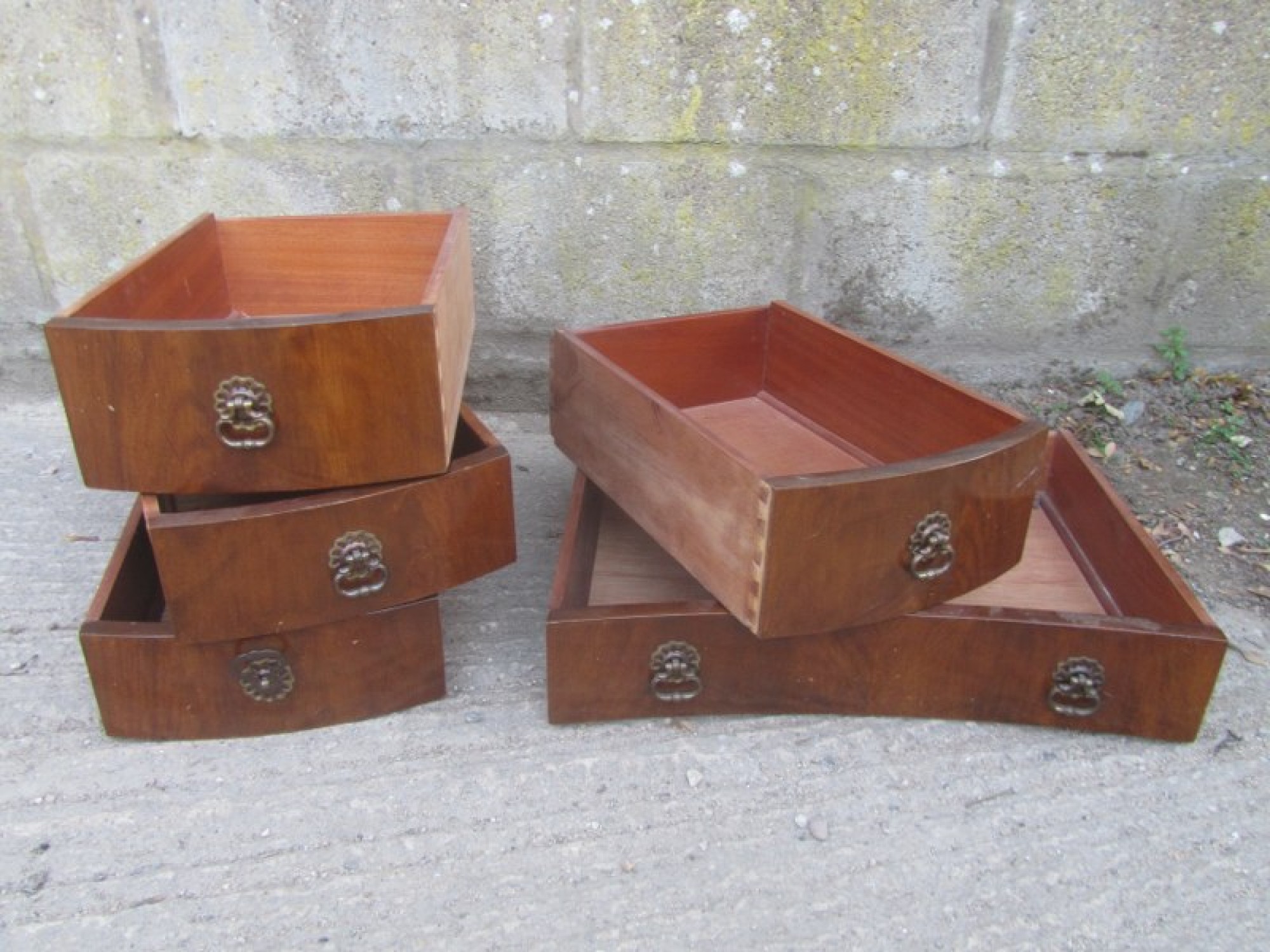 5 x WALNUT VENEERED DRAWERS, DIFFERENT SIZES. FROM AN OLD DRESSING TABLE. FOR SALE AS A JOB LOT. IDEAL AS SHELVING, STORAGE, FEATURE PIECES etc. METAL HANDLES.
