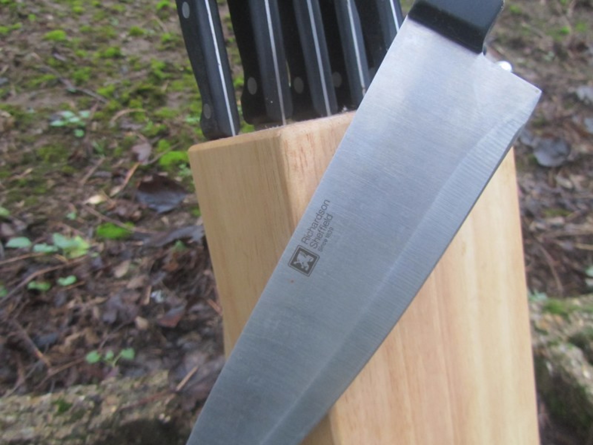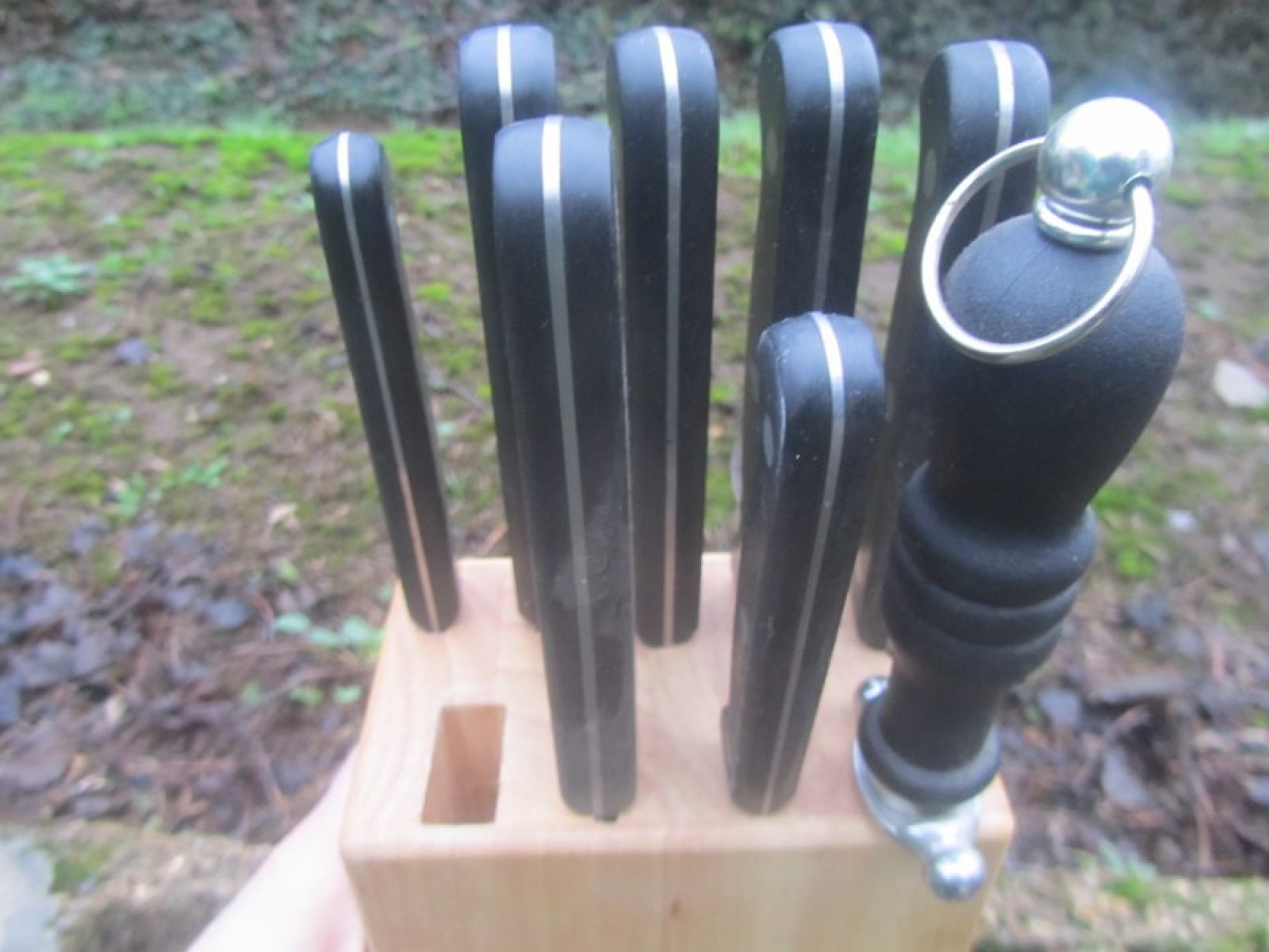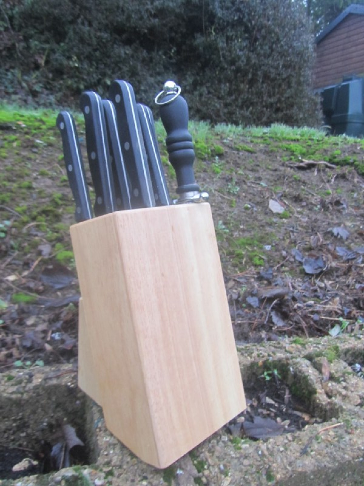 A KITCHEN KNIFE SET IN BLOCK. ONLY FOR SALE TO OVER 18s. ONE IS MISSING.