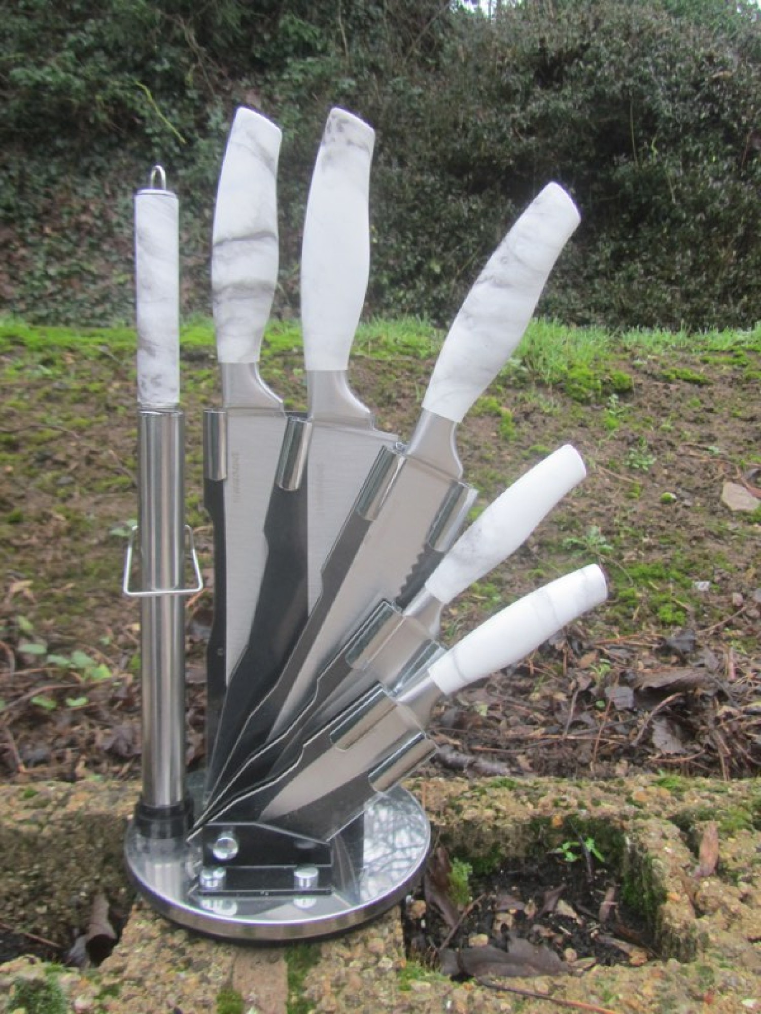 A KITCHEN KNIFE SET IN BLOCK. ONLY FOR SALE TO OVER 18s.