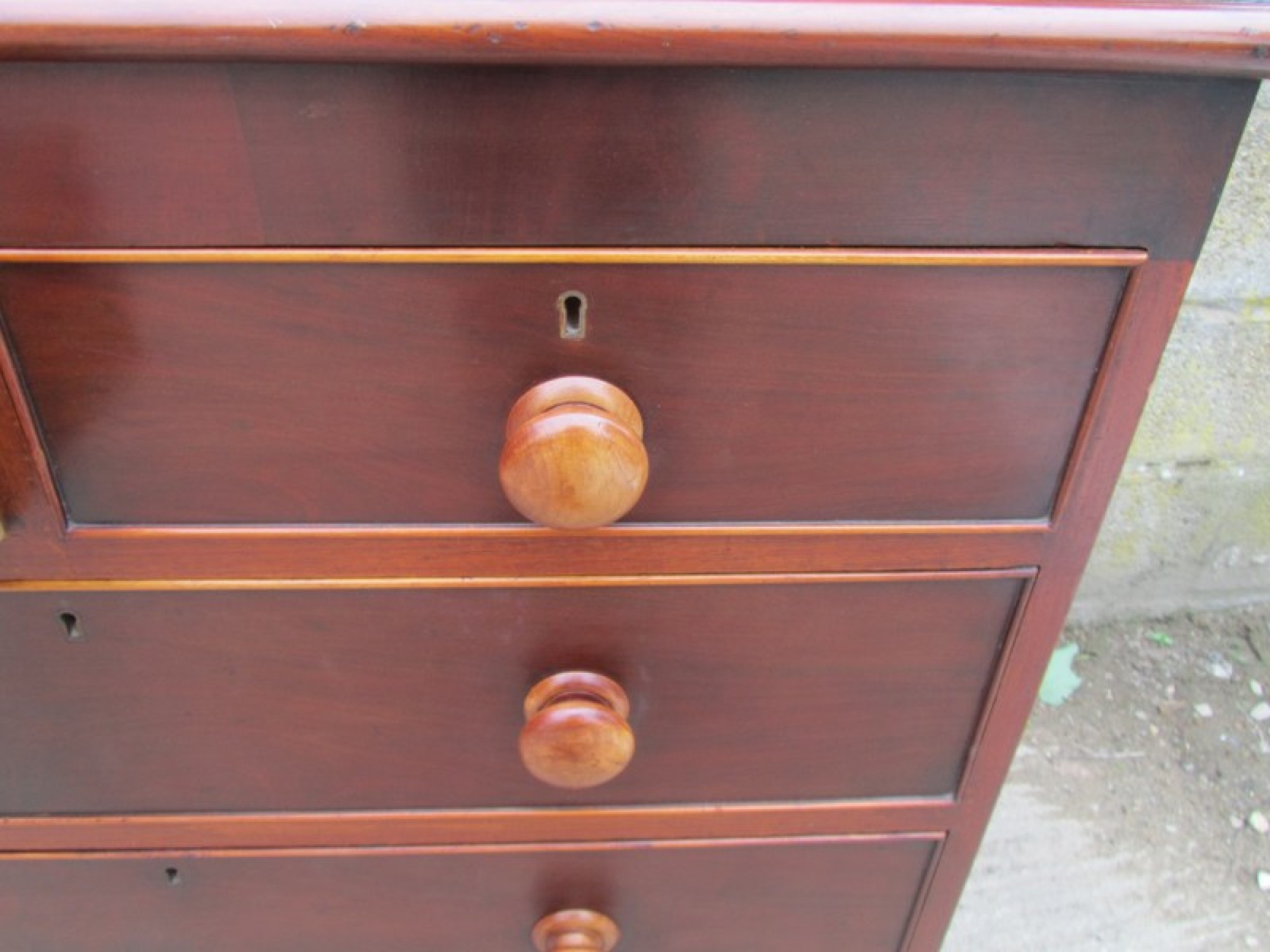 THIS IS A LARGE CHEST OF DRAWERS FROM THE VICTORIAN PERIOD. IT HAS 2 SMALL DRAWERS OVER 3 LARGE GRADUATED DRAWERS. MAHOGANY VENEER WITH BANDING ON THE DRAWER FRONTS.