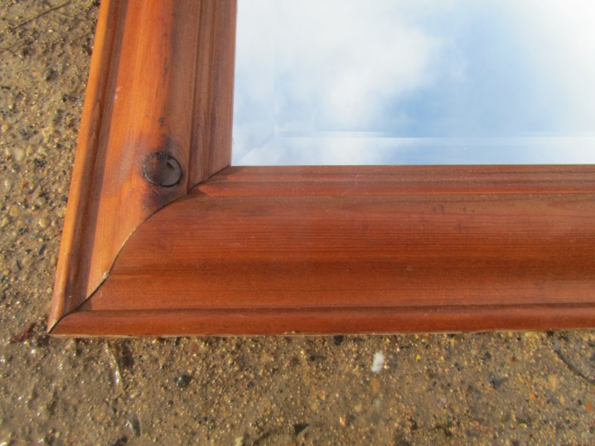 A LARGE WALL MIRROR IN A SOLID PINE FRAME.