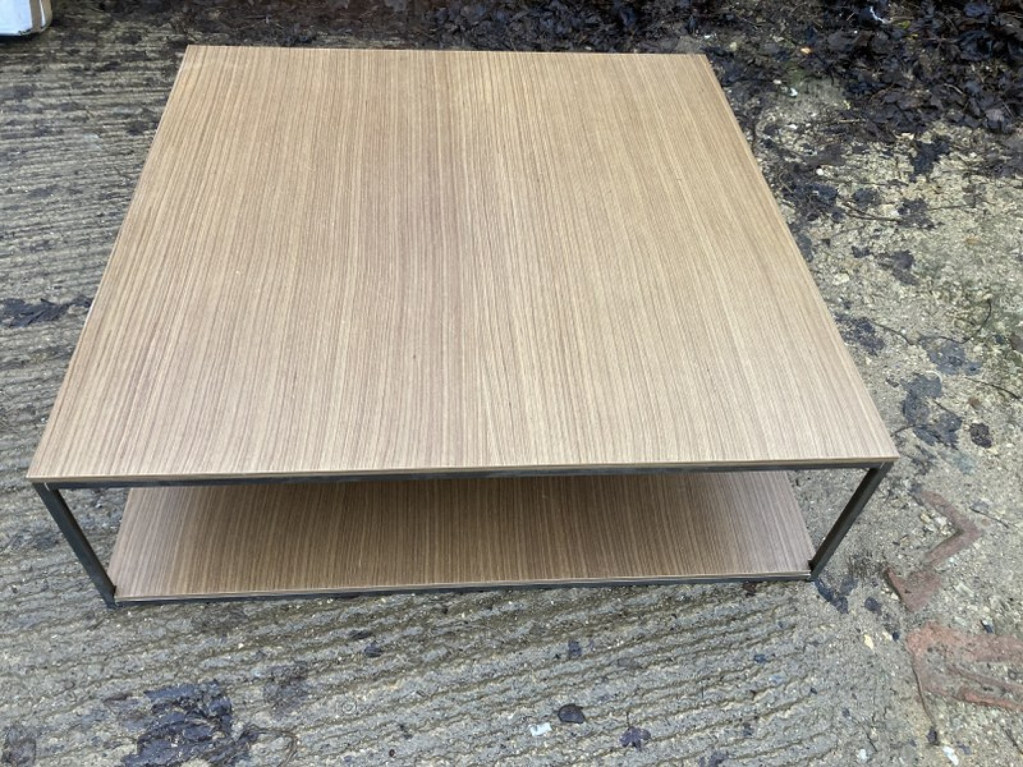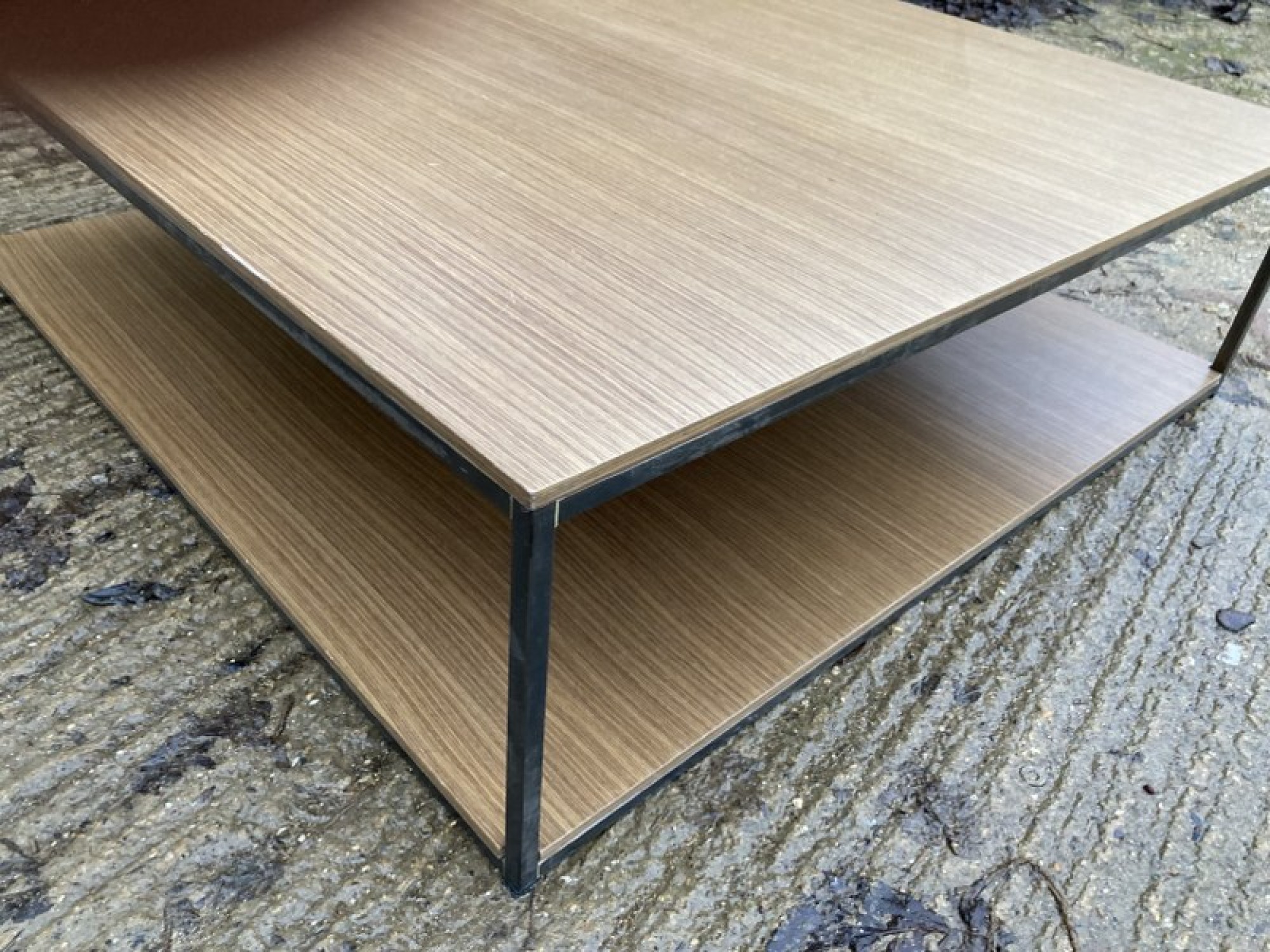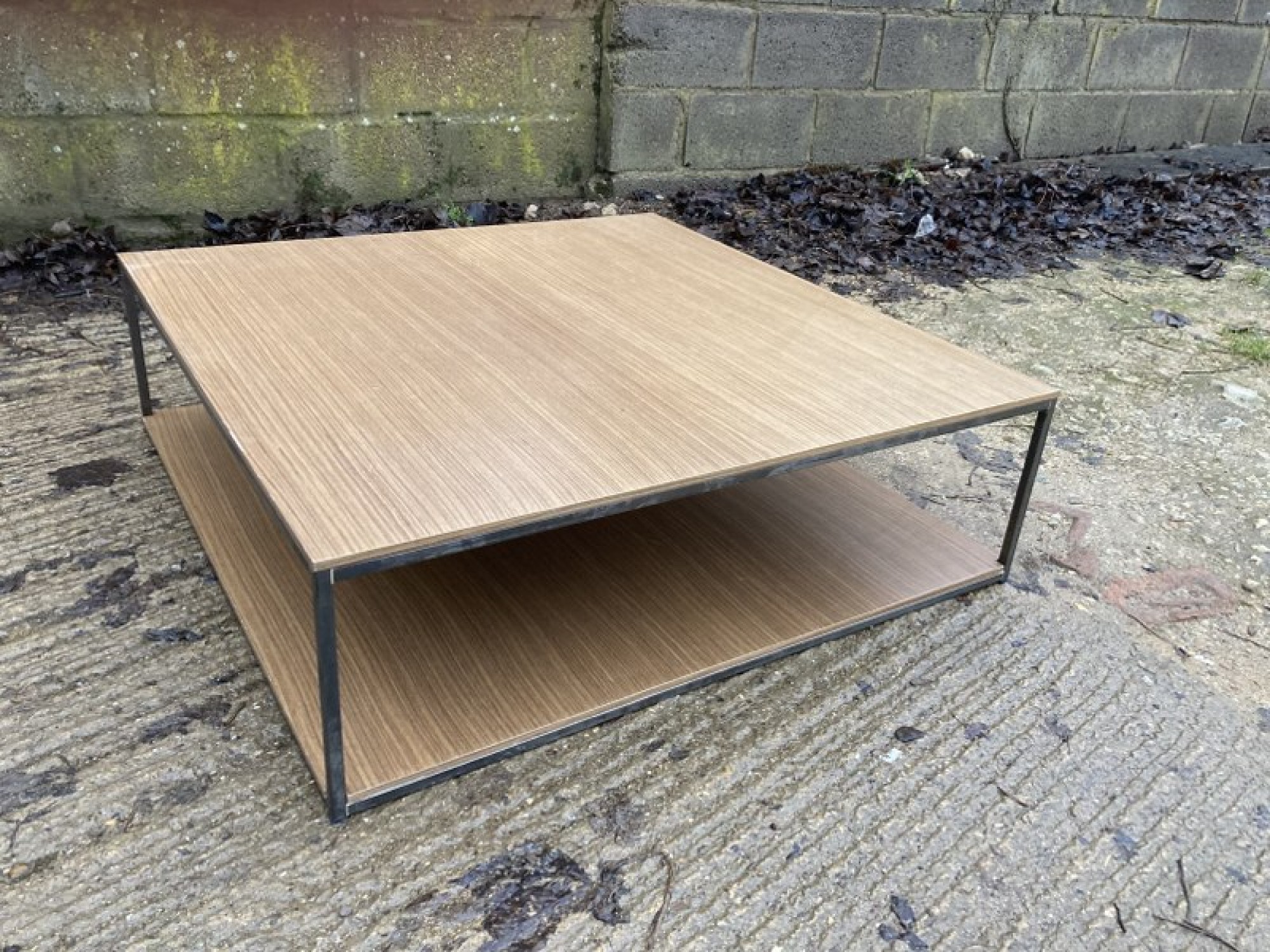 THIS IS A LARGE COFFEE TABLE, WOOD EFFECT TABLE TOP. METAL FRAME. IT IS BIG AND STURDY. A GREAT STYLISH ITEM.