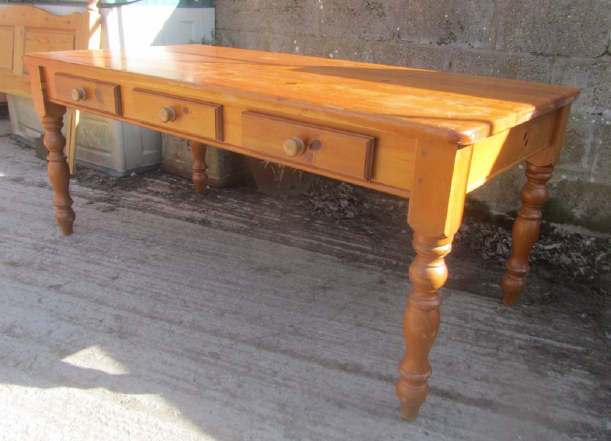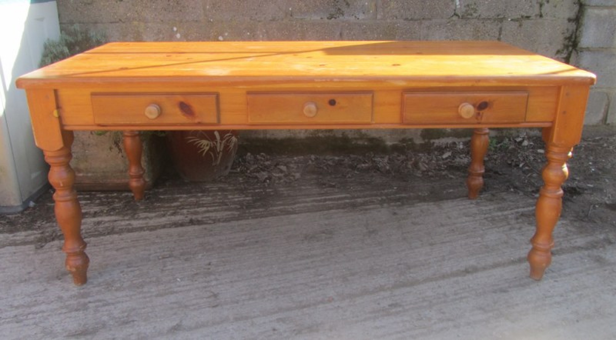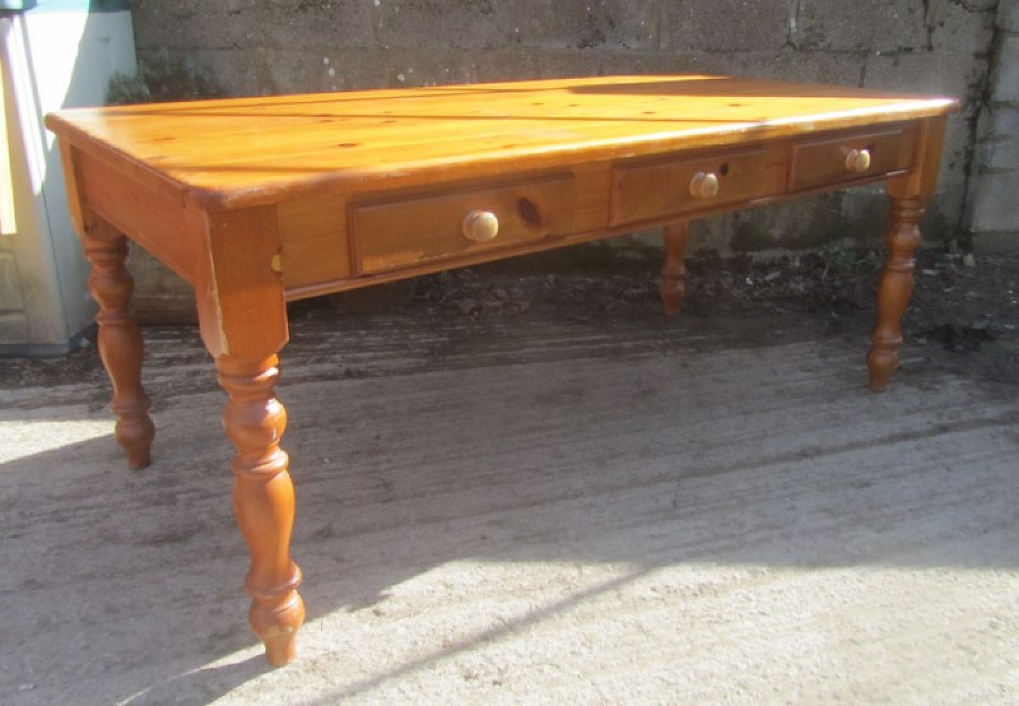 A LARGE SOLID PINE DINING TABLE, IN A TRADITIONAL FARMHOUSE STYLE. STRONG AND STURDY. THE LEGS DO NOT REMOVE FOR TRANSPORT, BUT THE TOP WILL REMOVE. SEATS 4 - 8 PEOPLE. SOME MARKS AND SCUFFS TO THE TABLE TOP. SMALL DRAWERS IN THE SIDE.