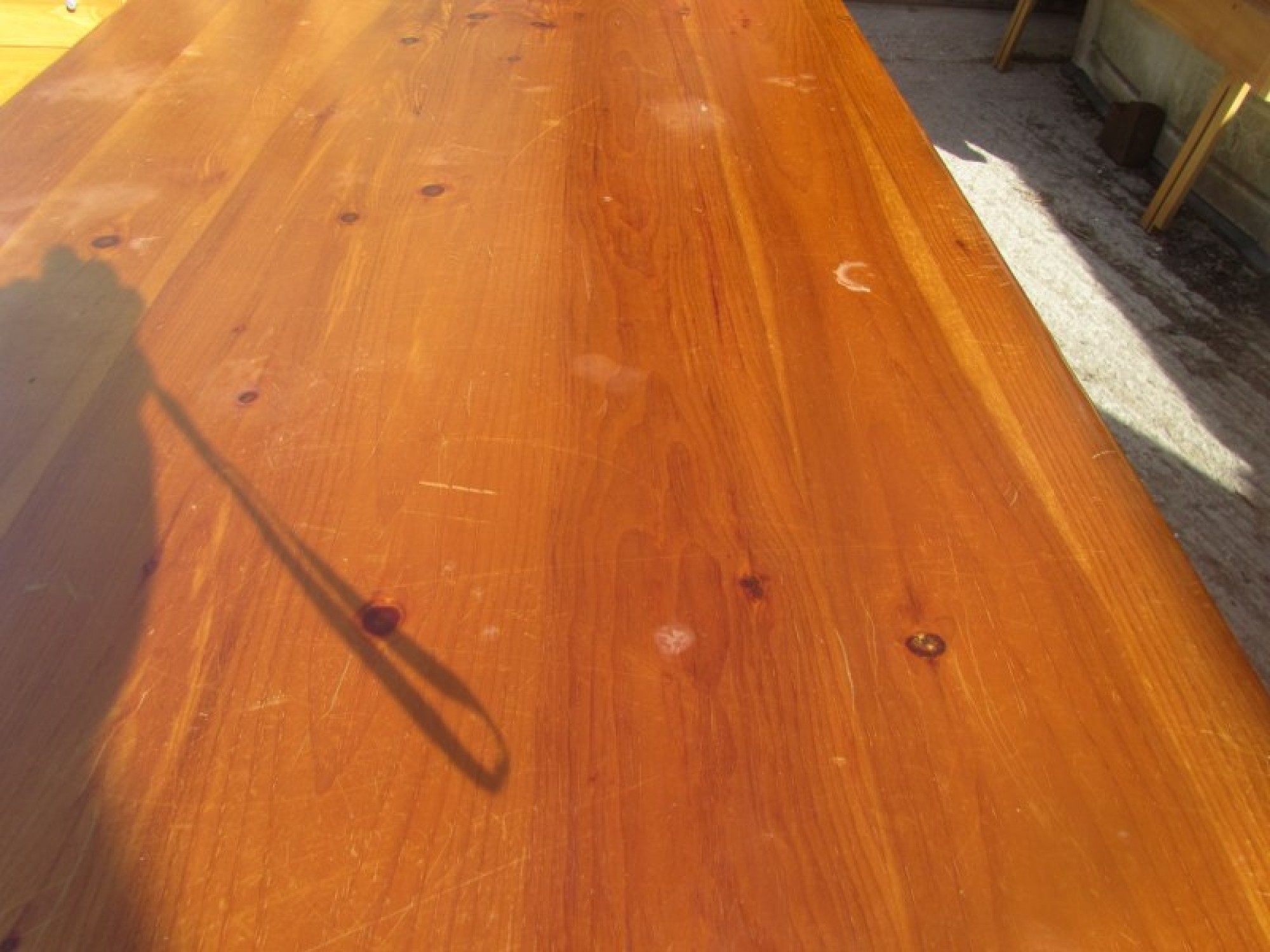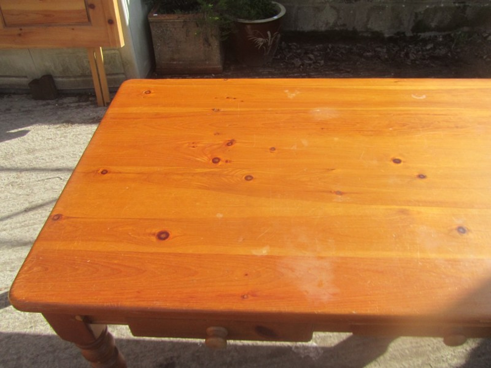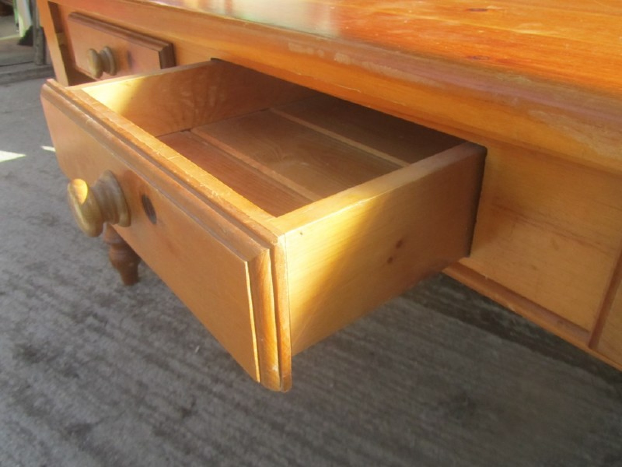 A LARGE SOLID PINE DINING TABLE, IN A TRADITIONAL FARMHOUSE STYLE. STRONG AND STURDY. THE LEGS DO NOT REMOVE FOR TRANSPORT, BUT THE TOP WILL REMOVE. SEATS 4 - 8 PEOPLE. SOME MARKS AND SCUFFS TO THE TABLE TOP. SMALL DRAWERS IN THE SIDE.