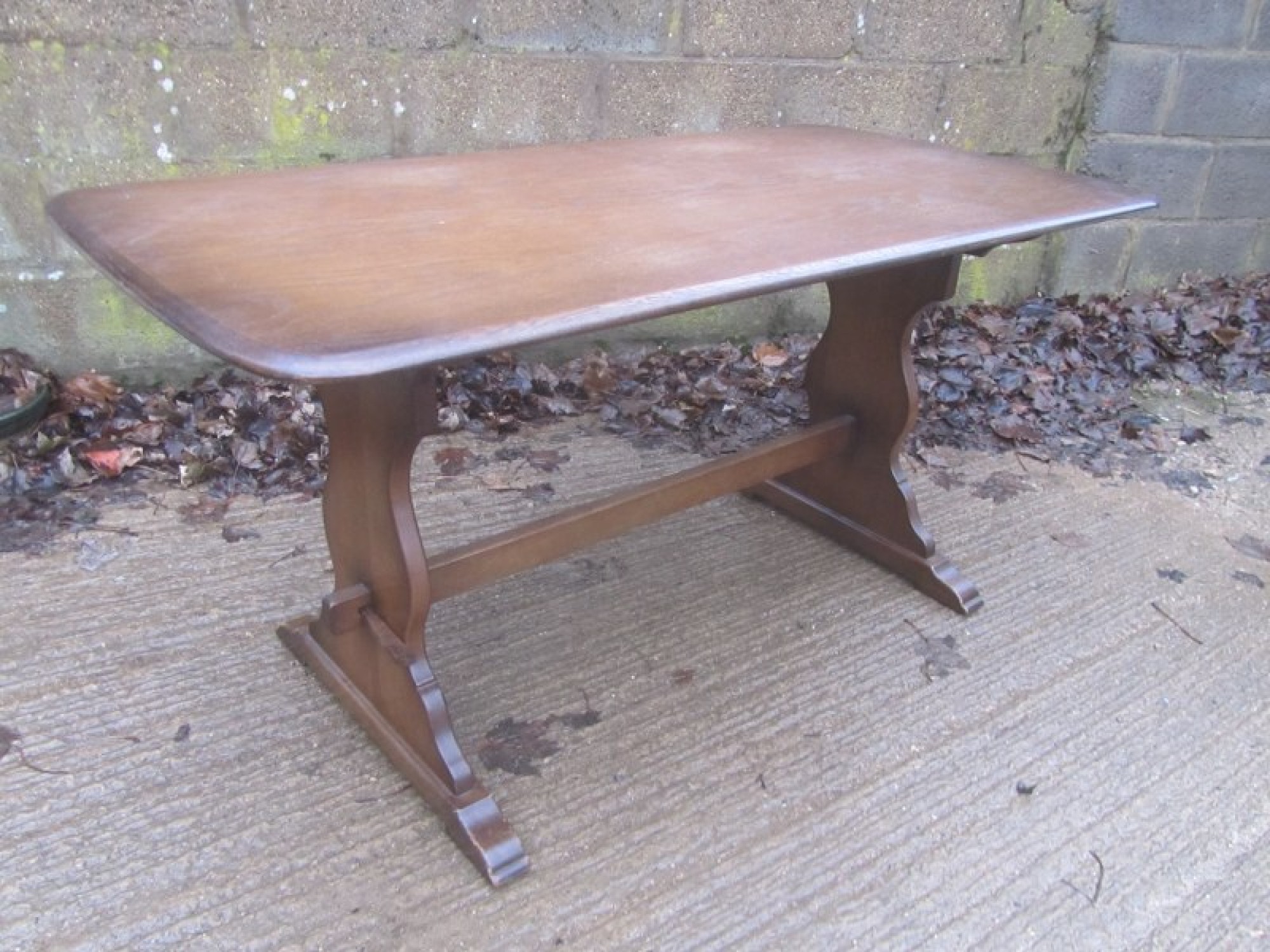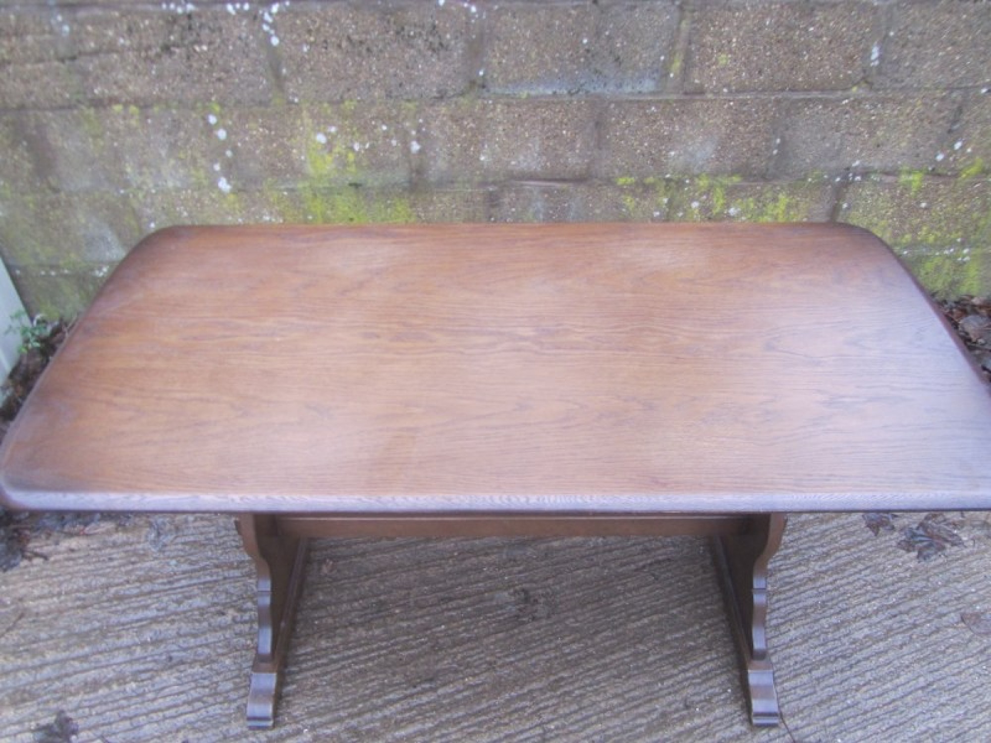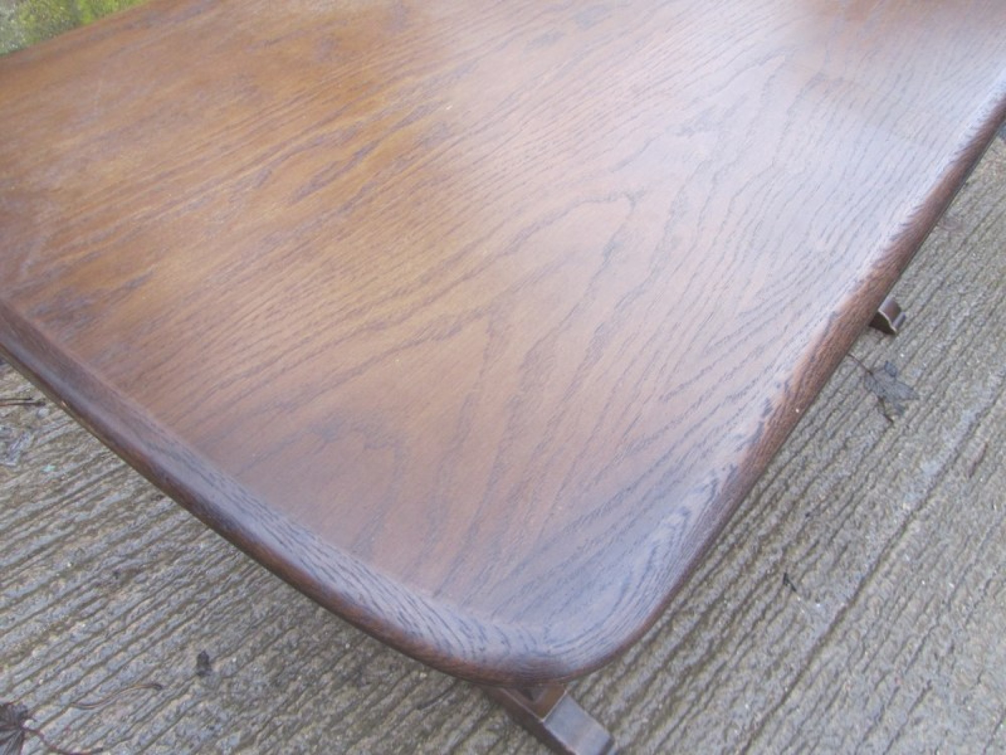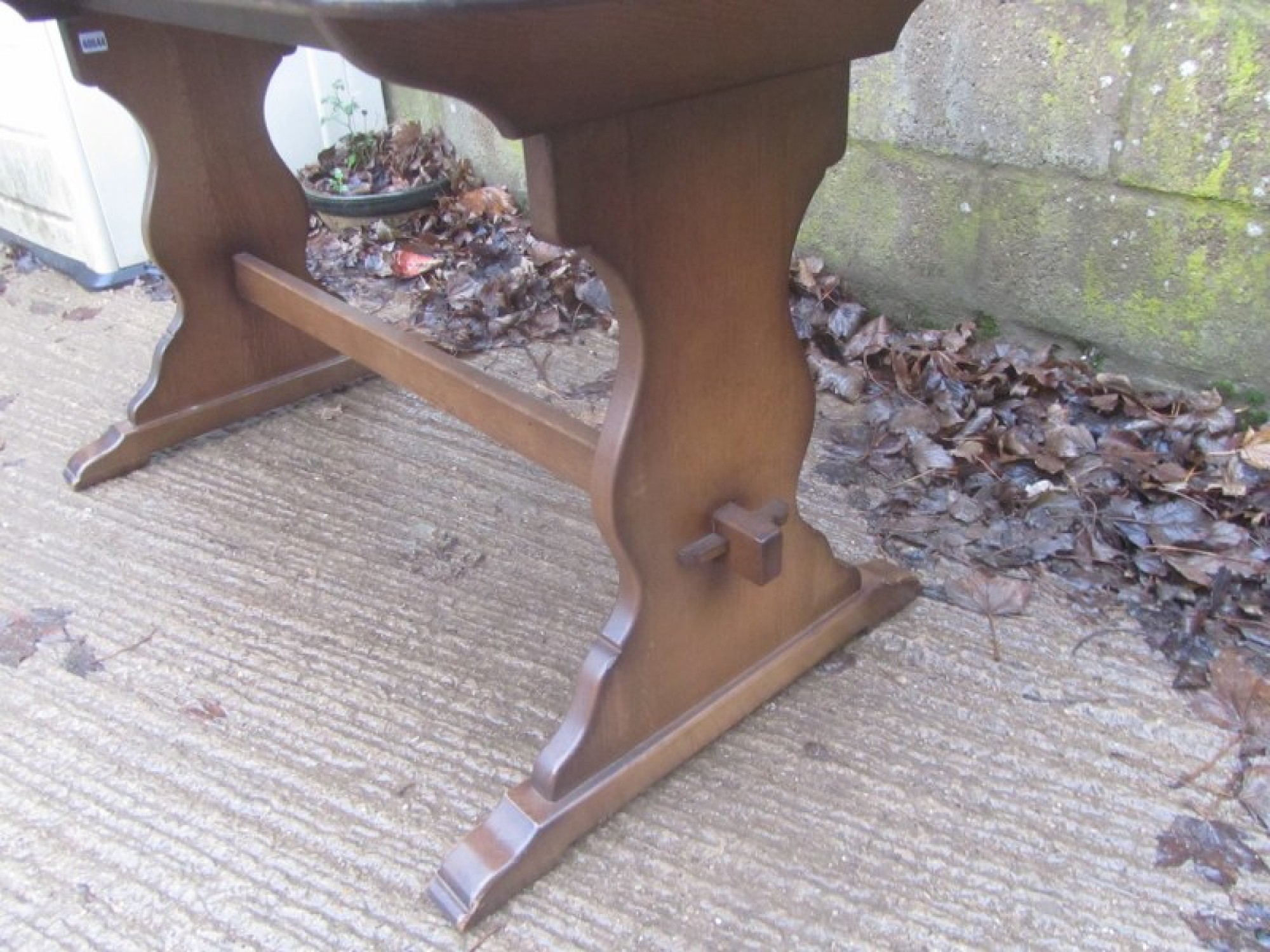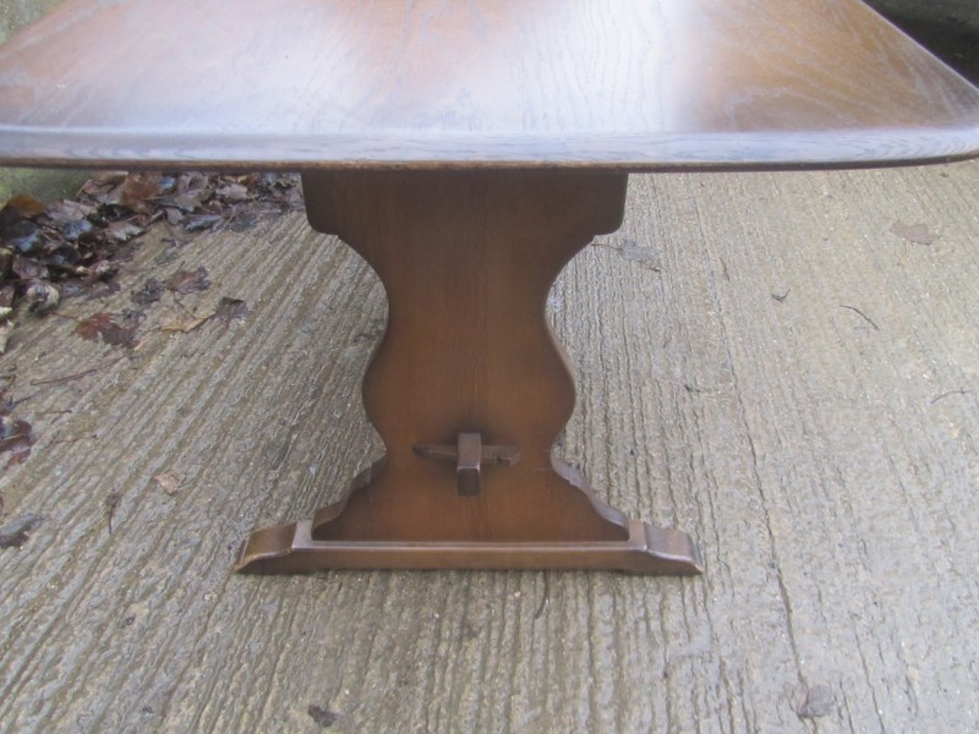THIS IS AN OAK TABLE TO SEAT 4-6 DINERS. IT IS A REFECTORY TABLE, WITH A OAK VENEERED TOP. A WELL MADE PIECE OF TRADITIONAL FURNITURE. GOOD QUALITY TABLE. SOME LIGHT MARKS.