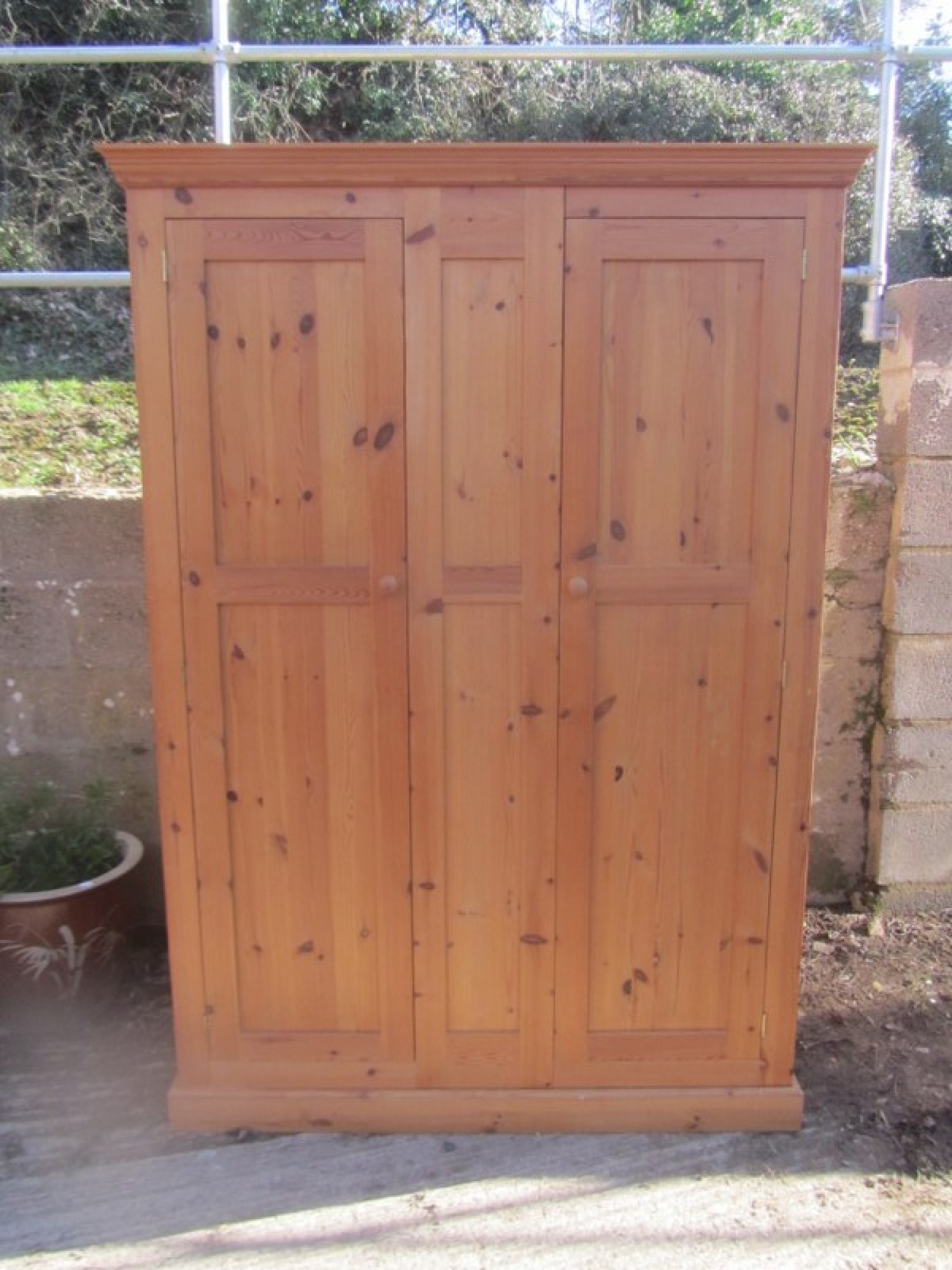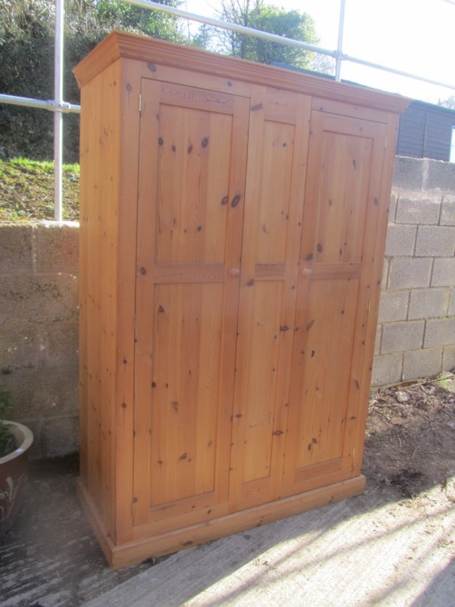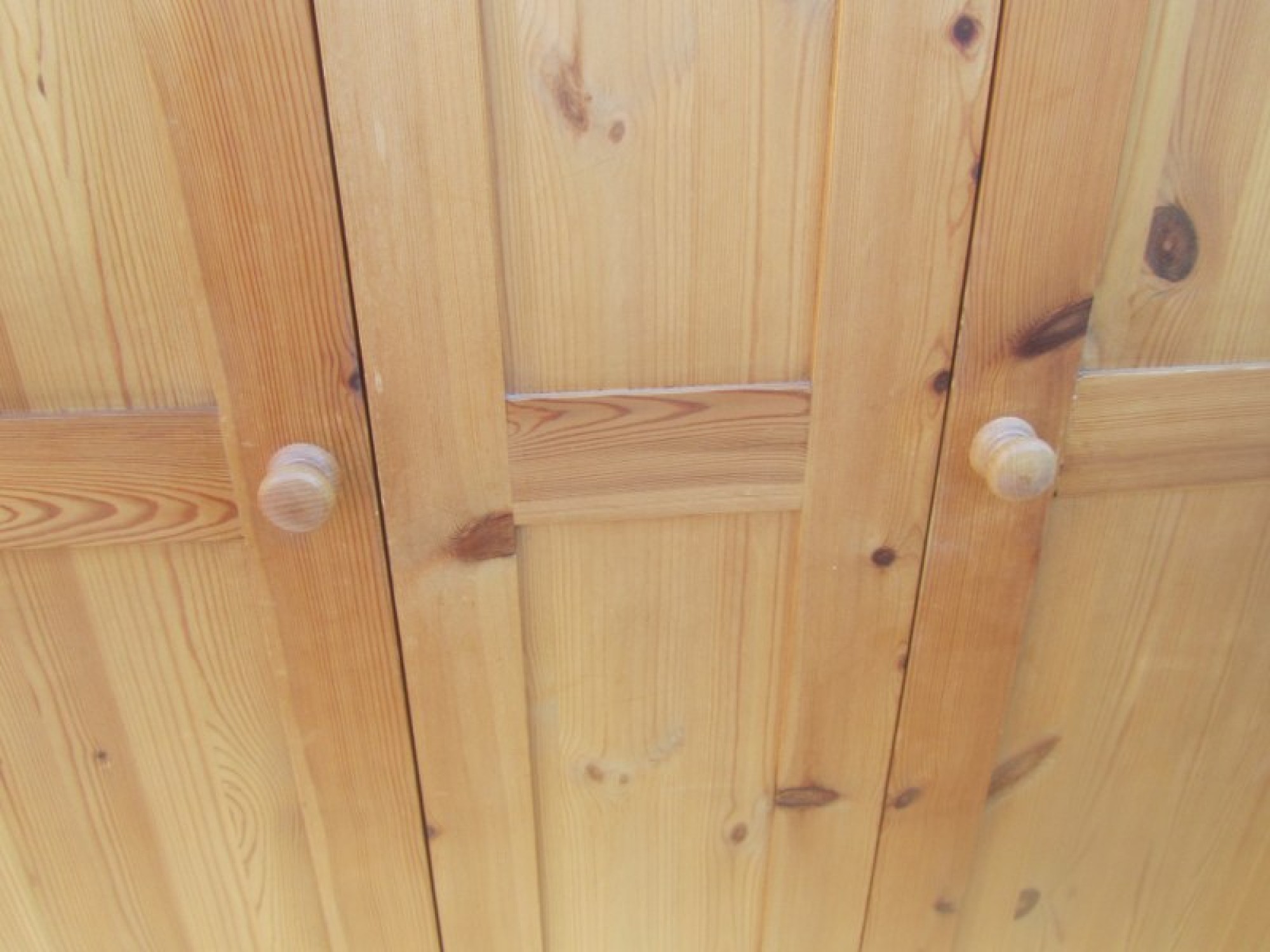 THIS IS SOLID PINE. IT IS A 2 DOOR DOUBLE WARDROBE WITH A PANEL IN THE MIDDLE. RAIL AT THE TOP. SOLID PINE. IT IS IN 1 LARGE PART, THE TOP AND BOTTOM PLINTH SEPARATE. IT CAN BE DISMANTLED FURTHER. GOOD QUALITY, IN GOOD CONDITION.