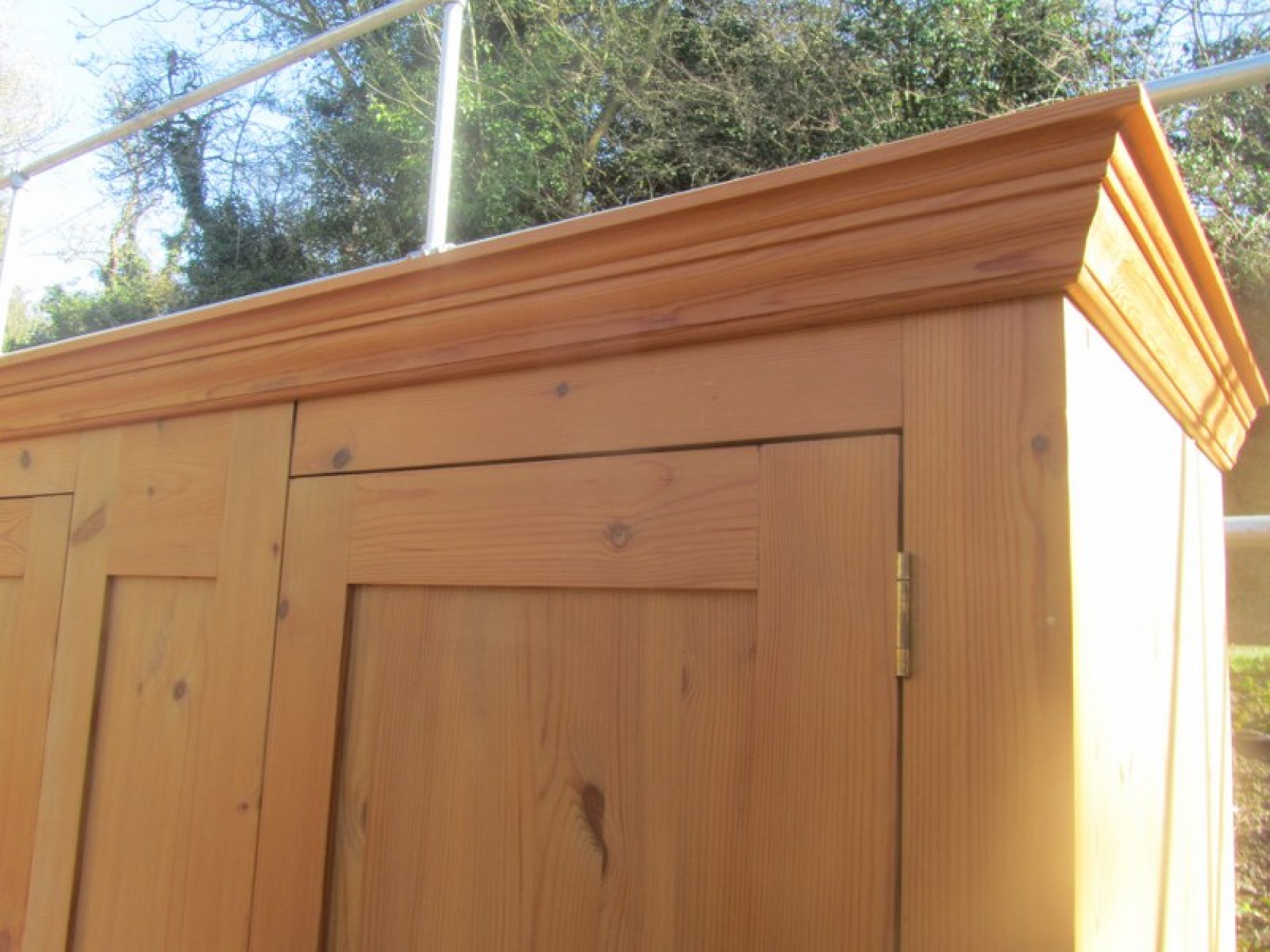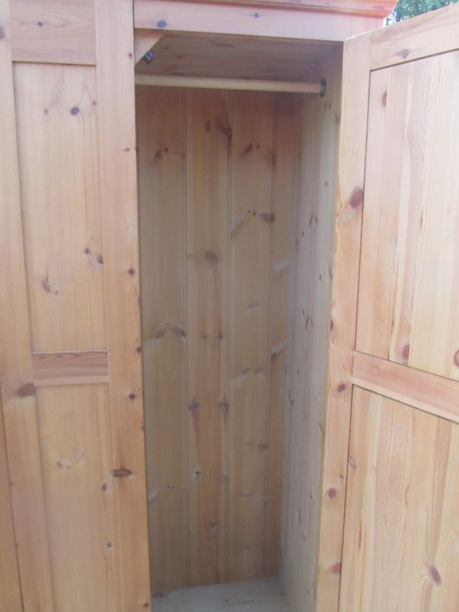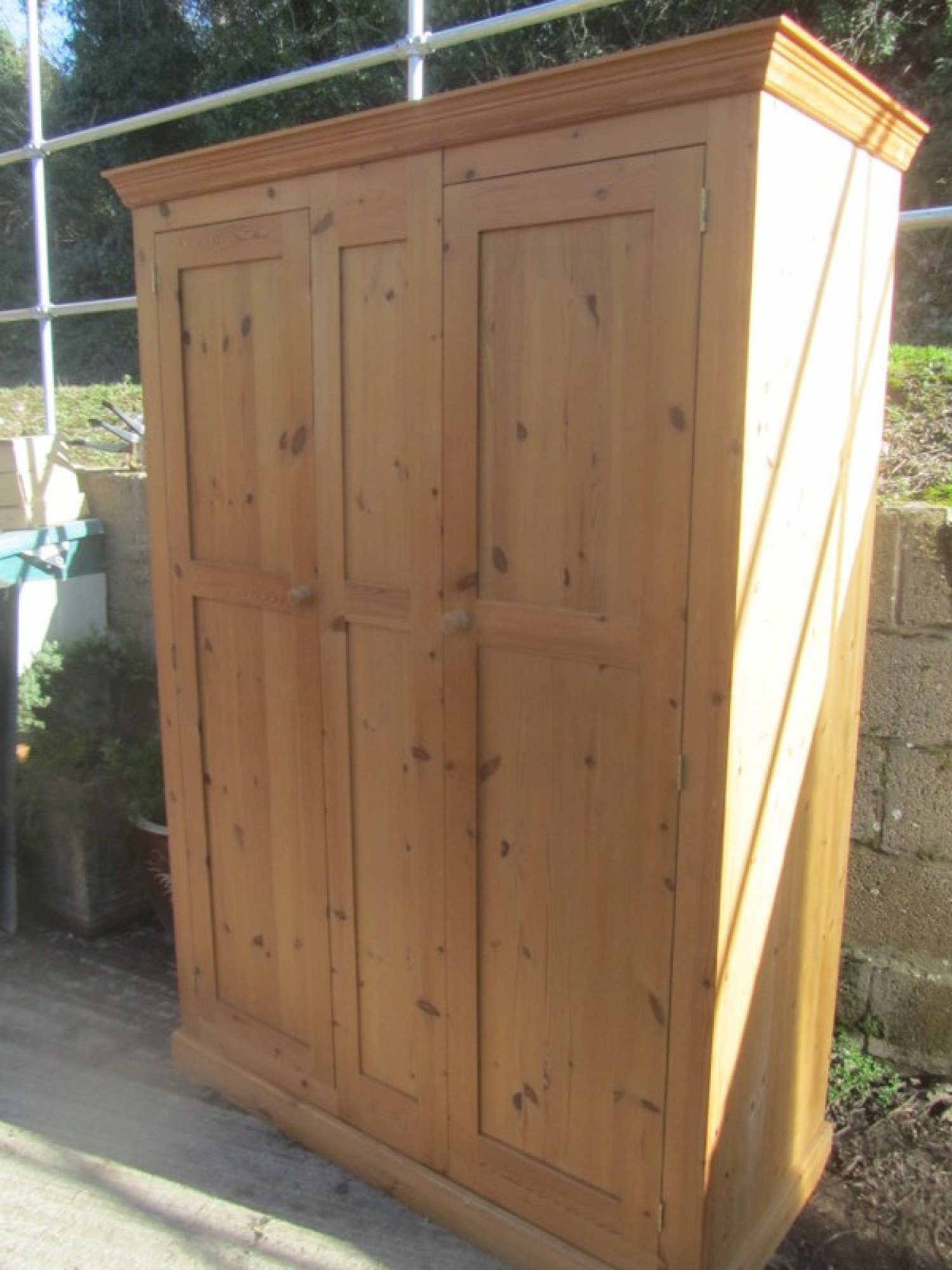 THIS IS SOLID PINE. IT IS A 2 DOOR DOUBLE WARDROBE WITH A PANEL IN THE MIDDLE. RAIL AT THE TOP. SOLID PINE. IT IS IN 1 LARGE PART, THE TOP AND BOTTOM PLINTH SEPARATE. IT CAN BE DISMANTLED FURTHER. GOOD QUALITY, IN GOOD CONDITION.