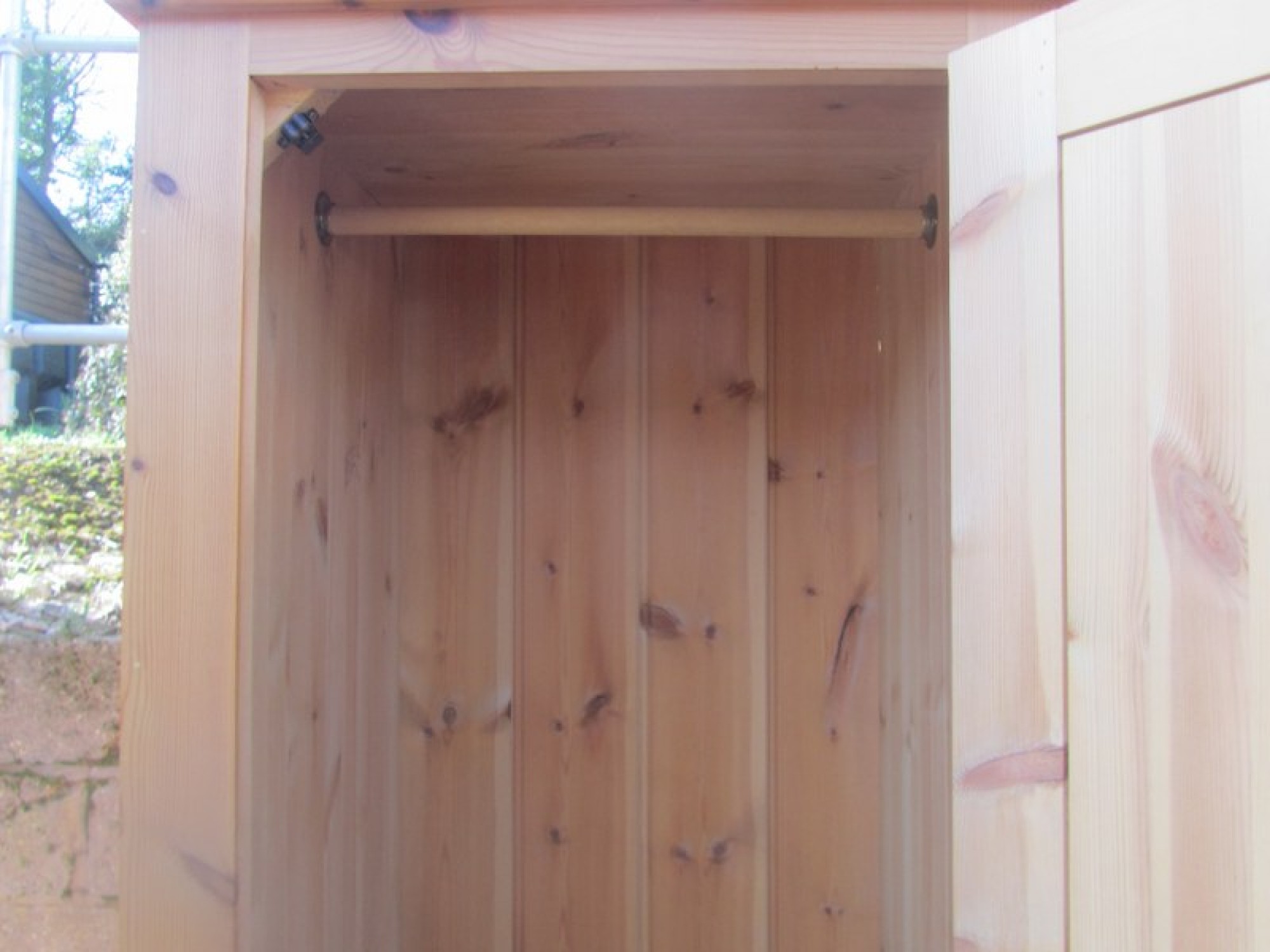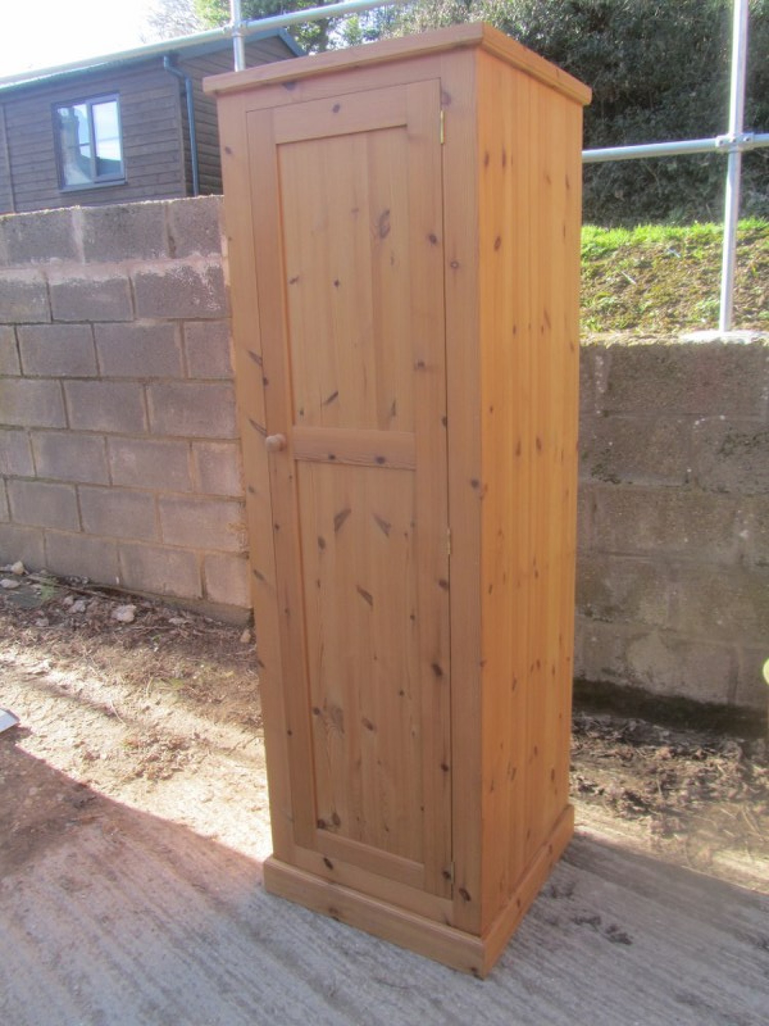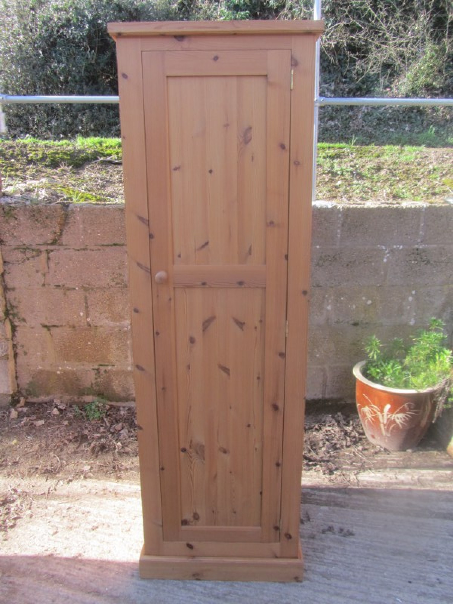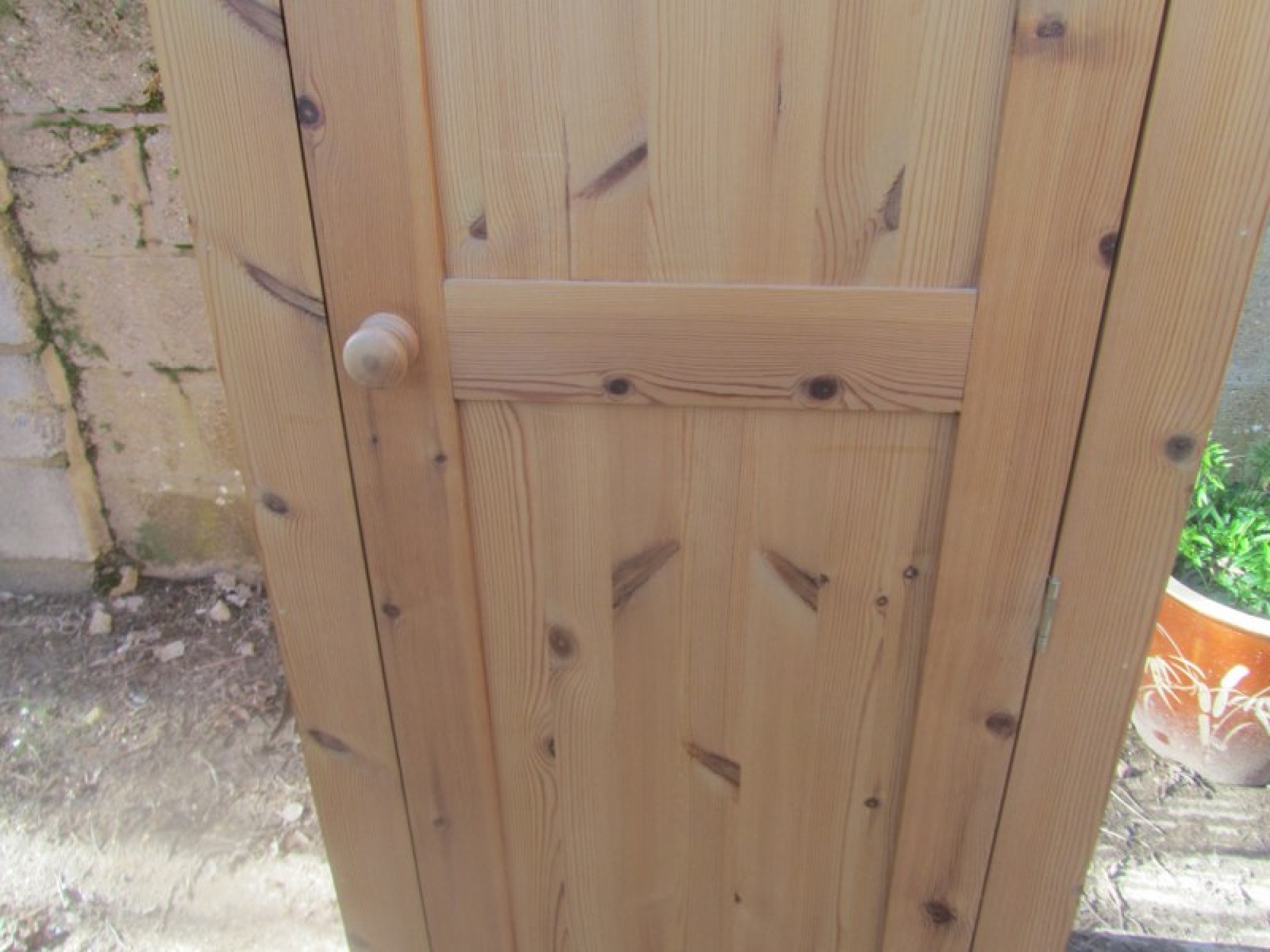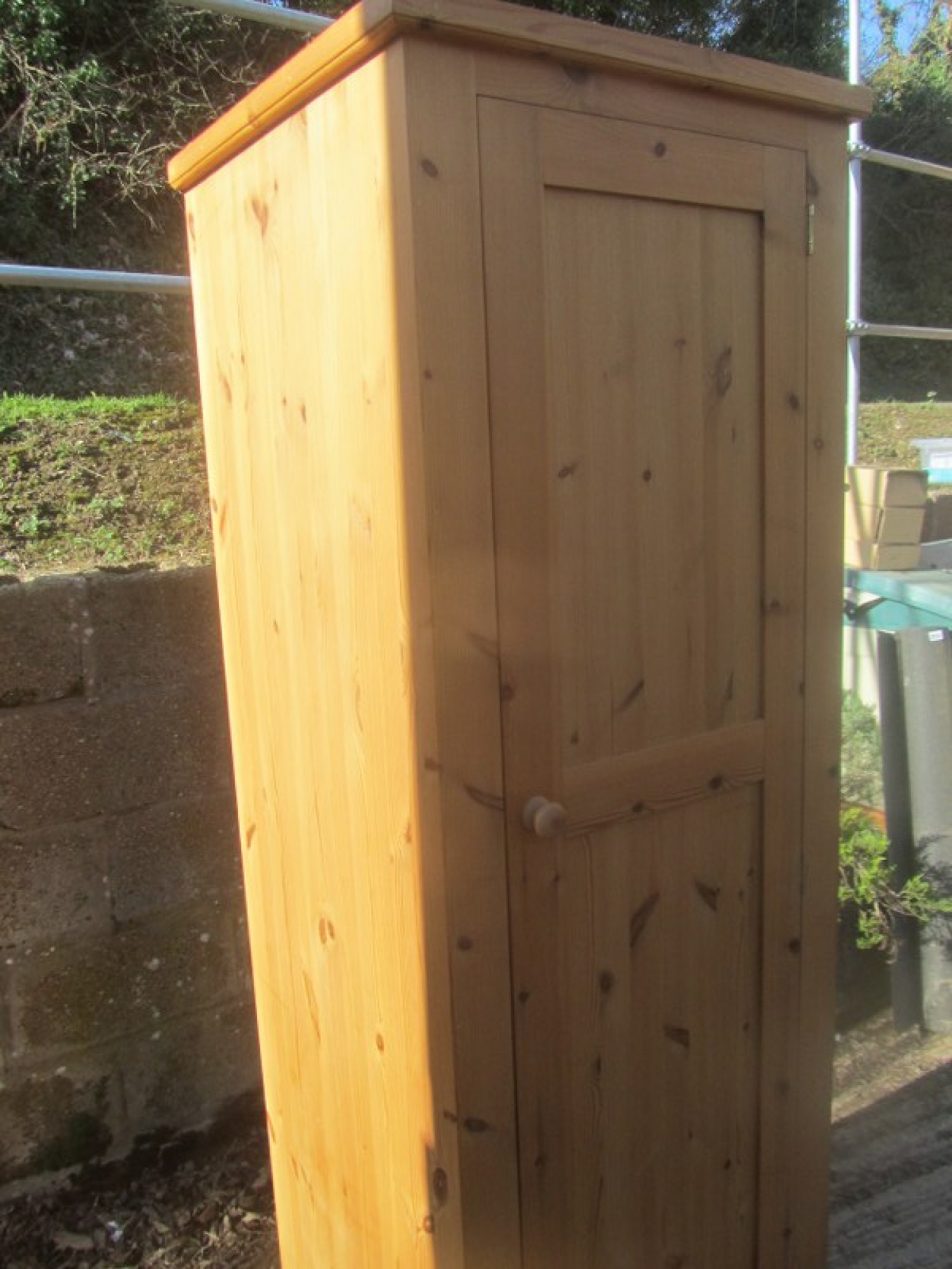 THIS IS SOLID PINE. IT IS A NARROW WARDROBE WITH A RAIL AT THE TOP. THE DOOR OPENS FROM THE LEFT.