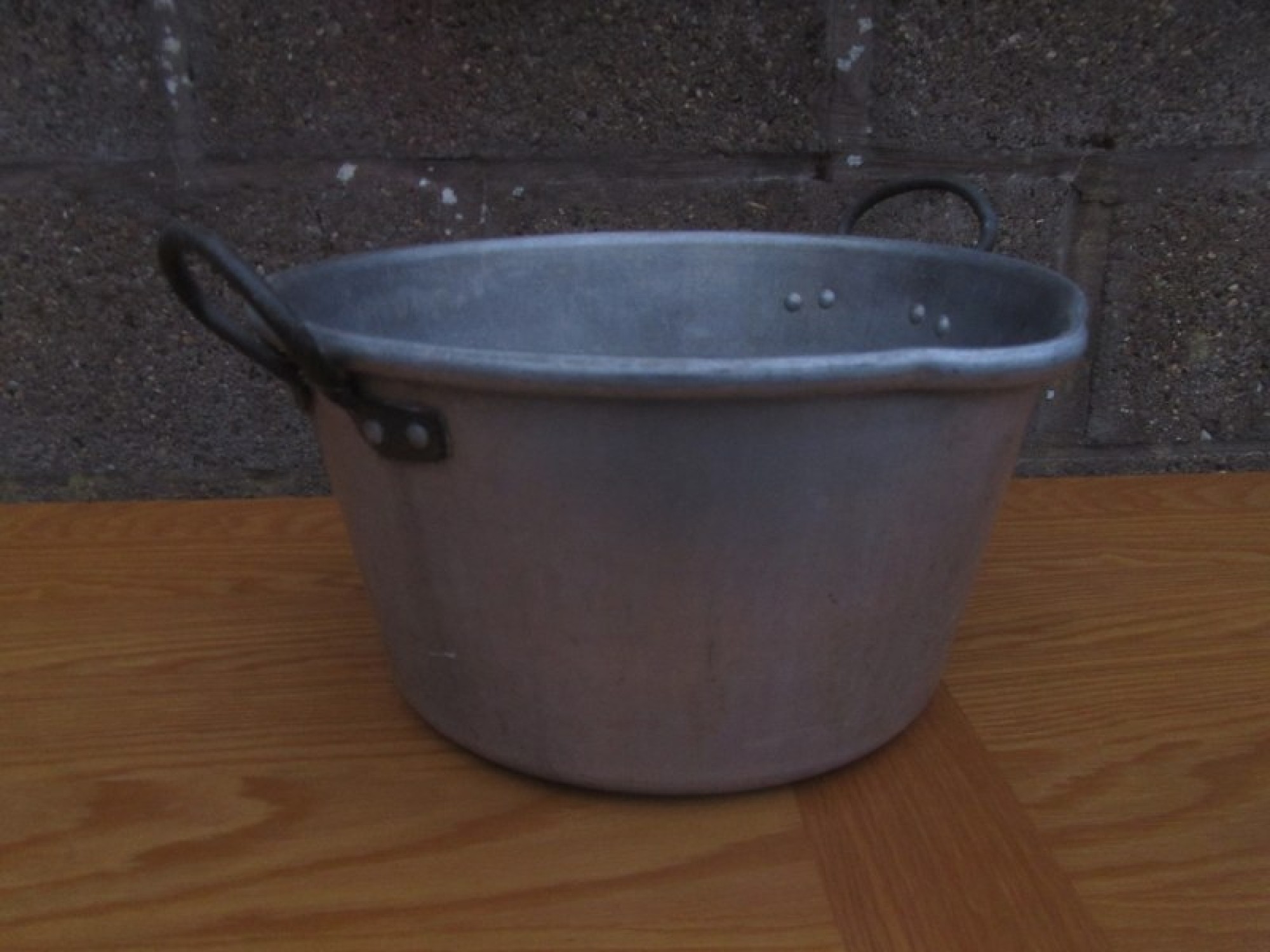A LARGE VINTAGE ALUMINIUM JAM PAN, ALSO AN IDEAL PLANTER. SOME WEAR AND MARKS.
