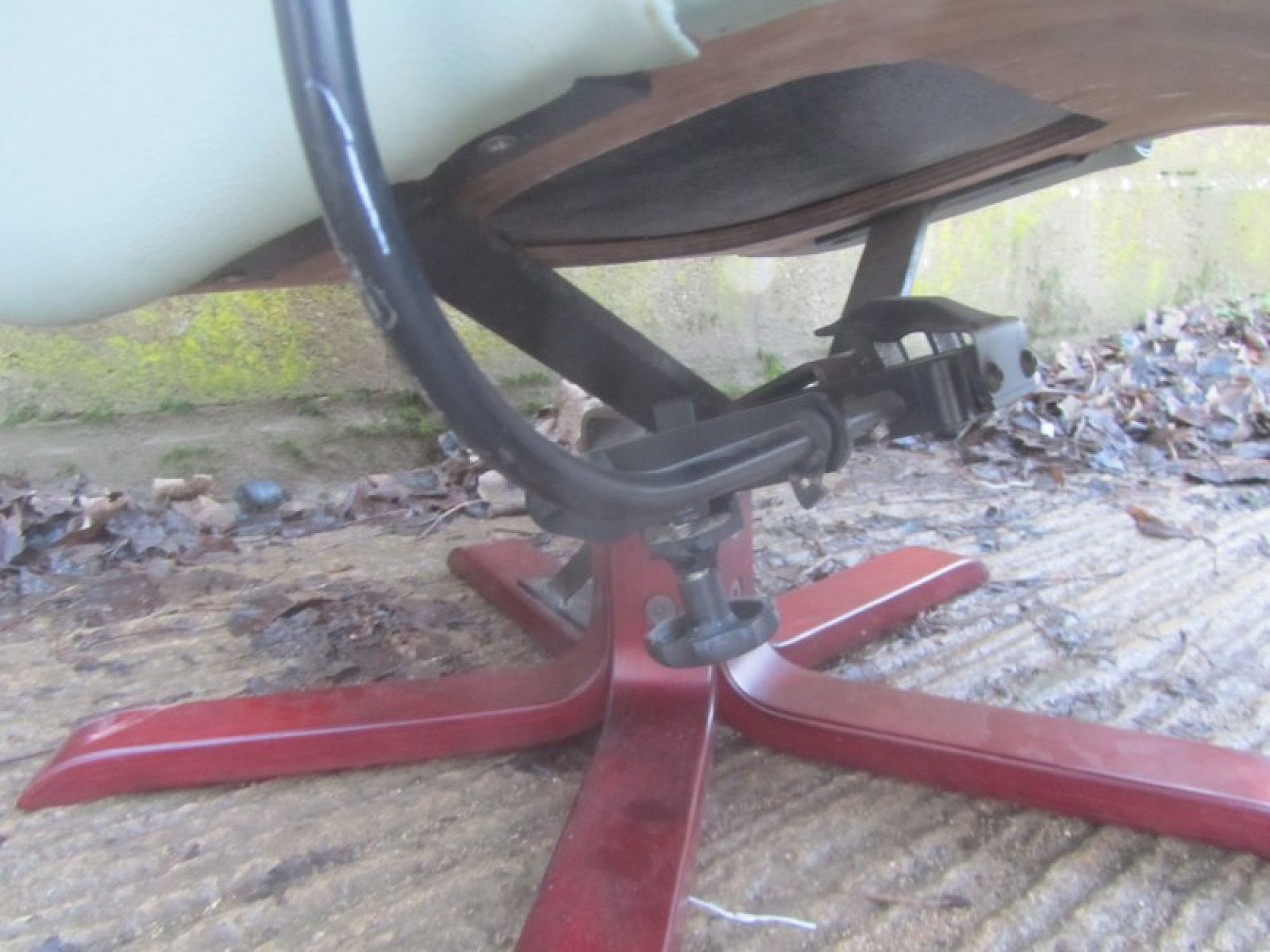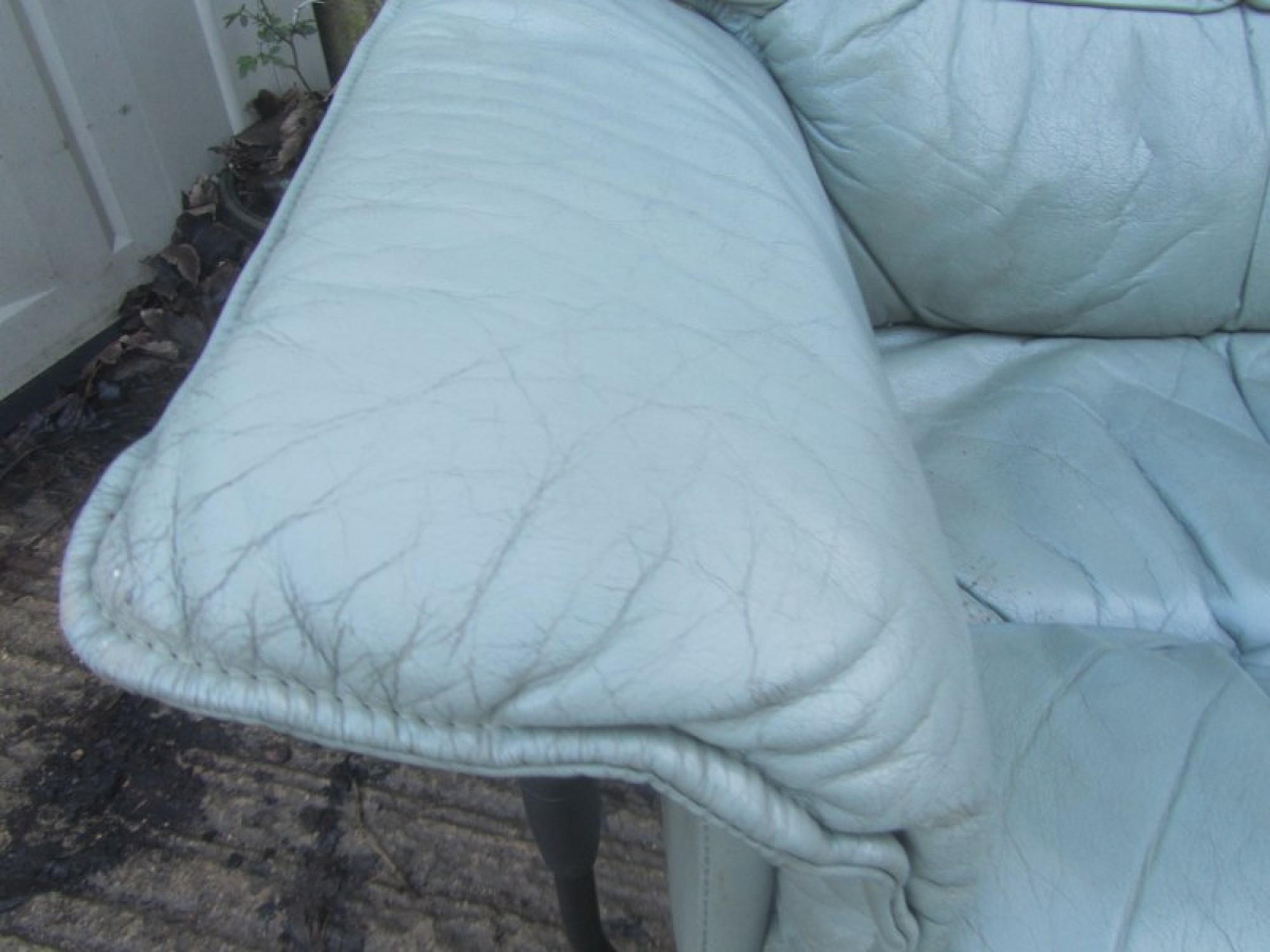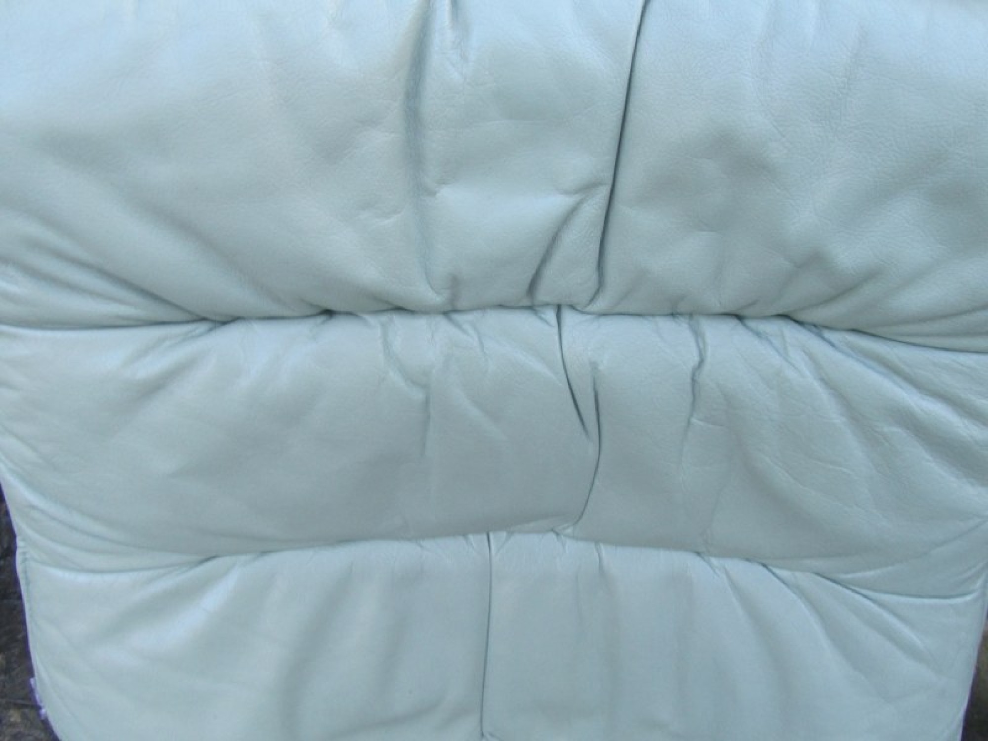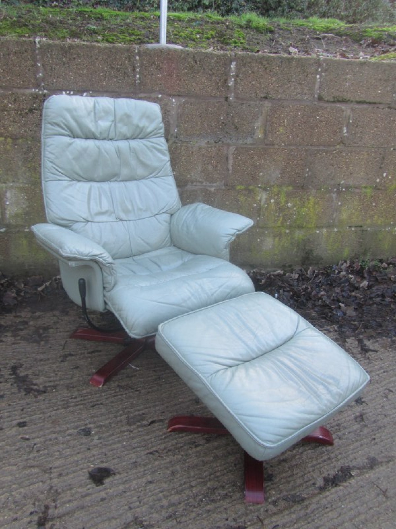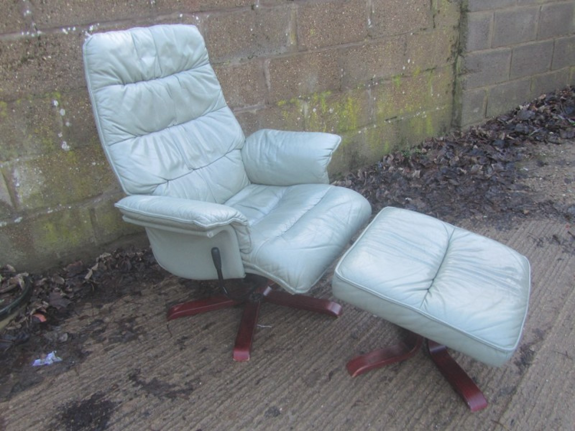 THIS IS AN ARMCHAIR IN LEATHER EFFECT. IT IS CLEAN AND COMFORTABLE. THE CHAIR SWIVELS AND RECLINES, THERE IS A FOOT STOOL THAT FITS NEATLY UP TO THE ARMCHAIR. A STYLISH CHAIR, COMFORTABLE. THERE IS SOME FADING AND WEAR.