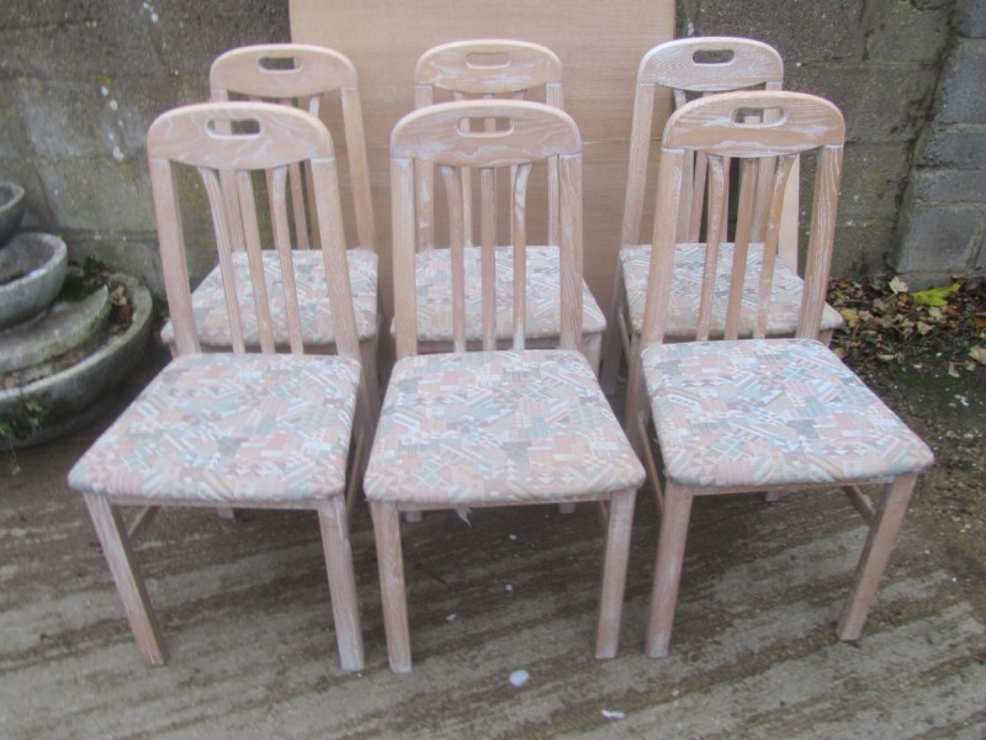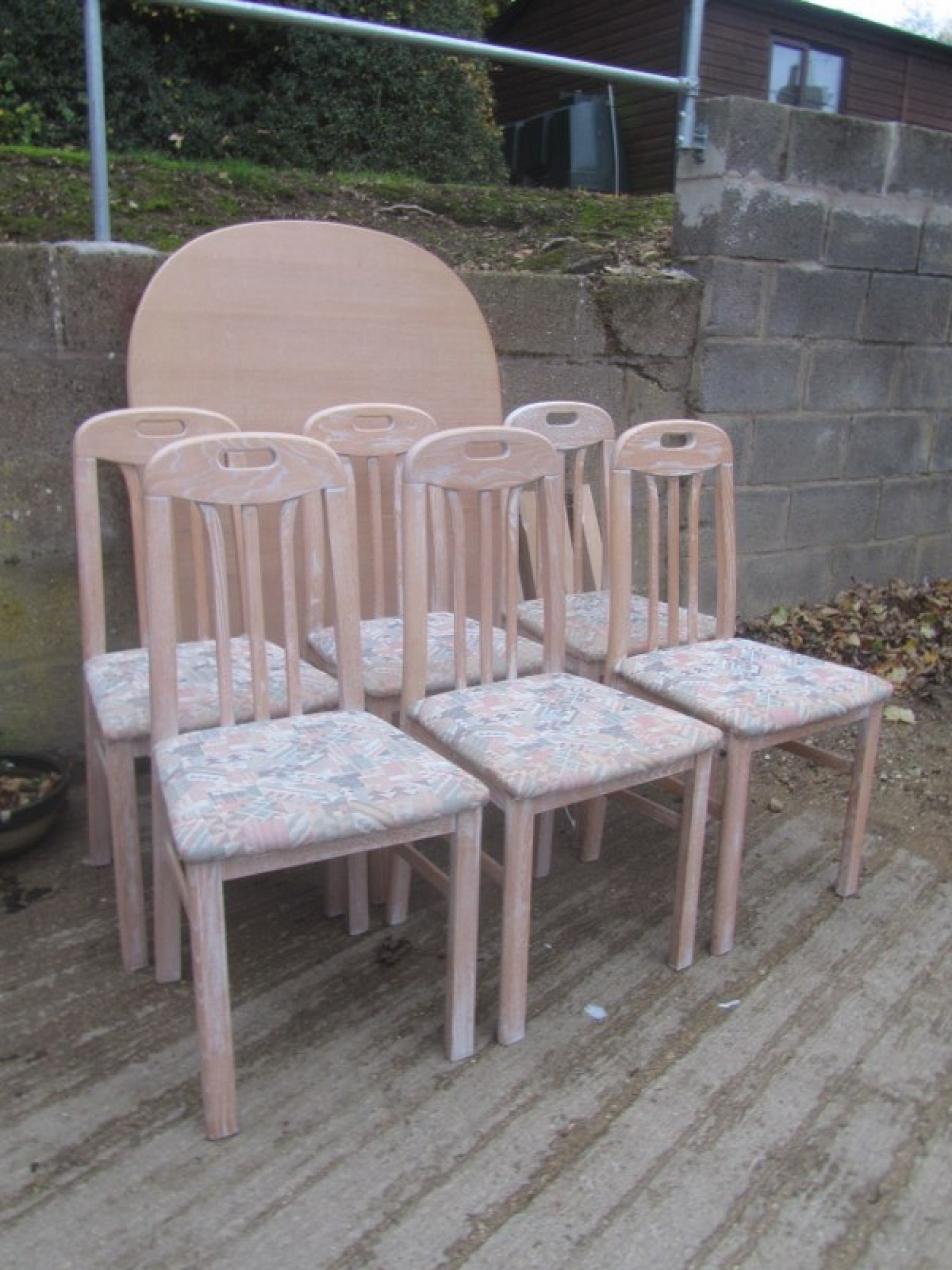 THIS IS A STRONG AND STURDY DINING TABLE WITH 6 CHAIRS. THE CHAIRS ARE SOLID BEECH IN A LIMED FINISH. THEY HAVE WOODEN BACKS AND PADDED SEATS. STRONG AND STURDY CHAIRS. SOME DISCOLOURATION TO SOME OF THE MATERIAL.