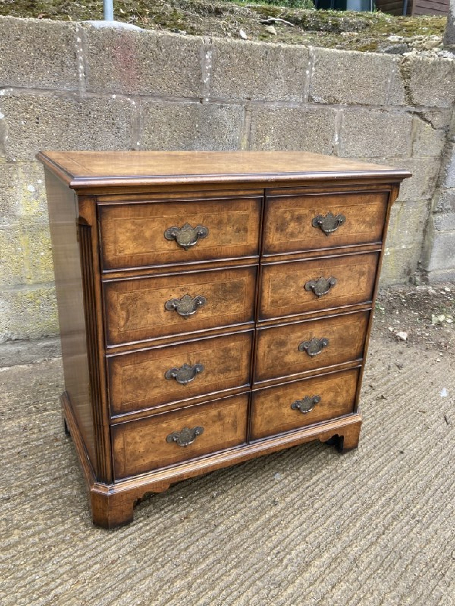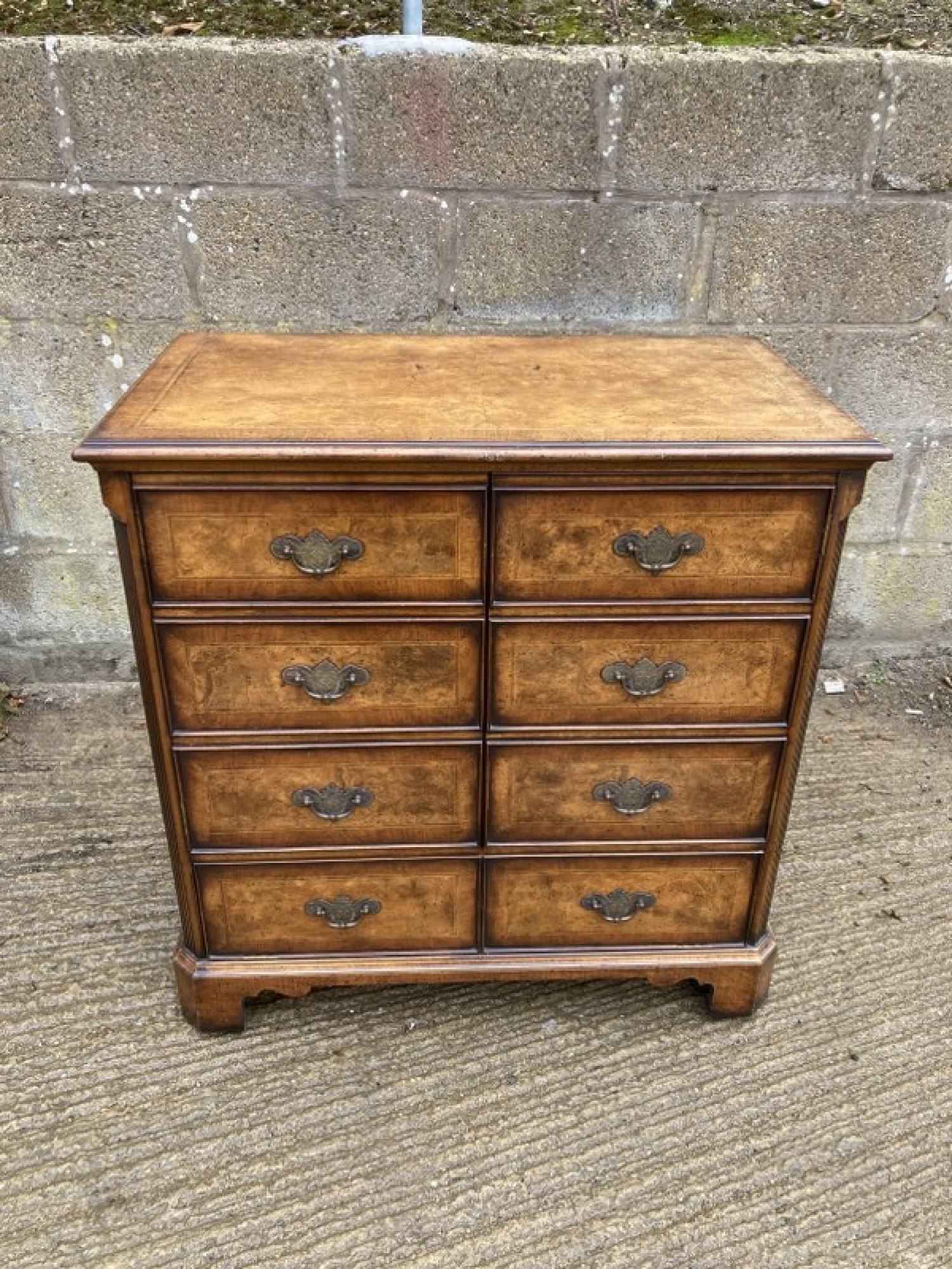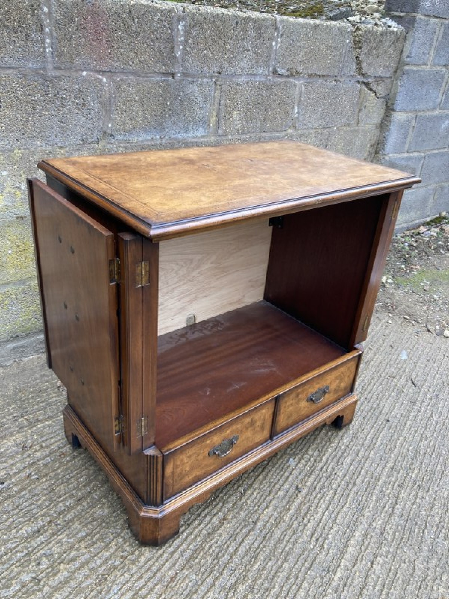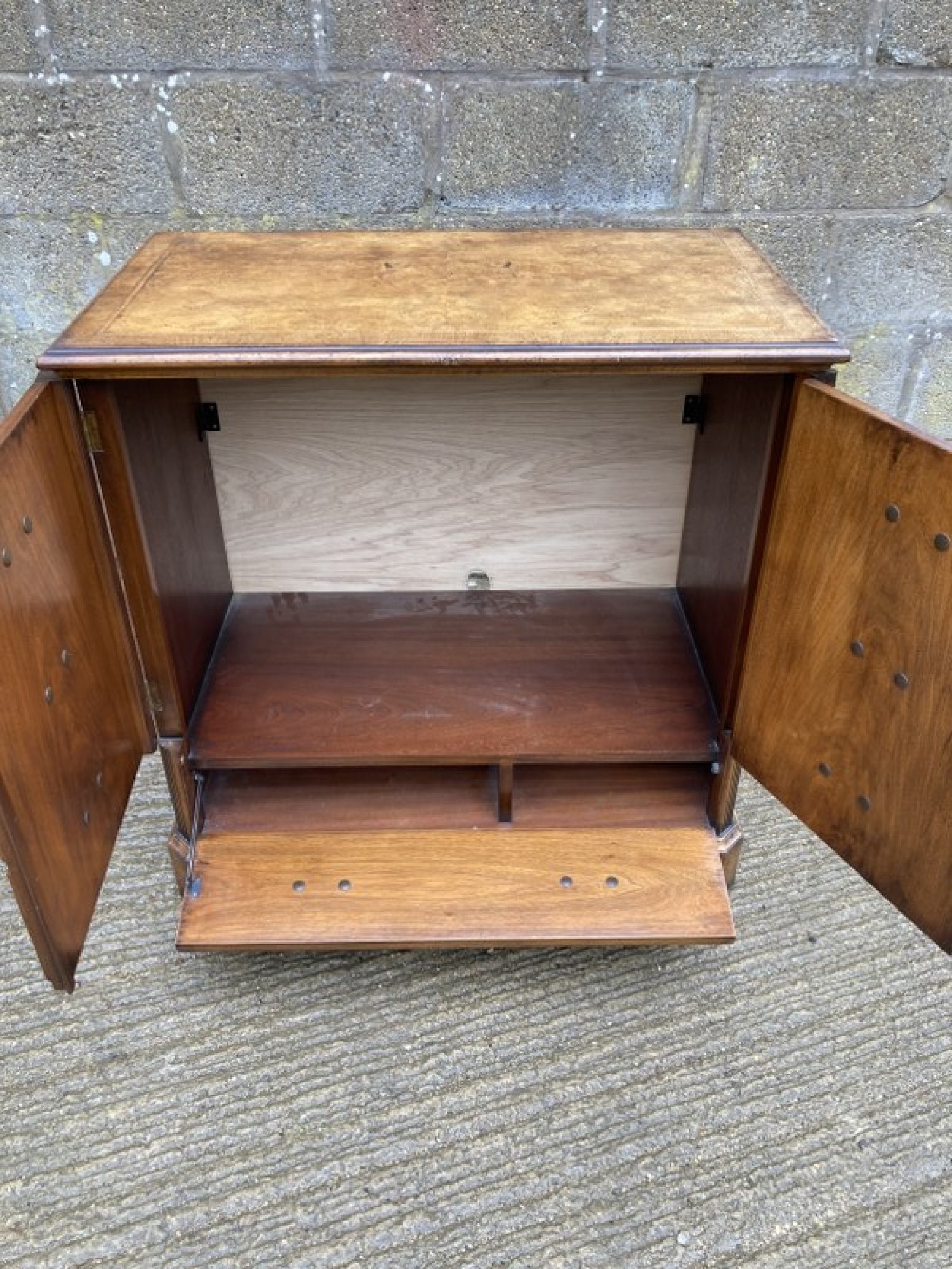 THIS IS A WALNUT VENEER CABINET. AT THE BOTTOM THERE IS A DROP DOWN DOOR FOR STORAGE. THE MAIN DOORS FOLD BACK FLUSH WITH THE SIDES. THE CABINET IS IN GOOD CONDITION. GOOD QUALITY.