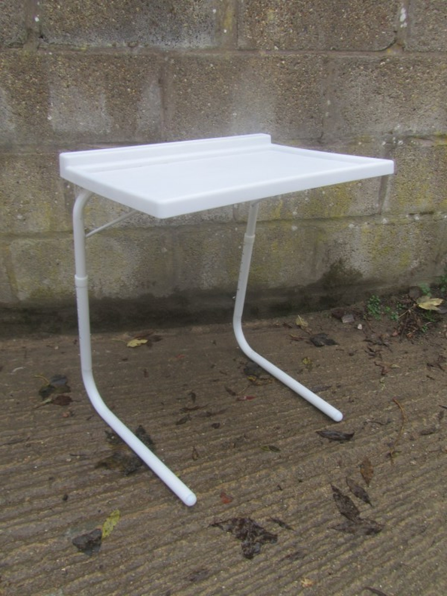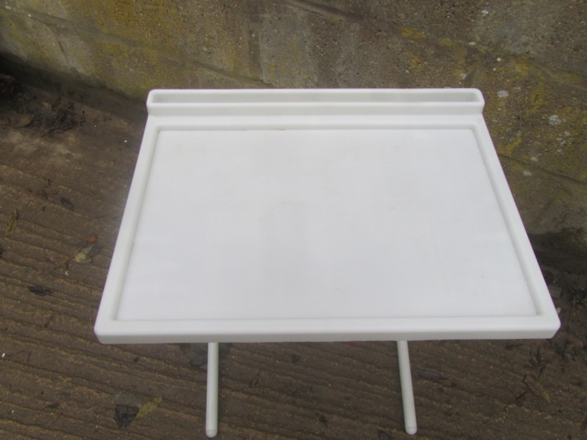 A METAL FRAMED TABLE WITH PLASTIC TRAY TOP. ADJUSTABLE ANGLE AND HEIGHT. BASIC CONSTRUCTION & QUALITY.