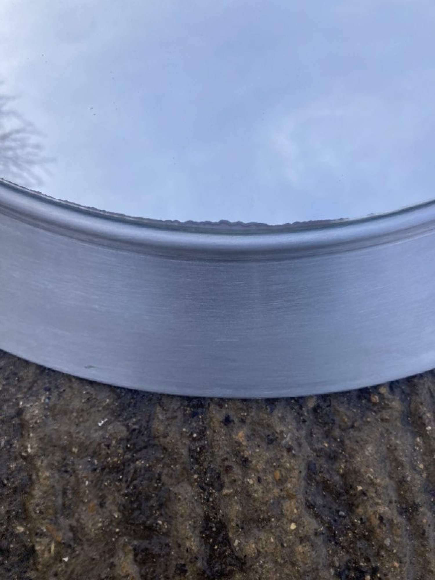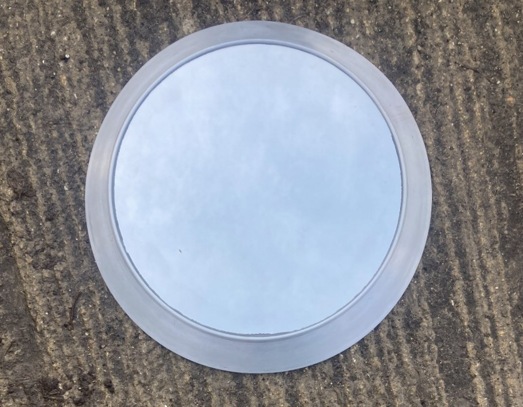A ROUND MIRROR. THE MIRROR IS IN AVERAGE CONDITION, SOME WEAR. THE FRAME IS METAL.