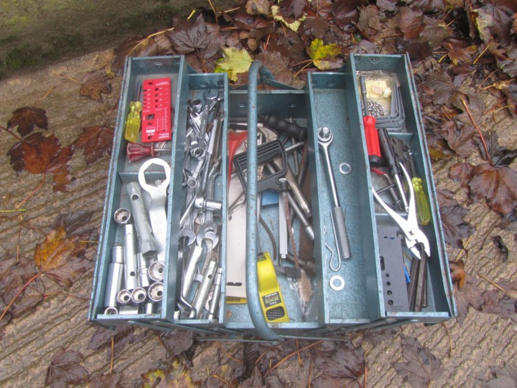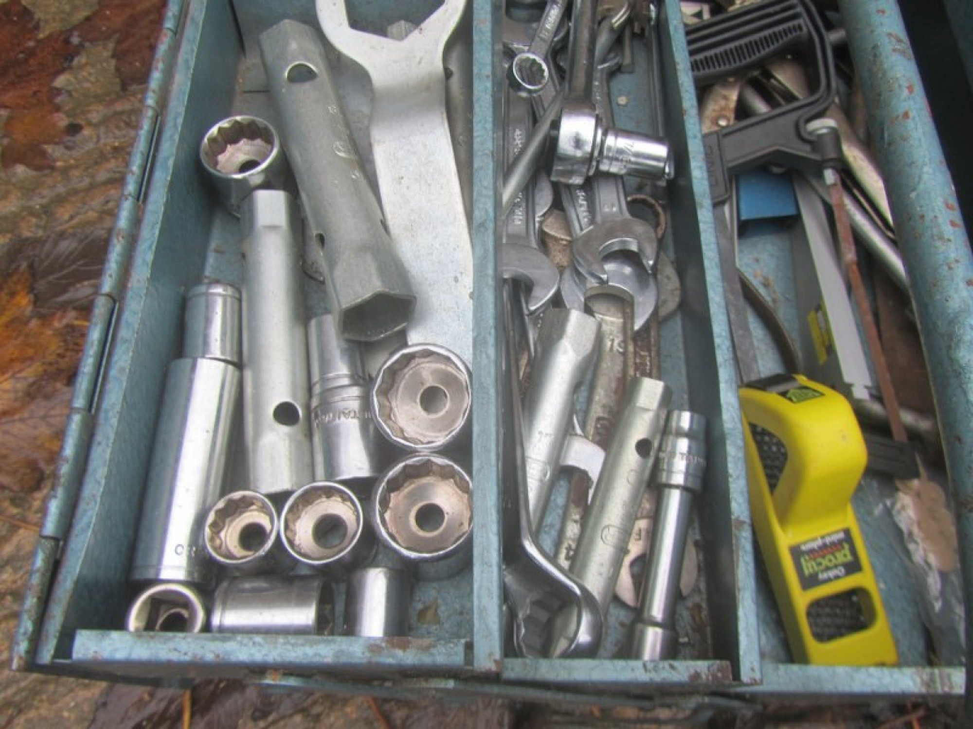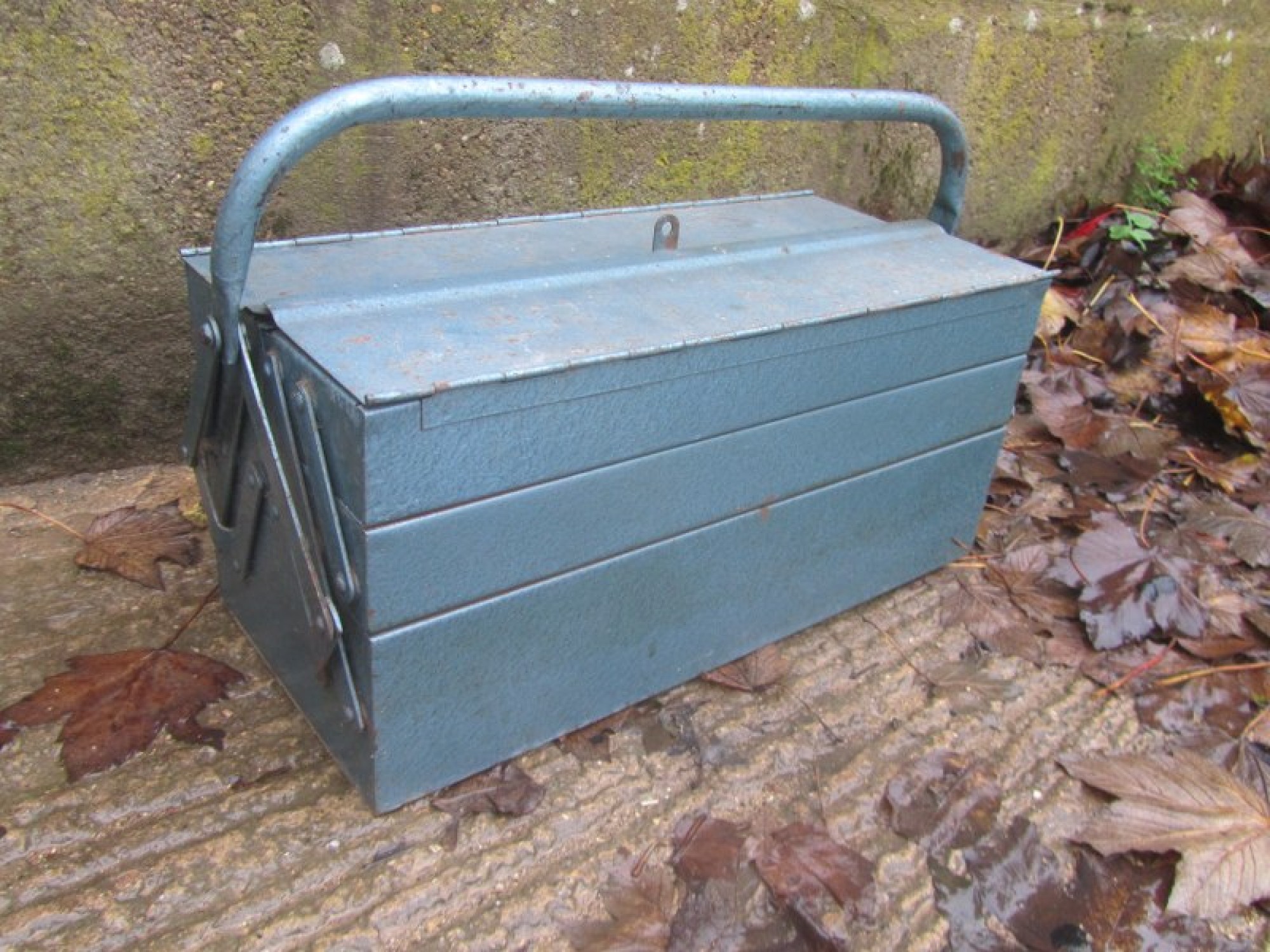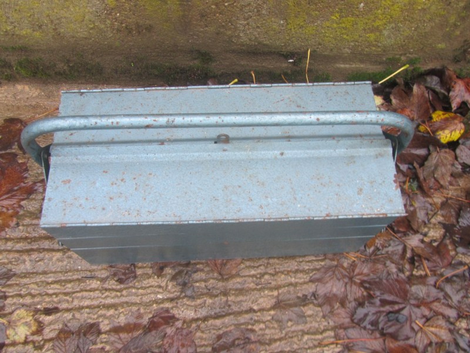 A STURDY METAL BOX WITH A LIFT UP LID. RUST AND WEAR, STRONG AND STURDY. INCLUDES TOOLS.