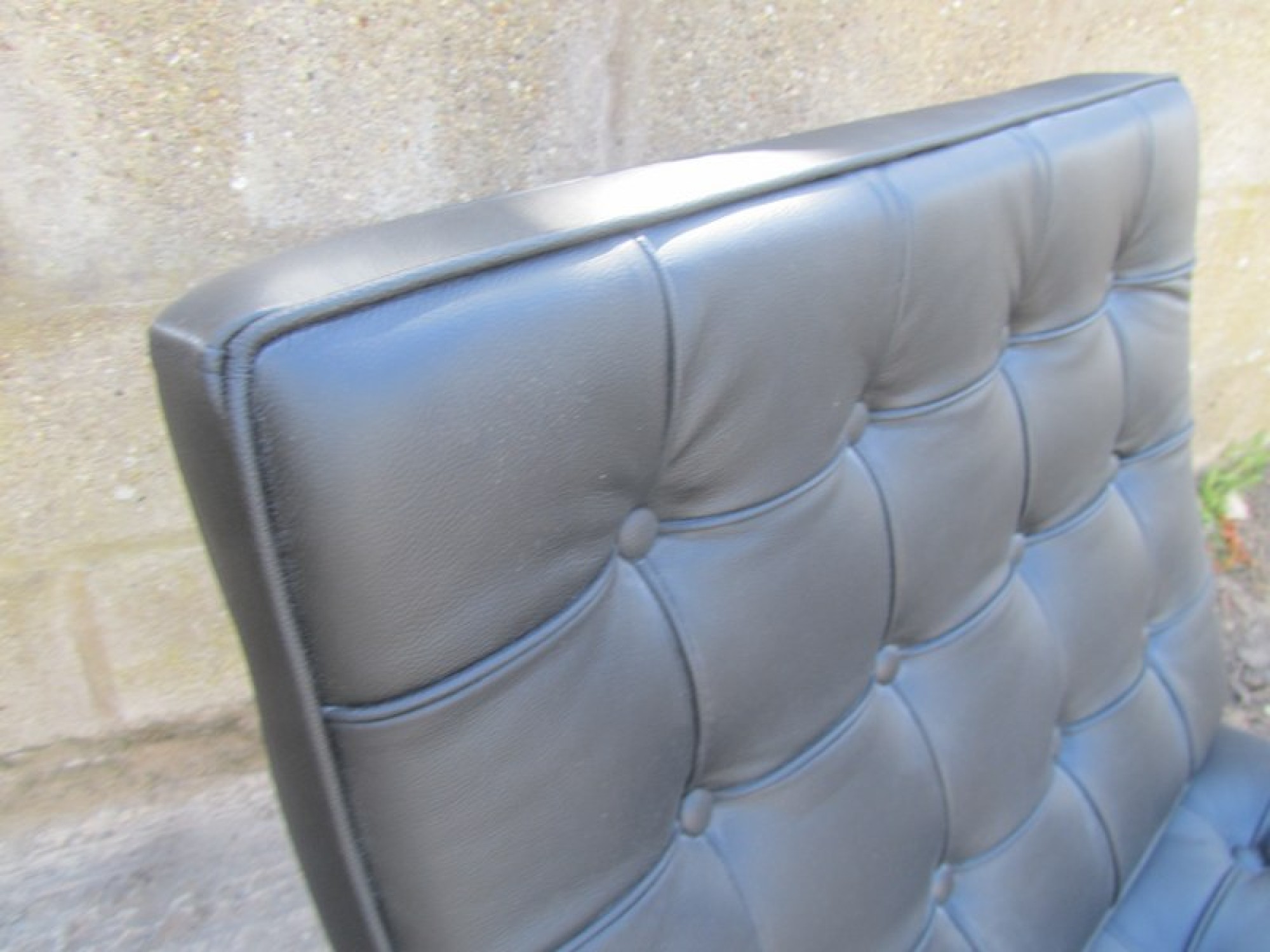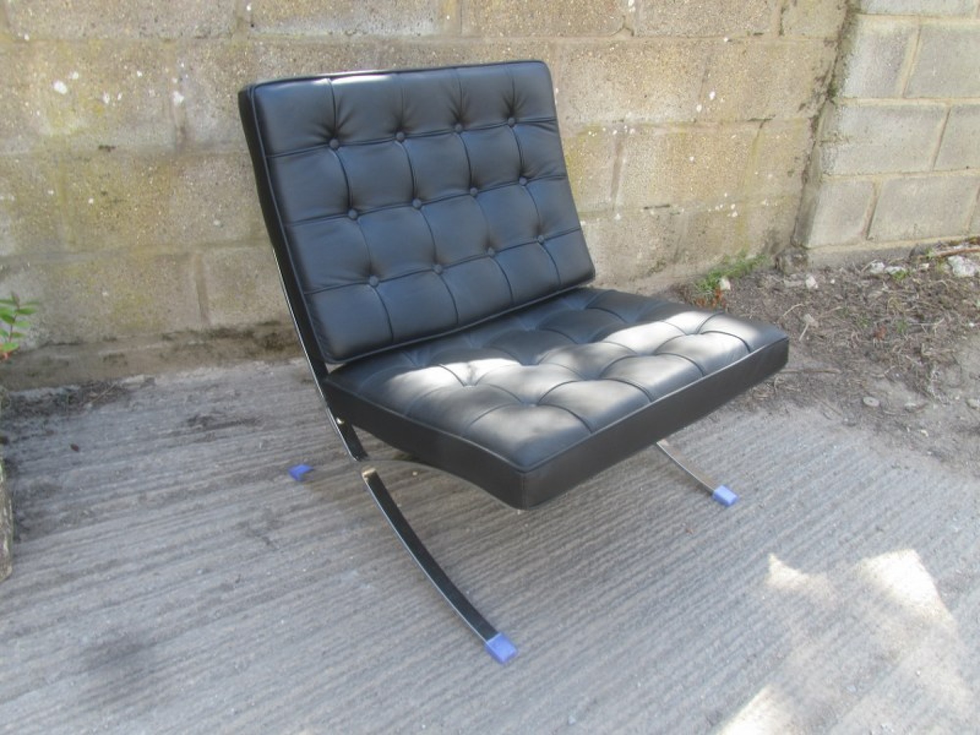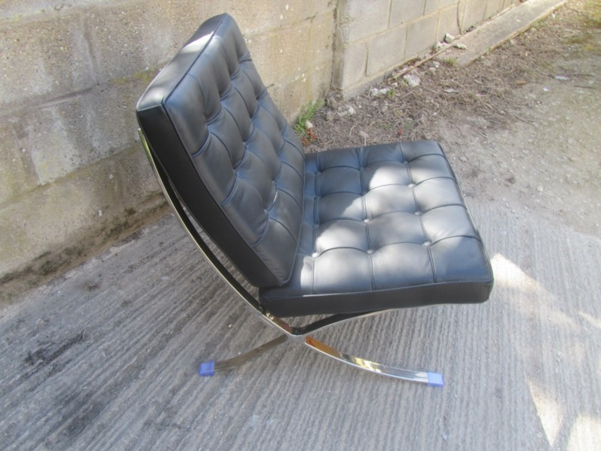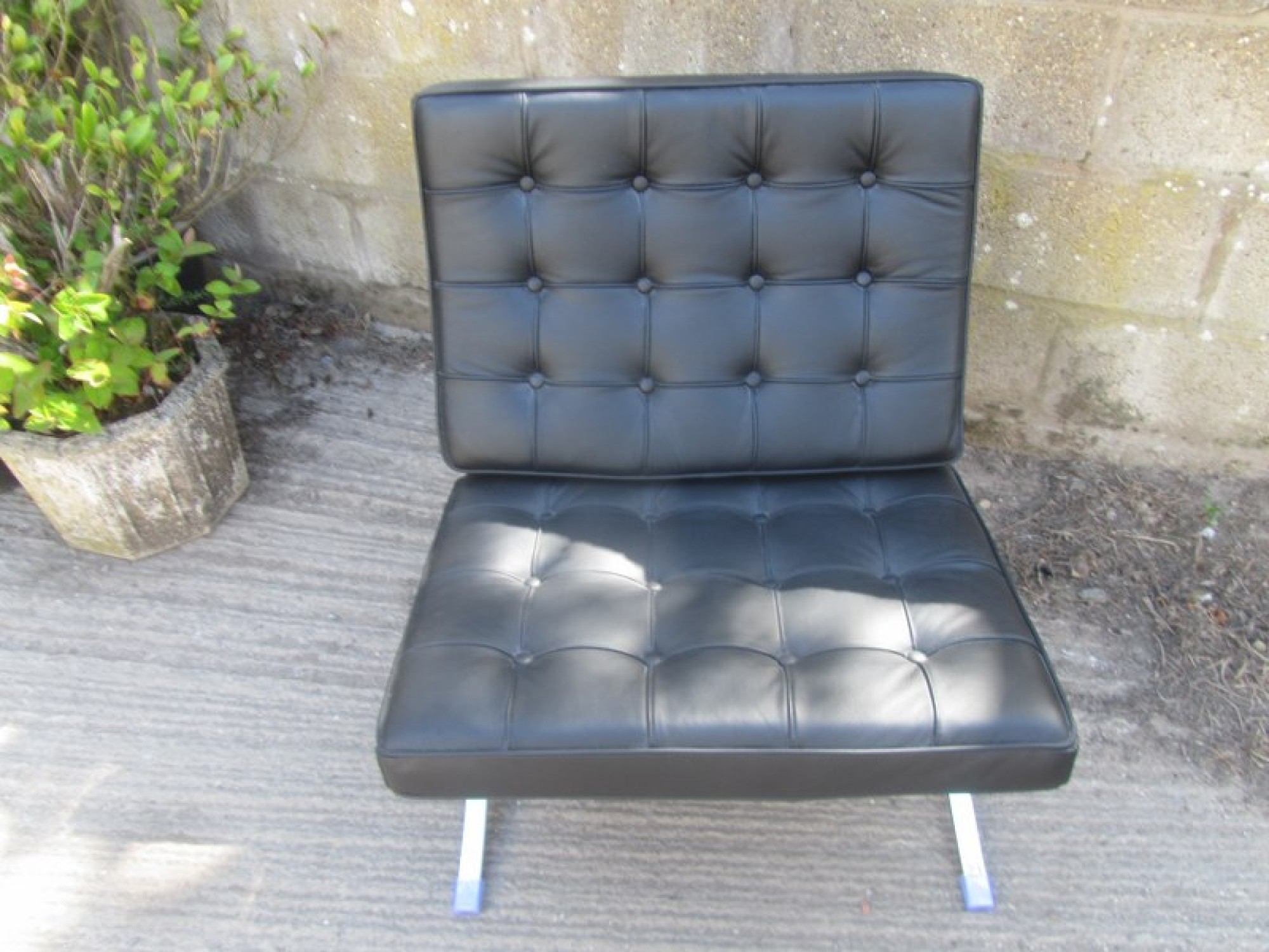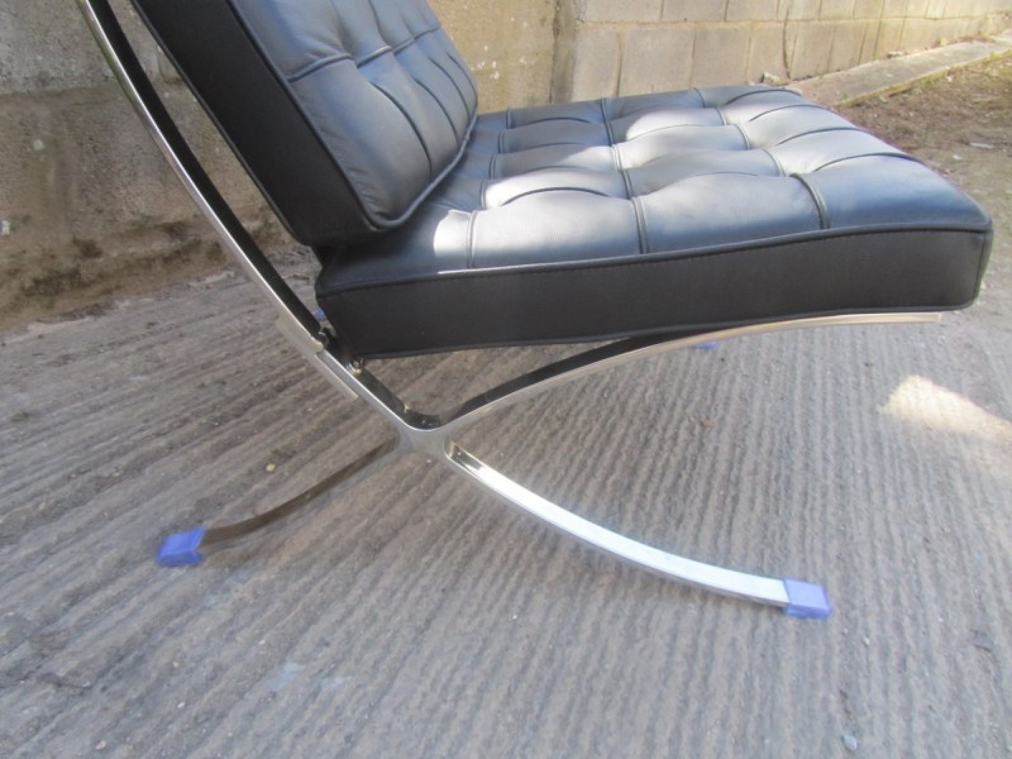 A MODERN CHAIR IN THE STYLE OF THE CLASSIC 'BARCELONA' CHAIR. CHROME METAL FRAME, LEATHER EFFECT PADDED SEAT. SEAT HEIGHT IS 42cm.