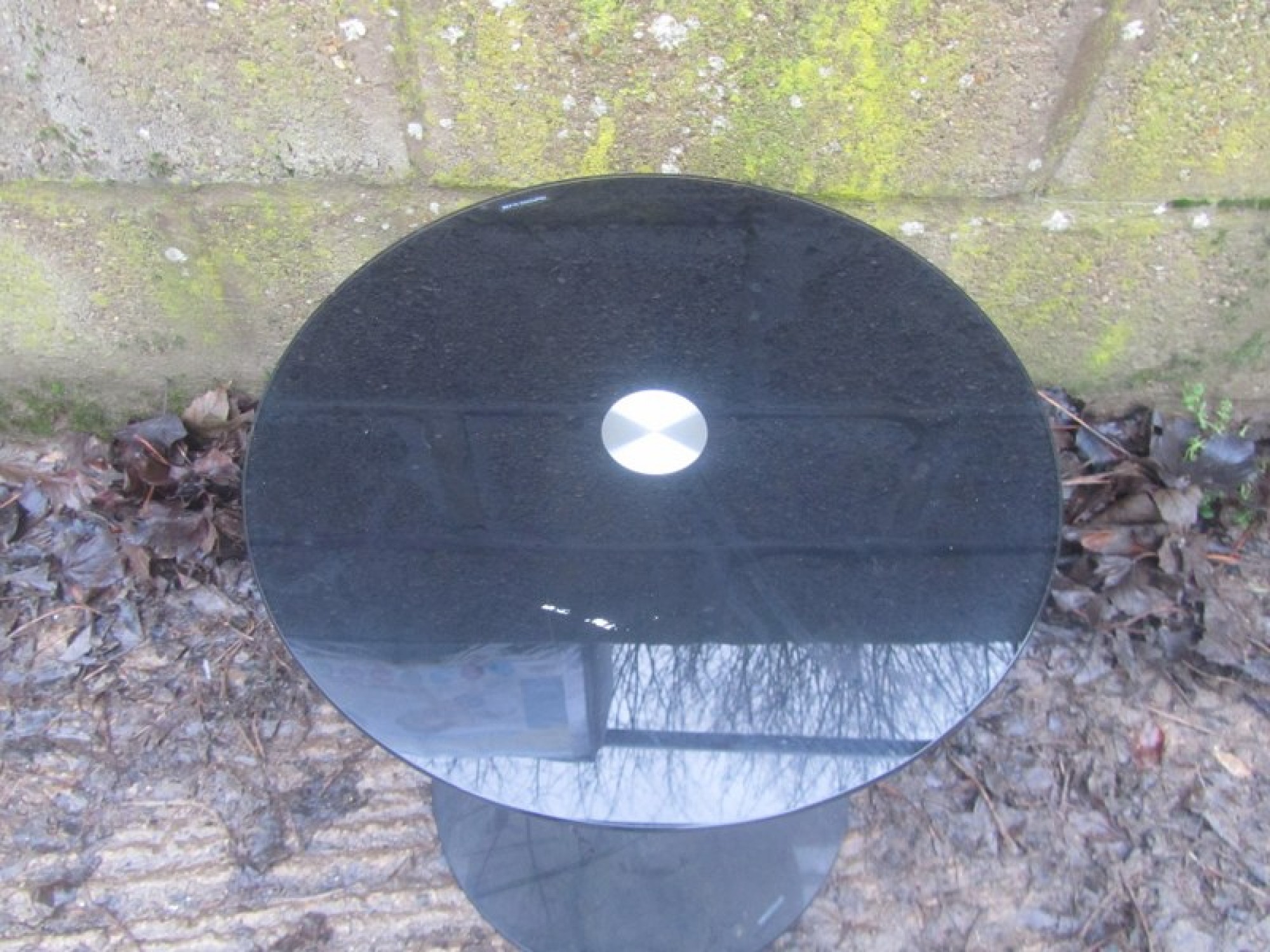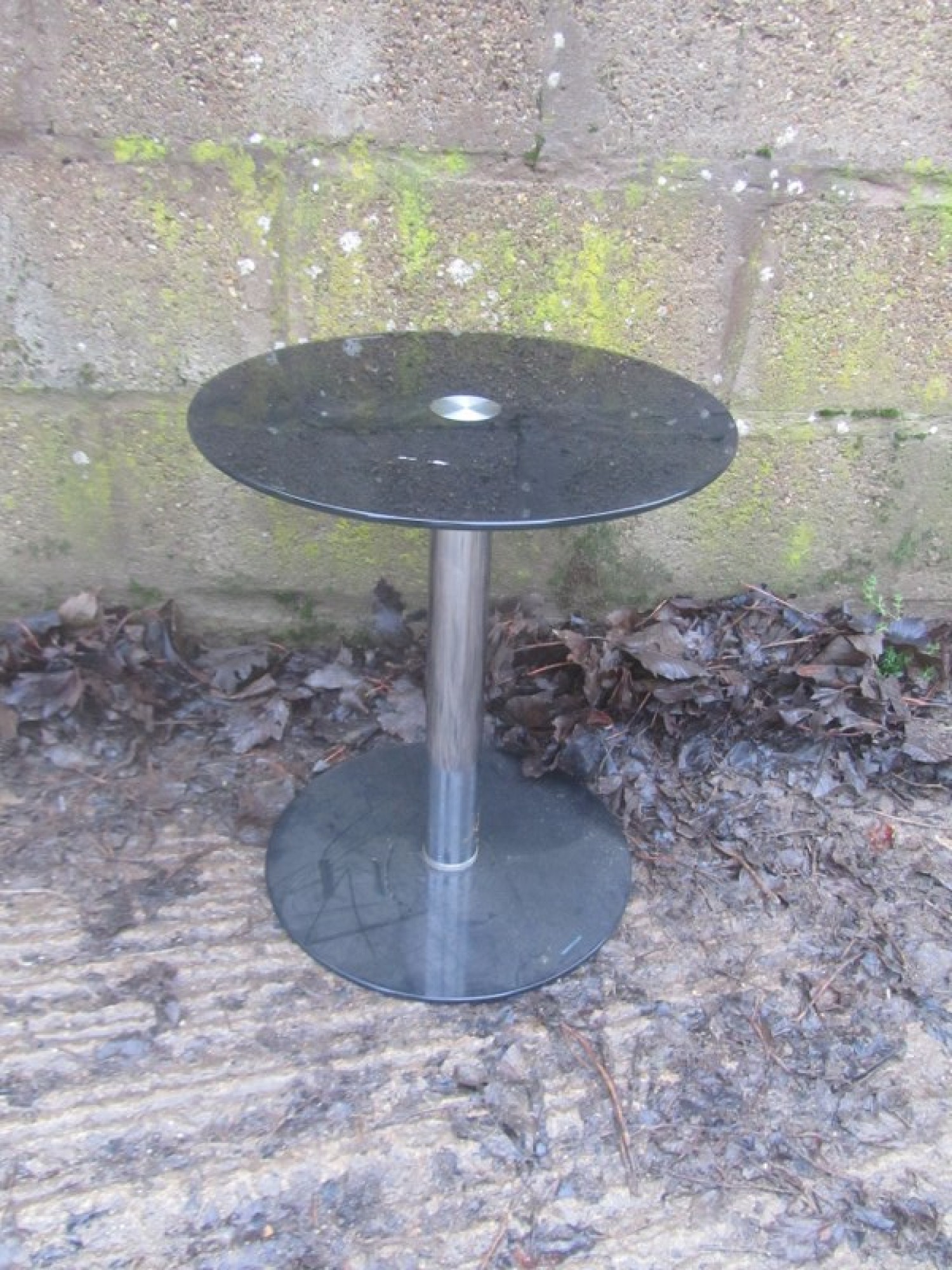 A SMALL TABLE, METAL LEGS. MADE OF STRONG TOUGHENED BLACK GLASS.