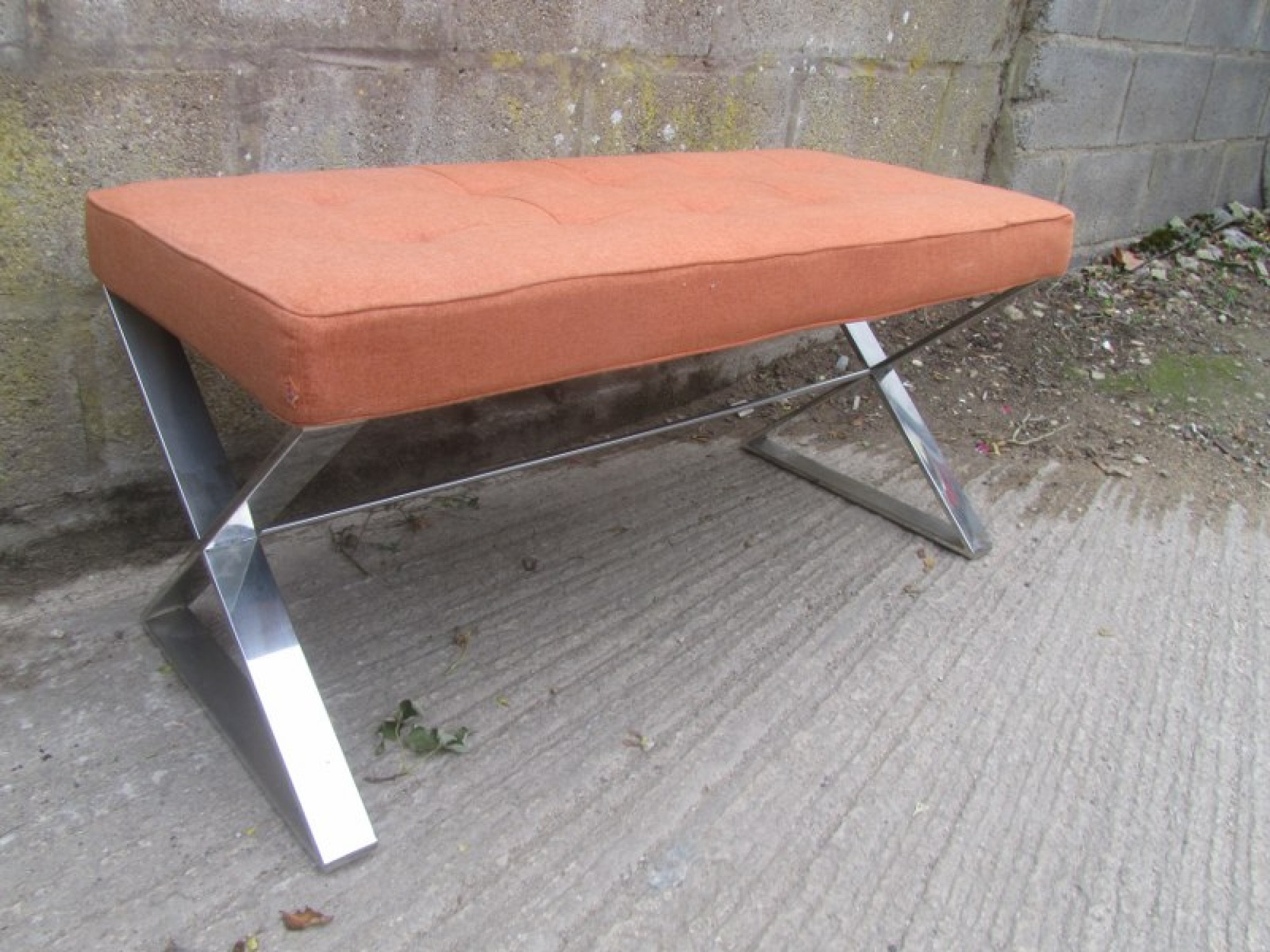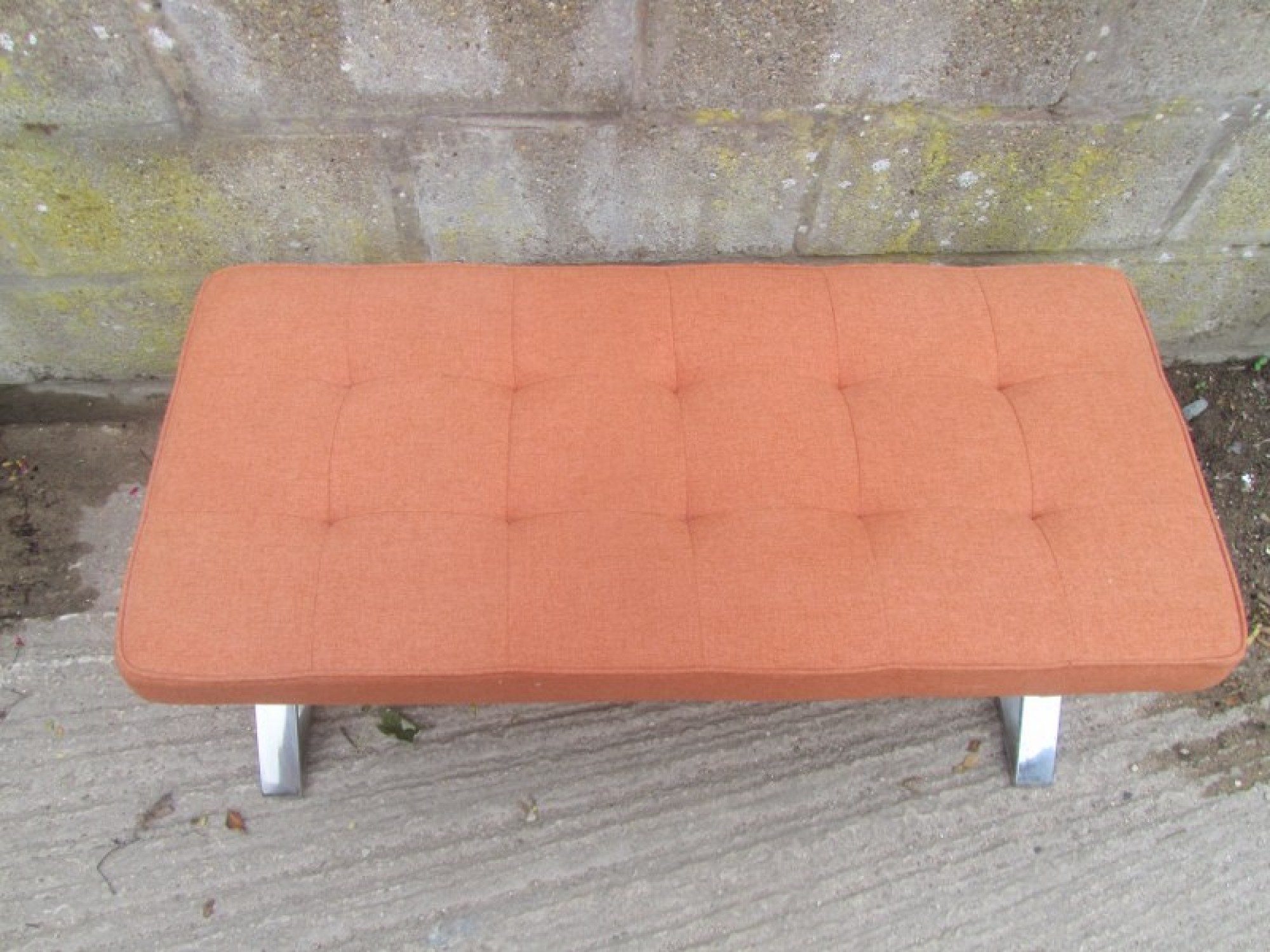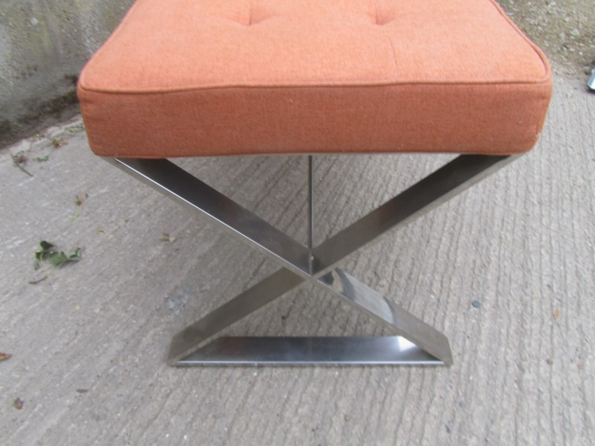 A PADDED FOOT STOOL, UPHOLSTERED IN MATERIAL. STURDY CHROME METAL FRAME. IN A RETRO STYLE.