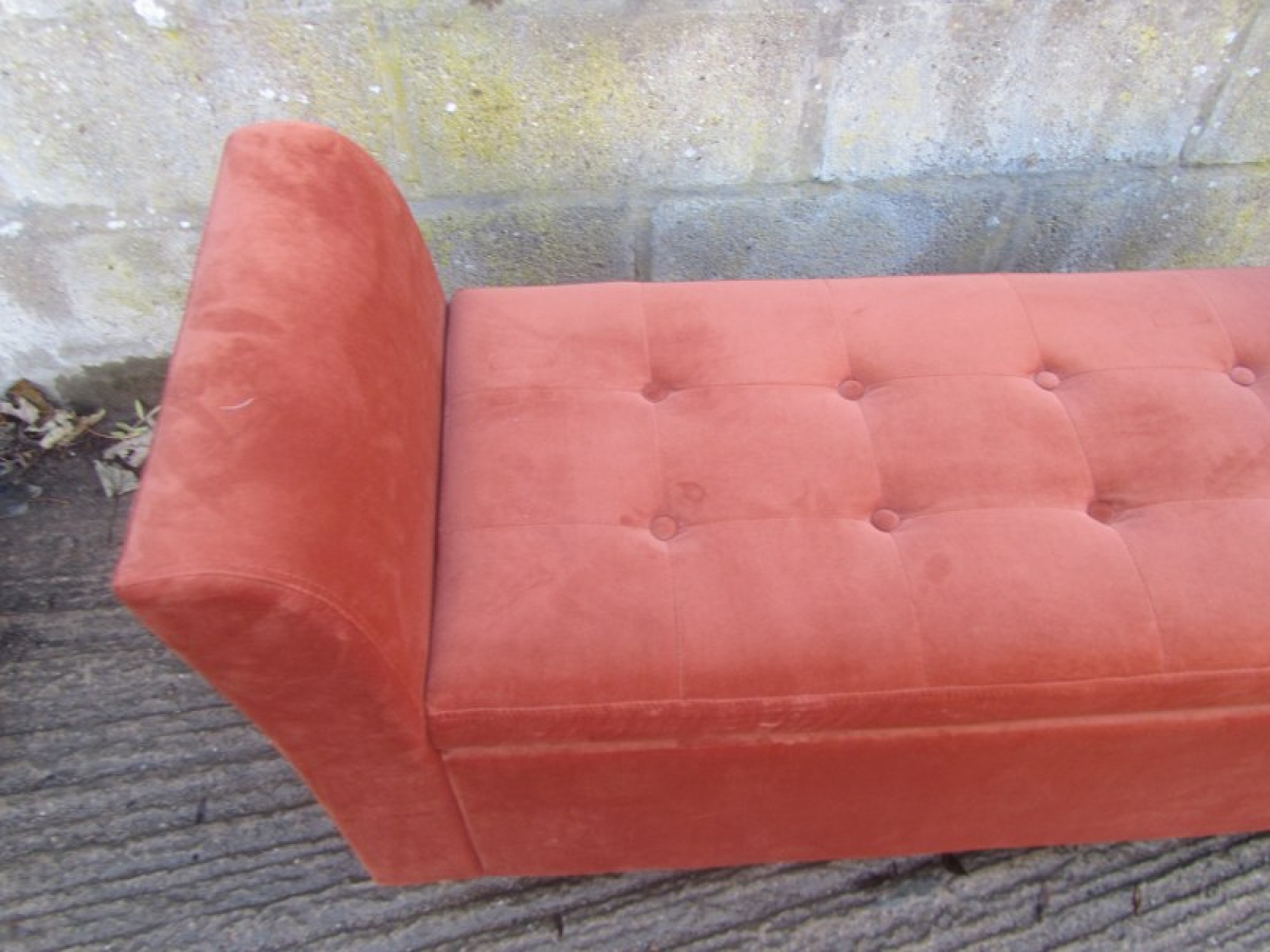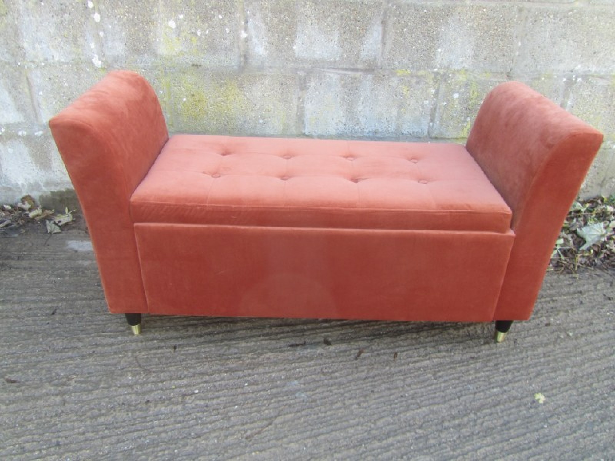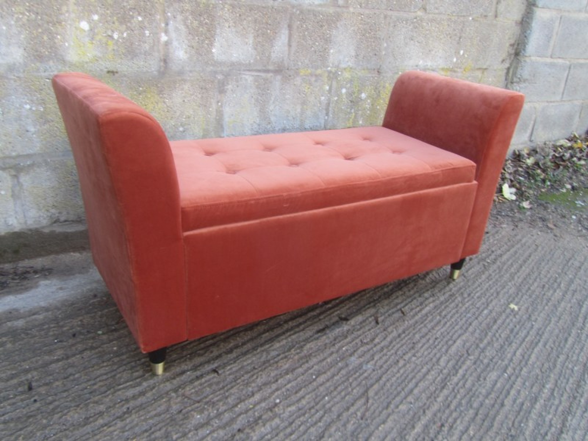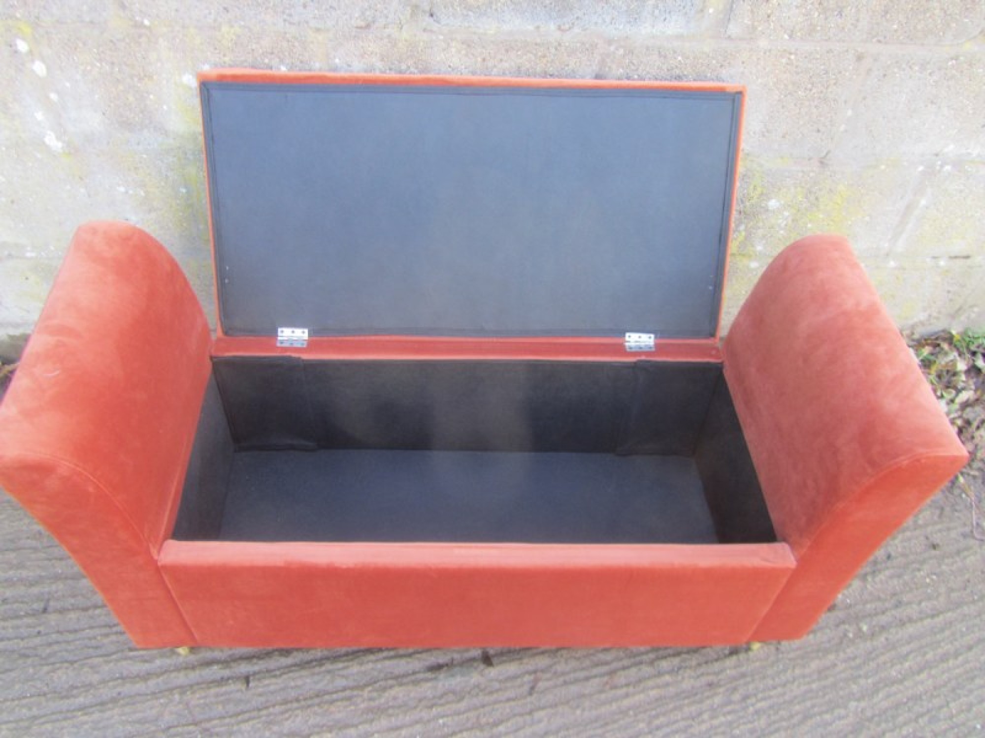 A SEAT WITH A PADDED TOP. THE LID LIFTS UP, STORAGE SPACE INSIDE. SEAT HEIGHT IS 46cm.