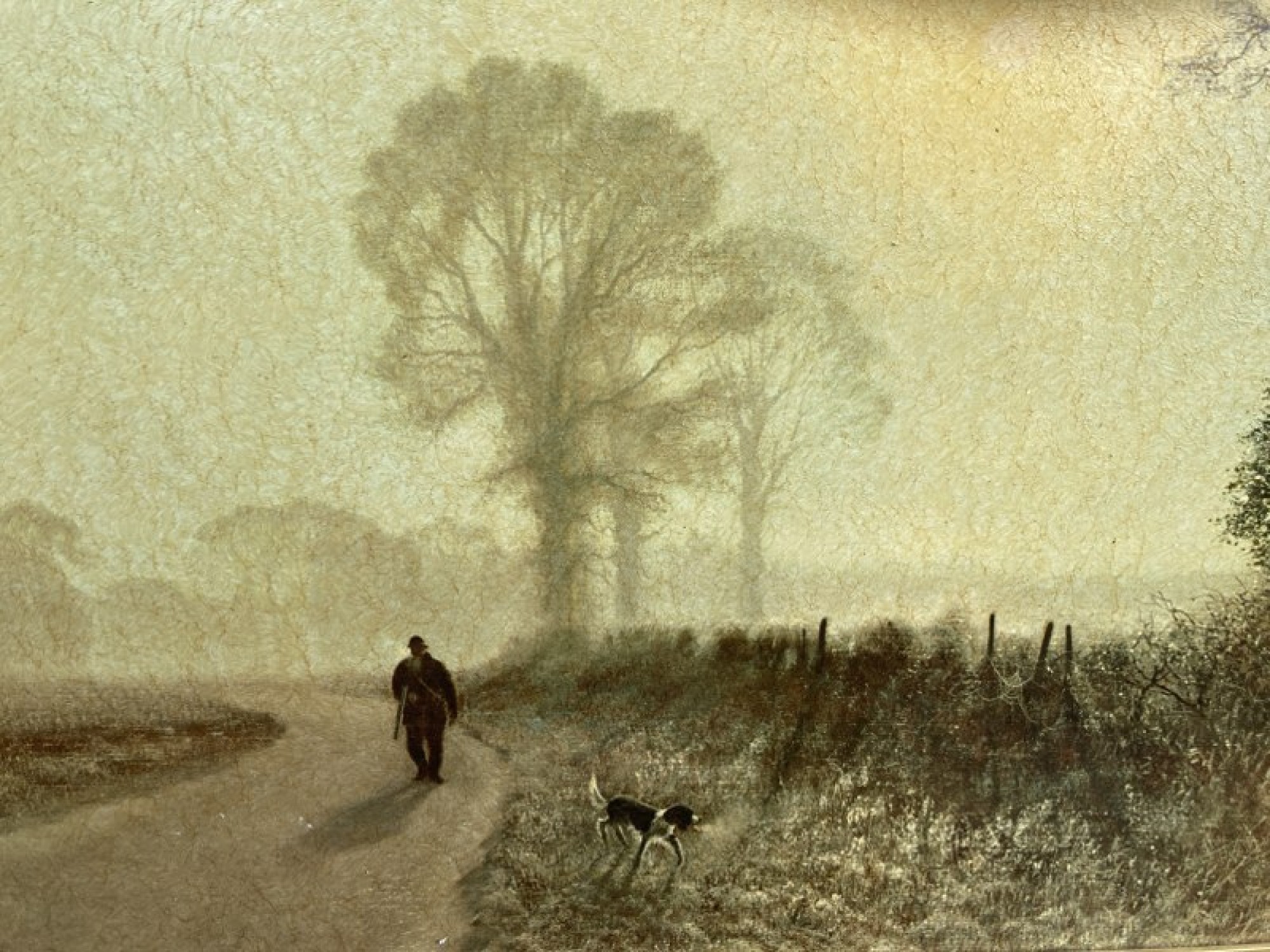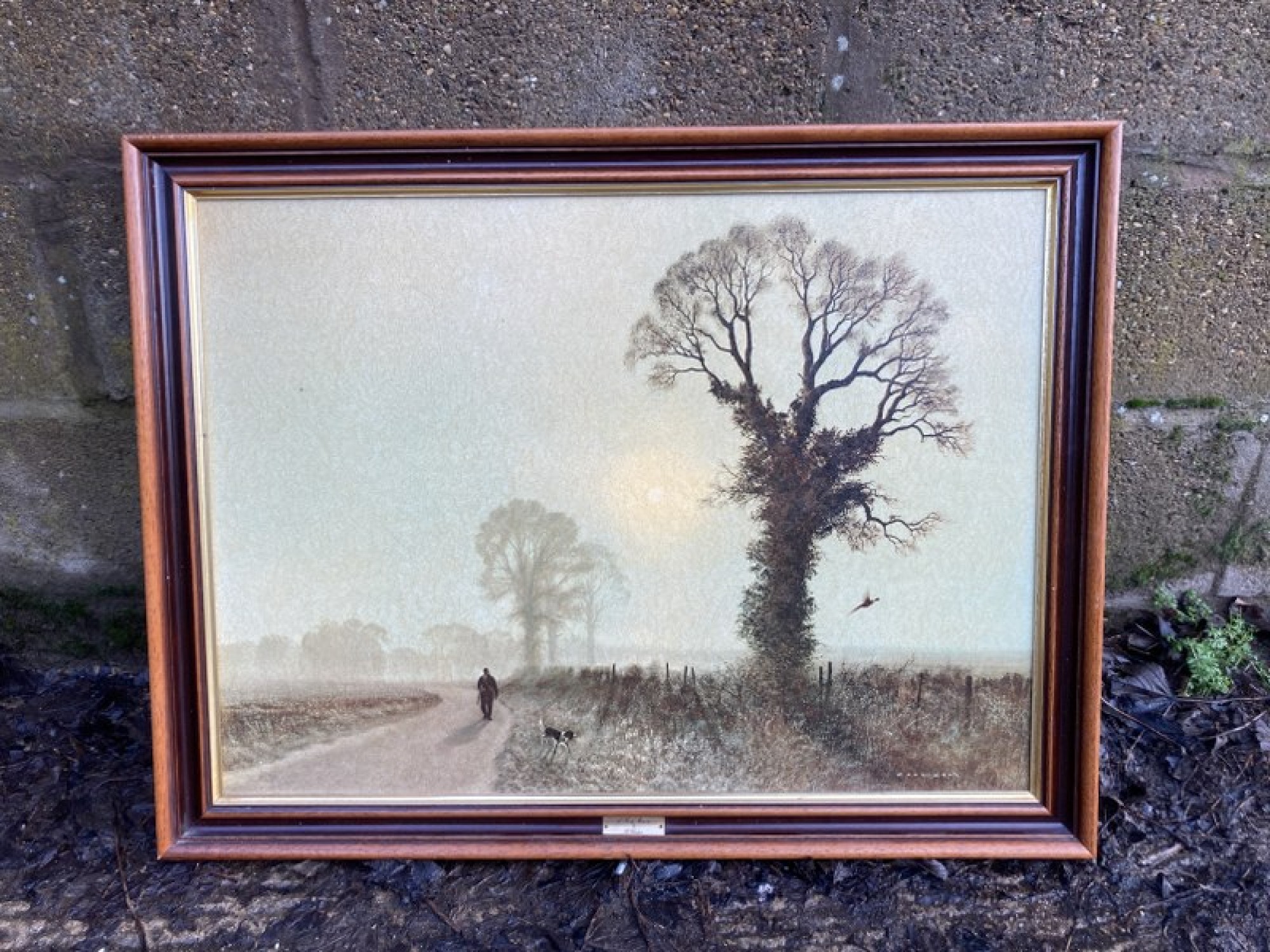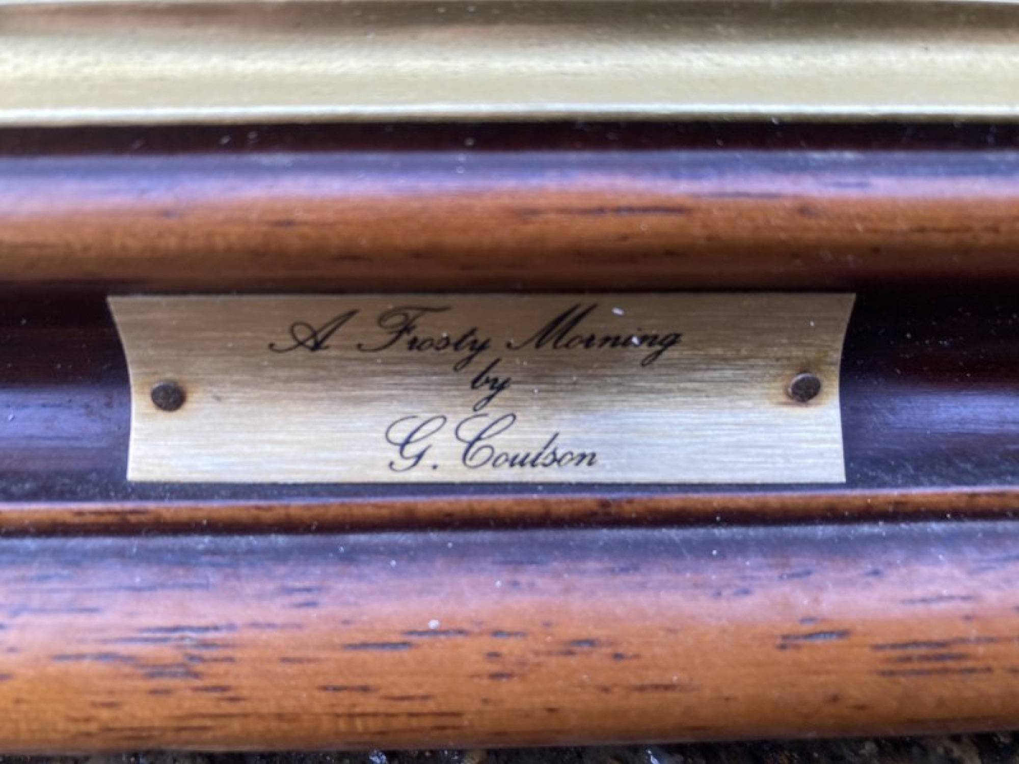 LARGE MODERN FRAMED PRINT, TITLED 'FROSTY MORNING' BY G COULSON. MADE TO LOOK LIKE AN OIL PAINTING, BUT IS A QUALITY PRINT.