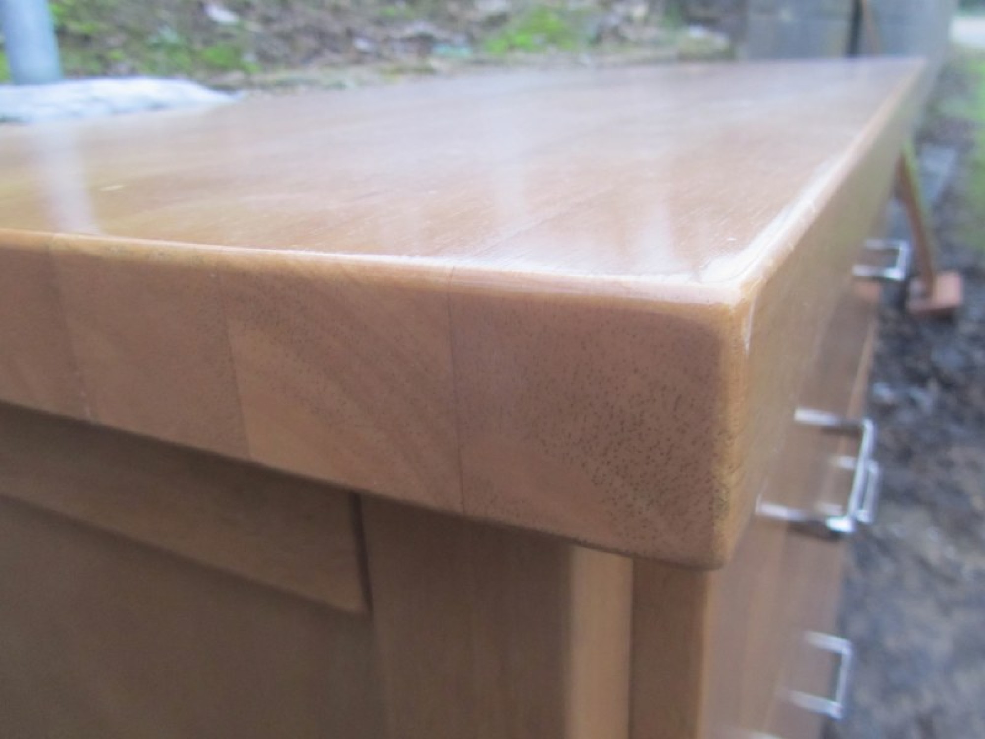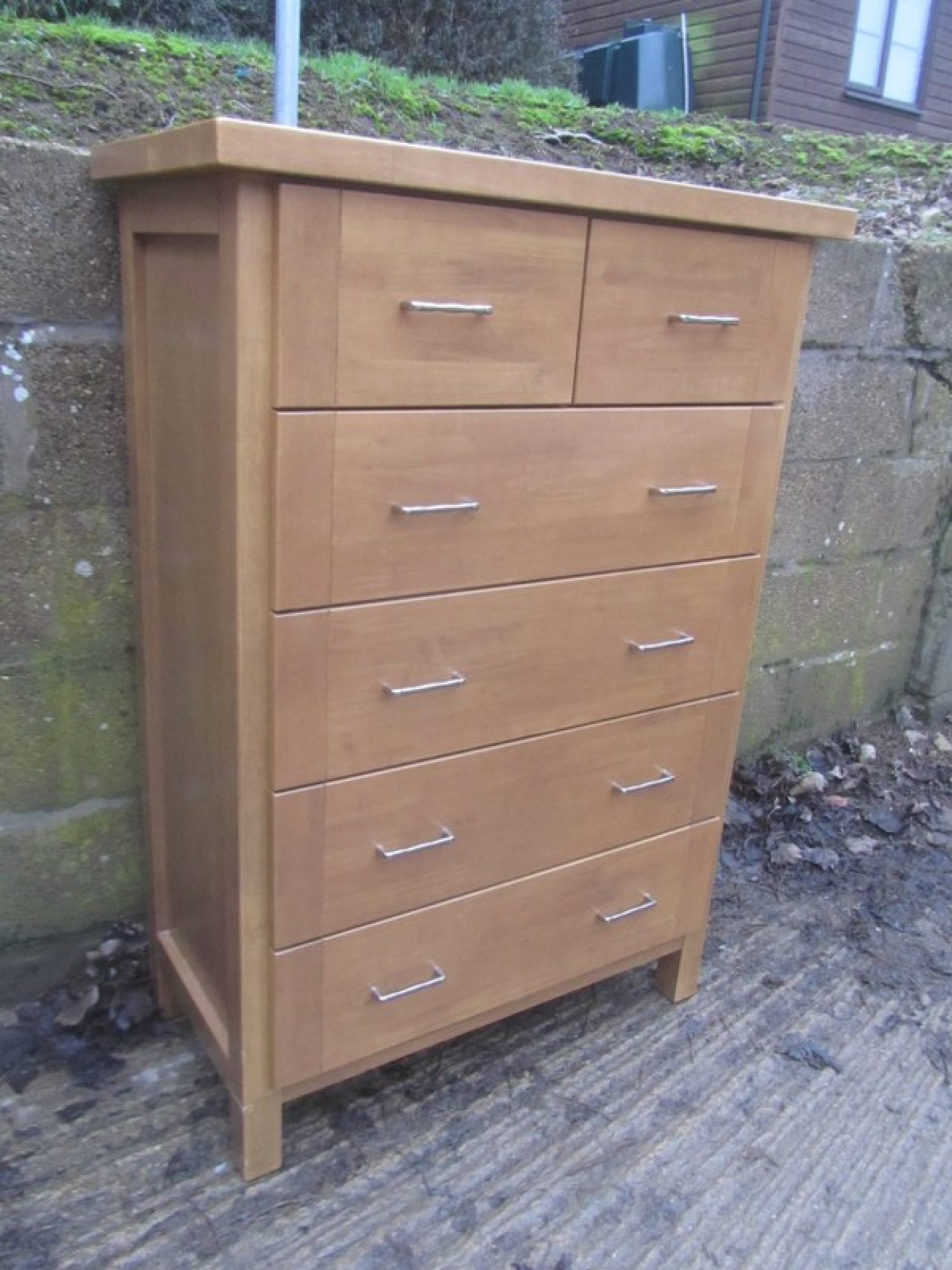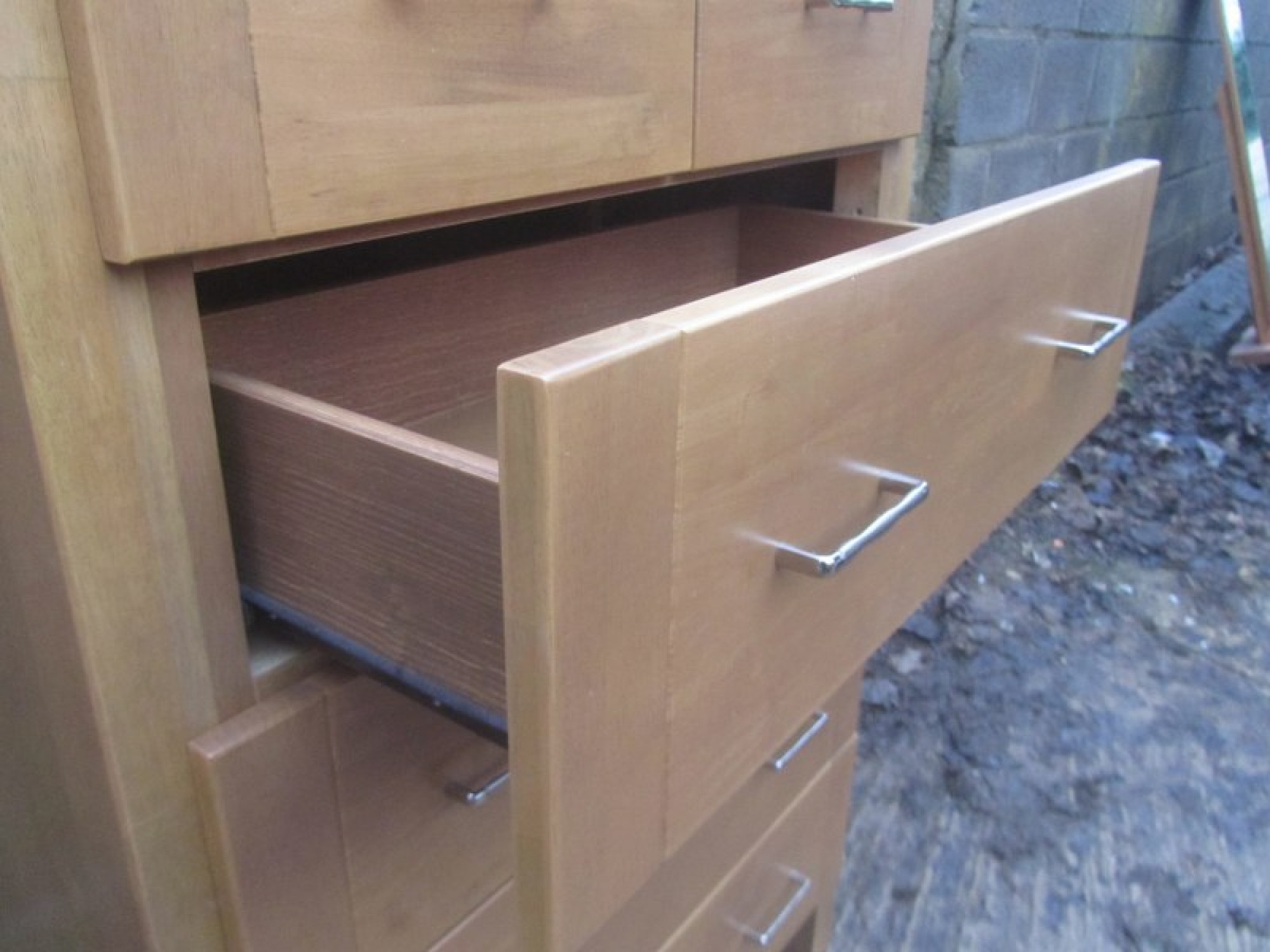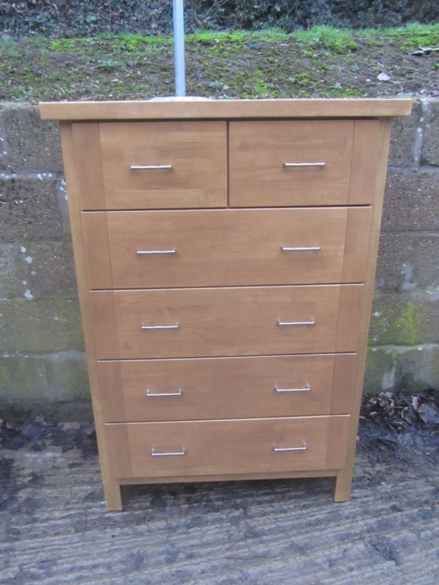A MODERN TALL BEECH CHEST OF DRAWERS. METAL HANDLES, GOOD QUALITY. PLENTY OF STORAGE SPACE.