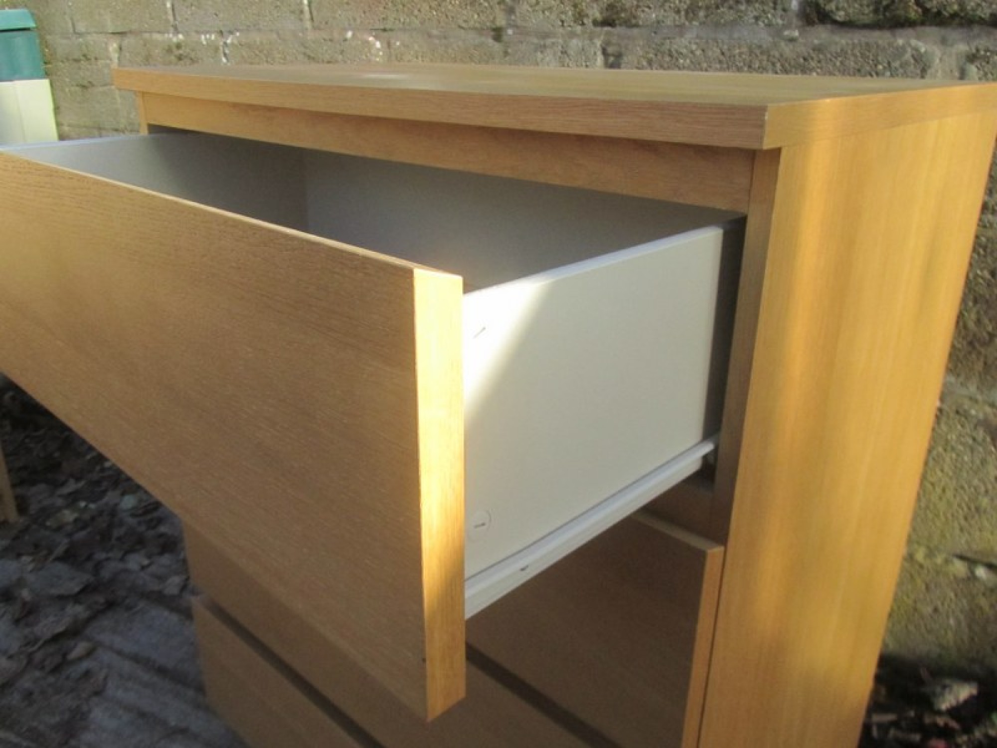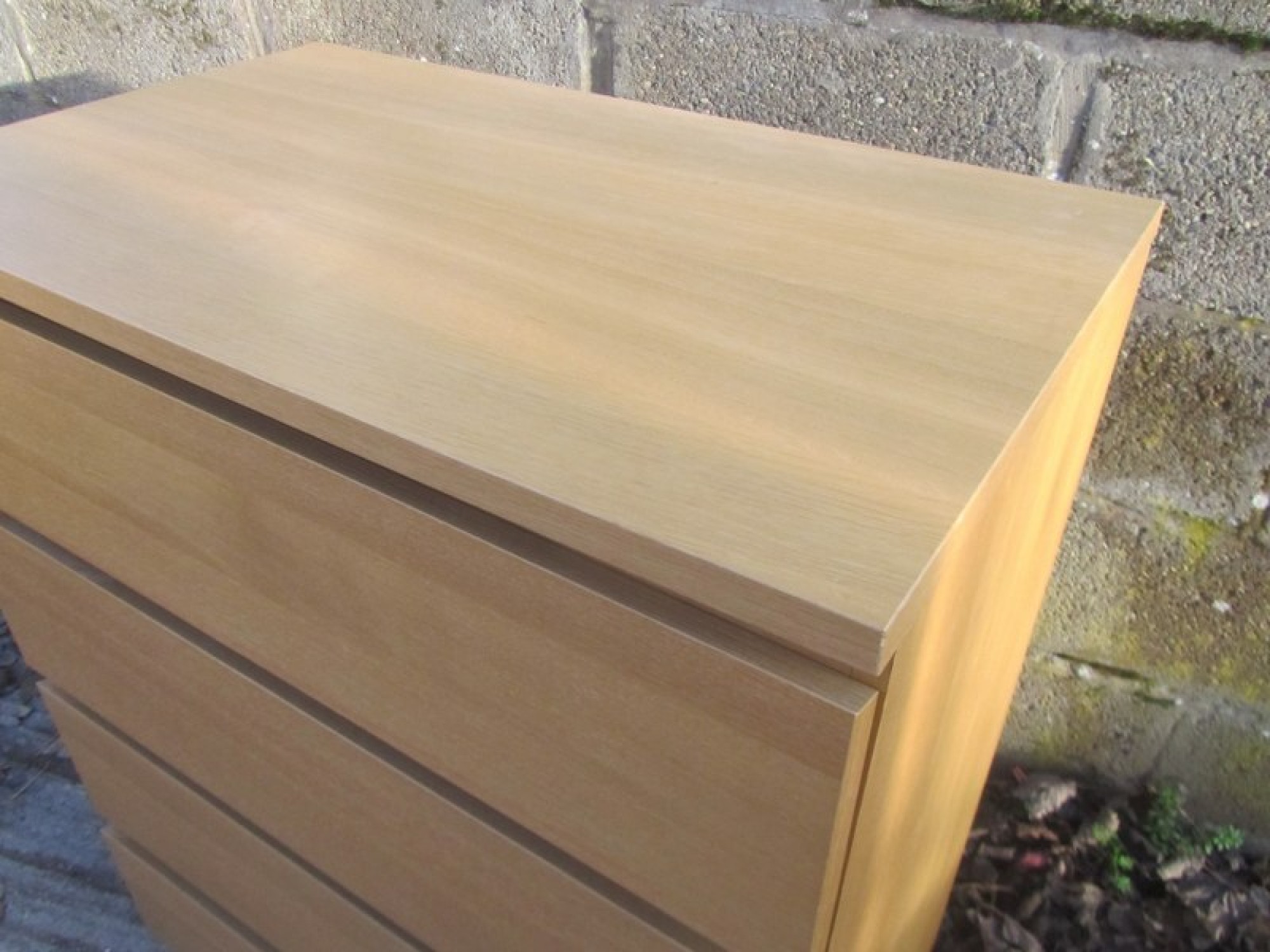 A MODERN CHEST OF DRAWERS. IT IS OAK VENEER AND IN GOOD CONDITION. LARGE, PLENTY OF STORAGE SPACE.
