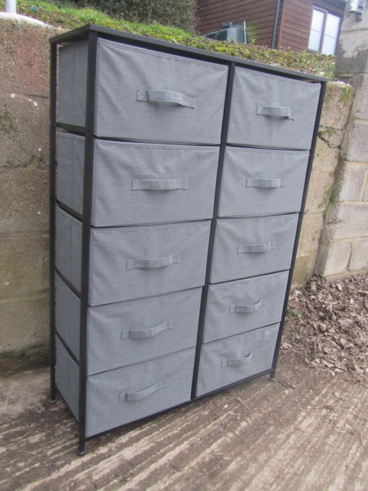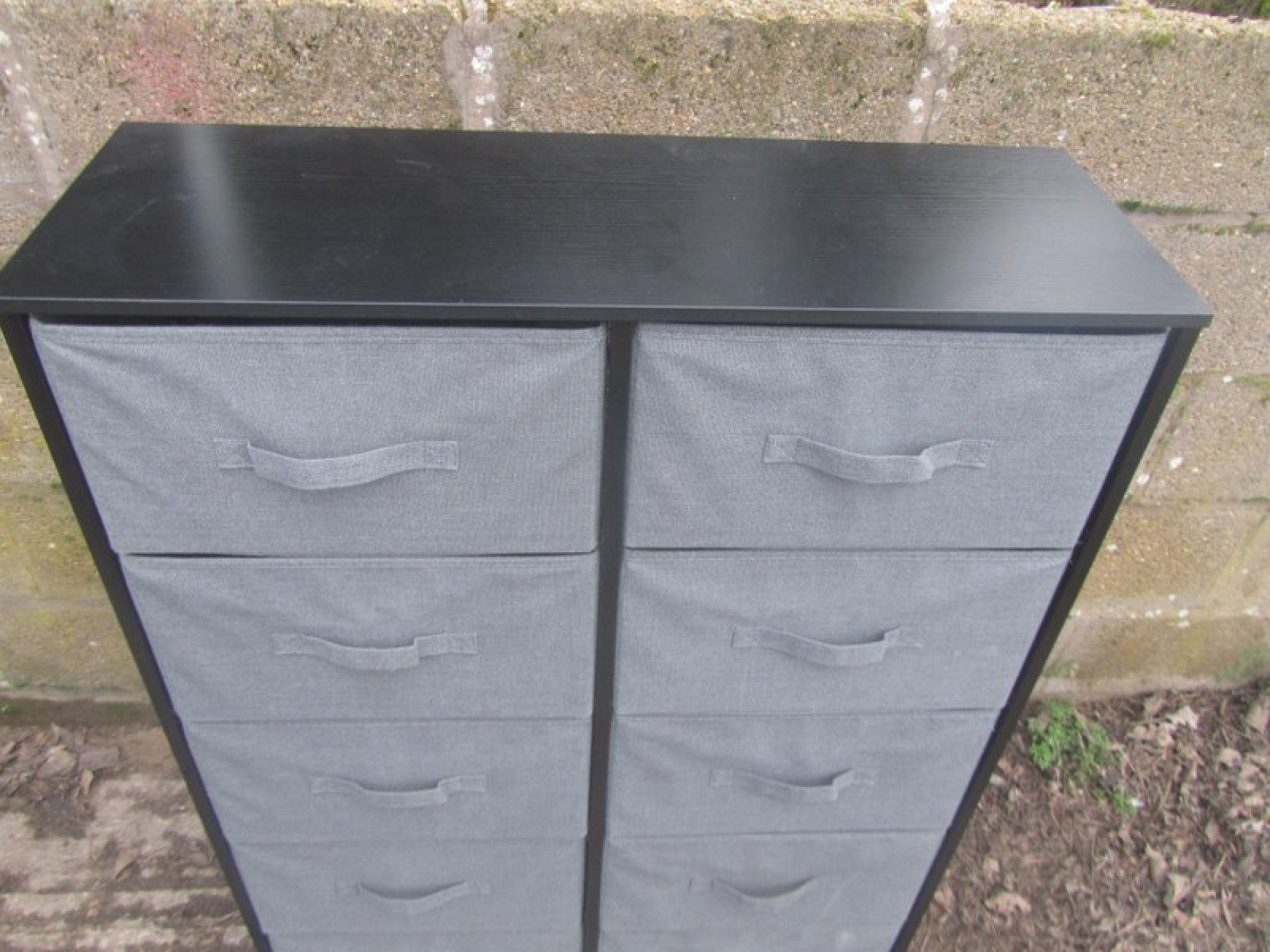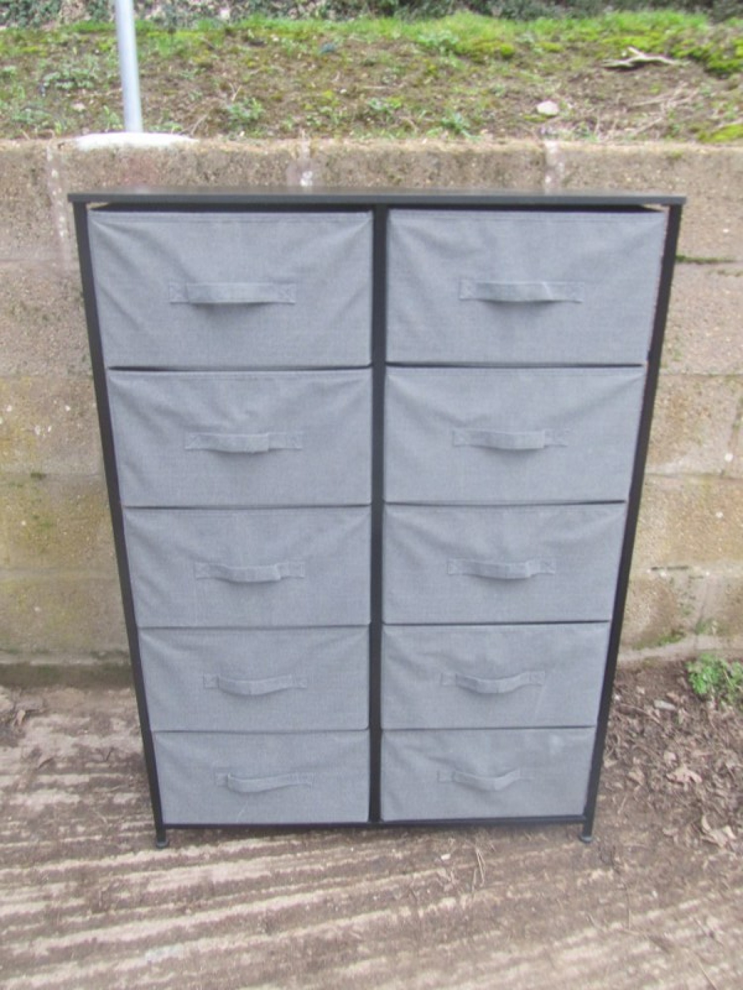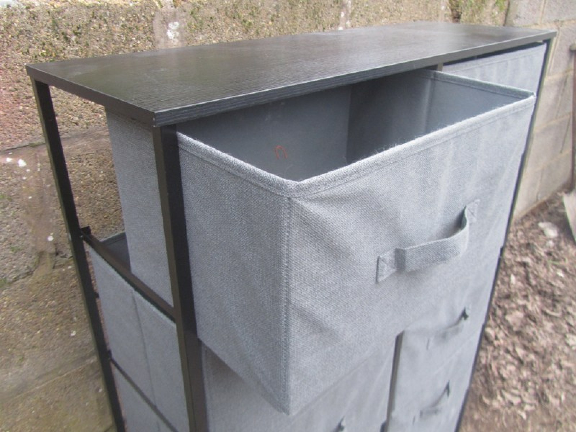 A MODERN CHEST OF DRAWERS. BLACK METAL FRAME. GREY MATERIAL DRAWERS. BLACK WOOD EFFECT TOP. NOT VERY DEEP, IDEAL FOR FOR SHOES.