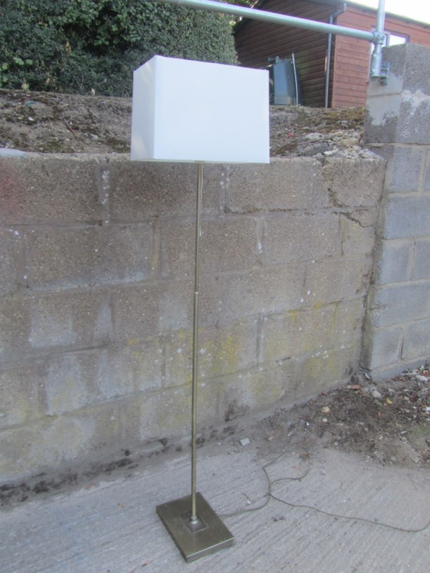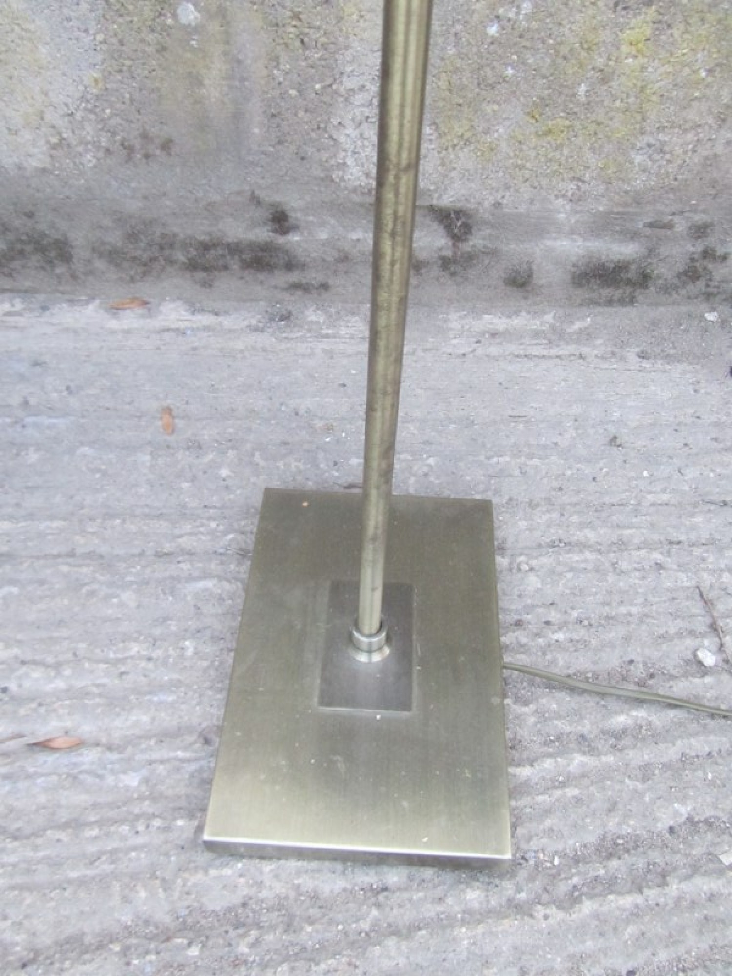 A MODERN LAMP, THE LAMP IS METAL WITH A SHADE AT THE TOP.
