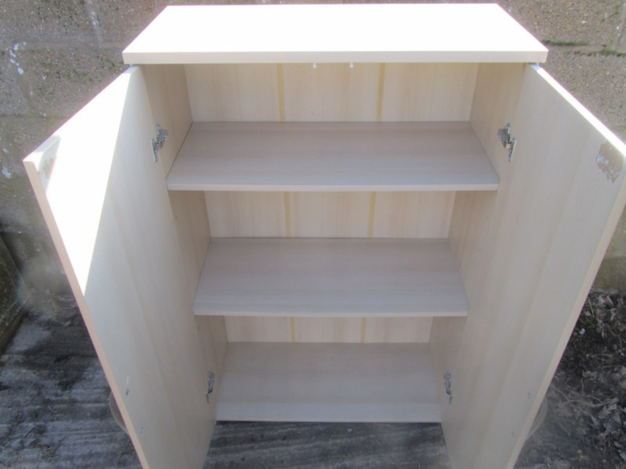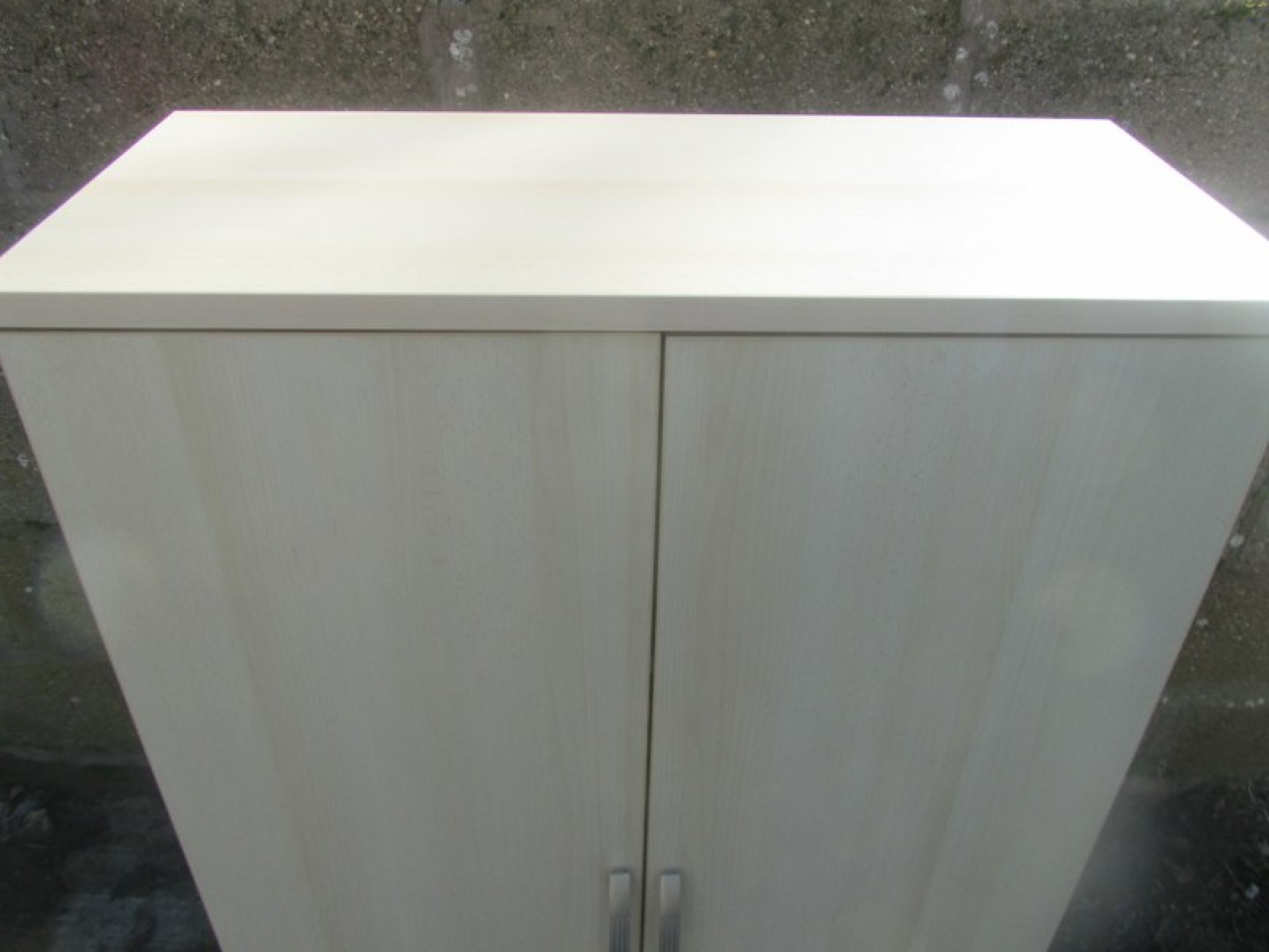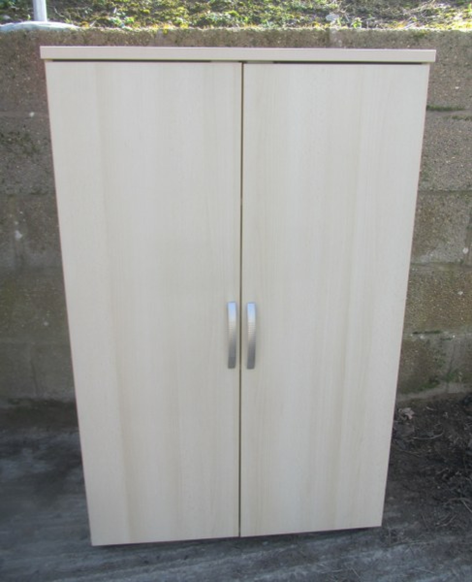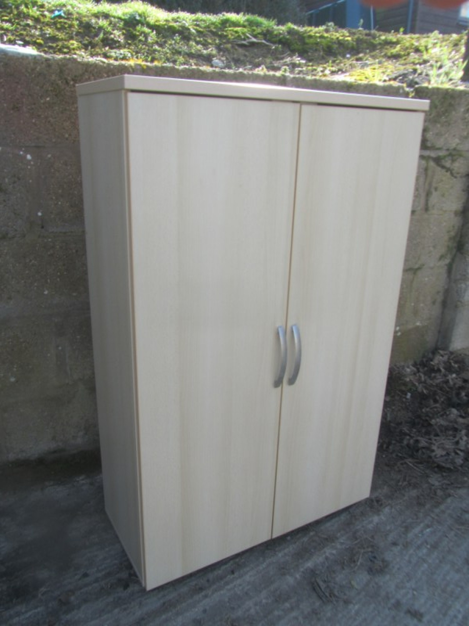 A BEECH EFFECT CABINET IN A MODERN MINIMALIST STYLE. 2 DOORS, SHELVES INSIDE.