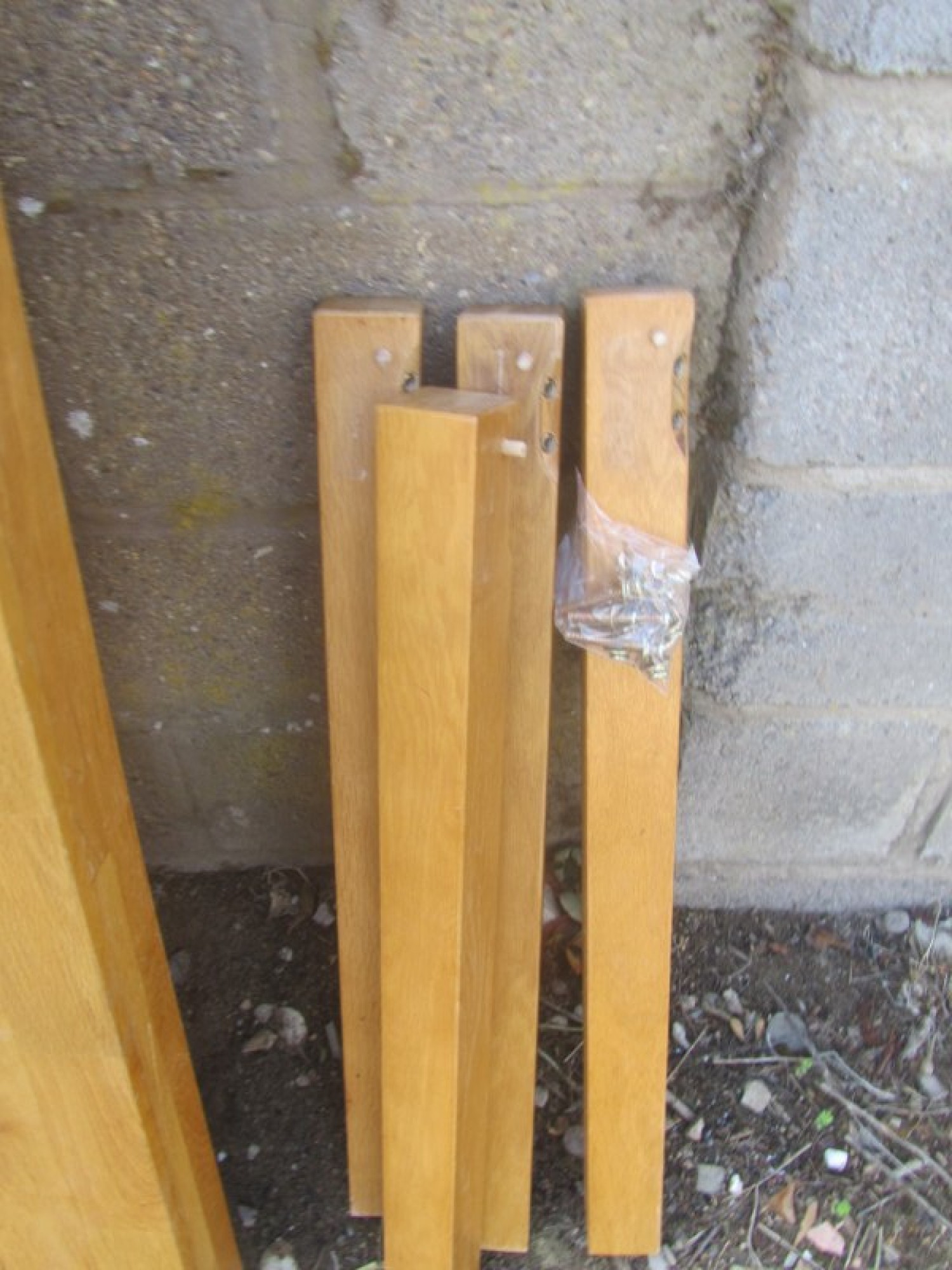 THE TABLE HAS 4 LEGS, THEY REMOVE FOR TRANSPORT. THE TABLE IS SOLID OAK, STRONG AND STURDY. IT SEATS 4 - 6 DINERS. THE TABLE TOP IS RECTANGULAR. SOME LIGHT MARKS AND WEAR.